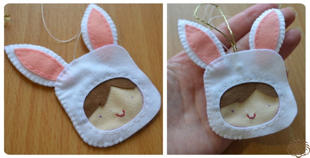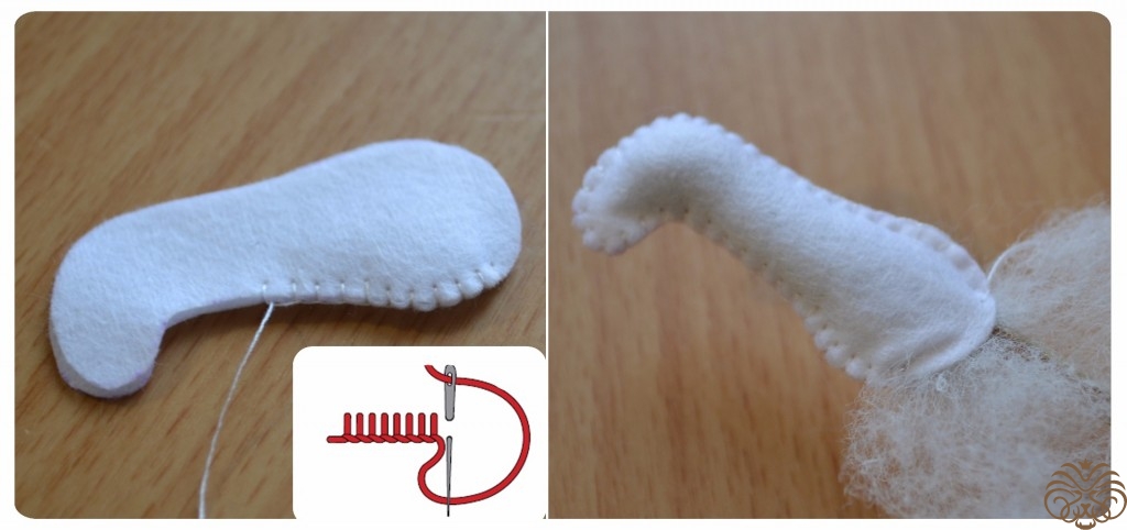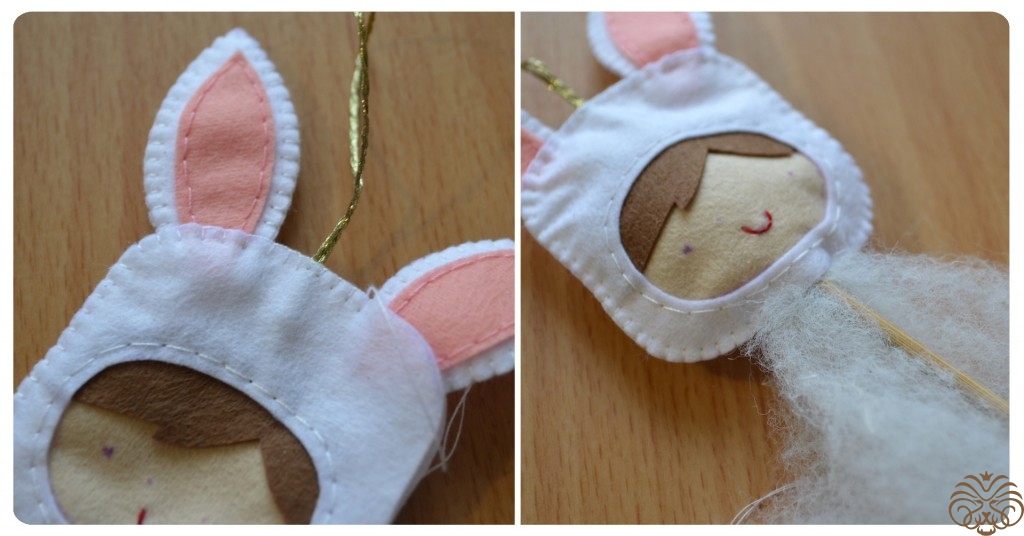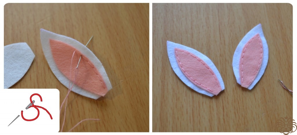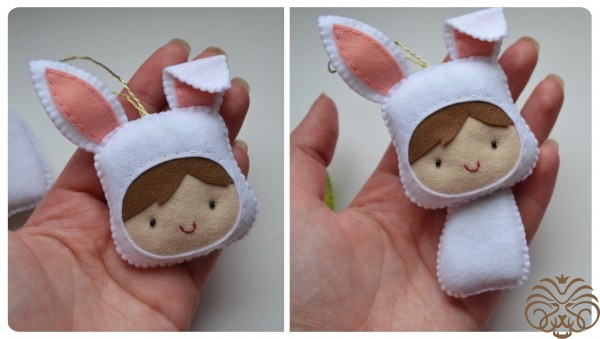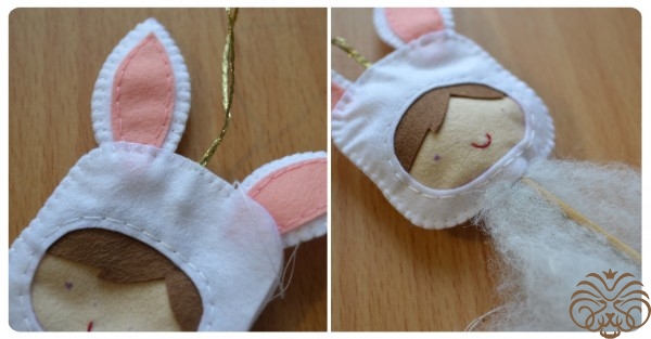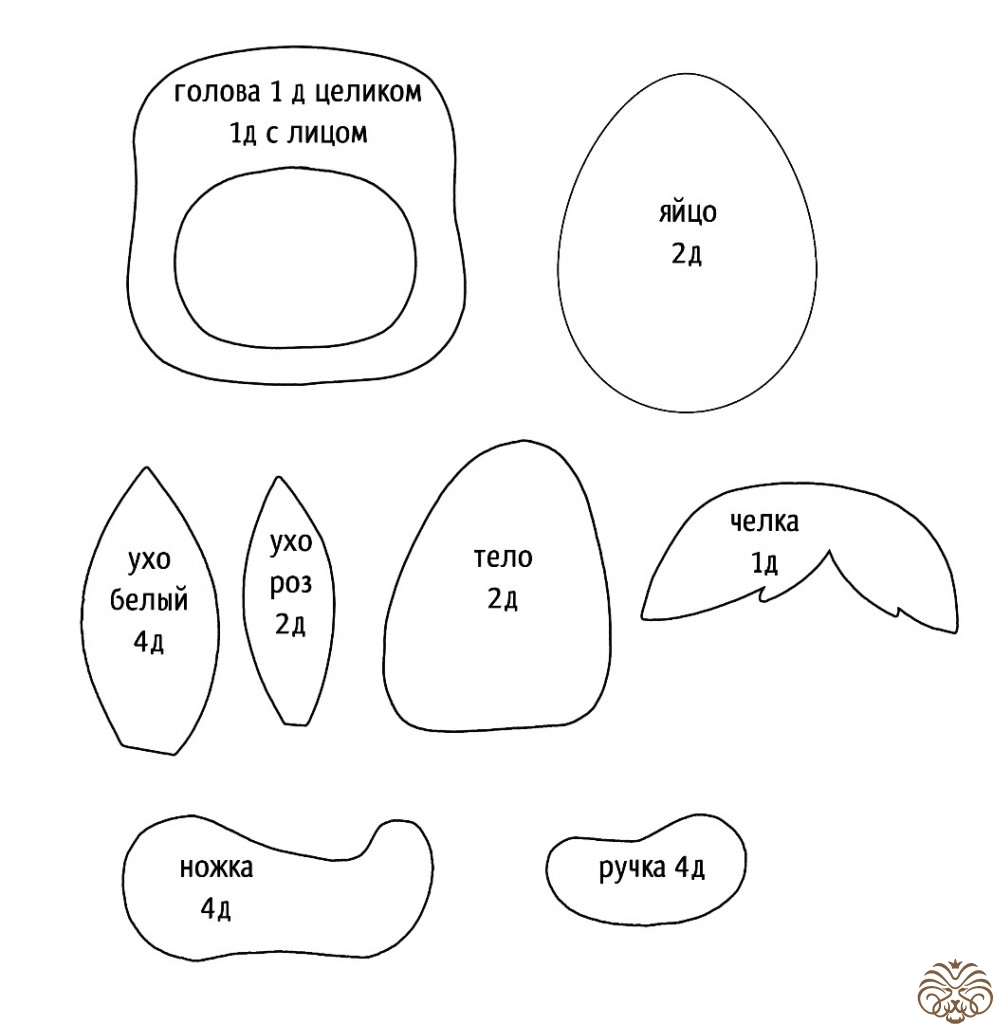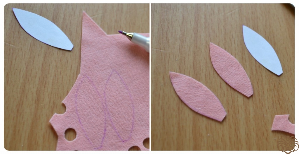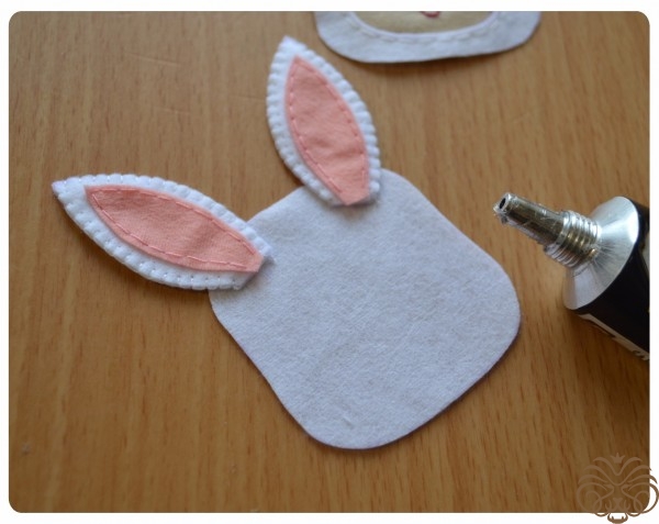 Разогреваем клеевой пистолет и начинаем склеивать детали. Одно ушко загнем. Для этого поставим каплю горячего клея по середине ушка на месте сгиба и согнем ушко. Подержим несколько секунд, чтобы клей закрепился. Отпускаем. Теперь приклеиваем голову к телу, нанеся немного клея на верхний края тельца, а сверху прикладываем голову
