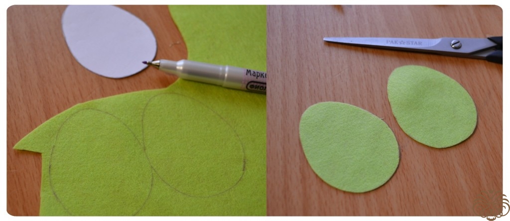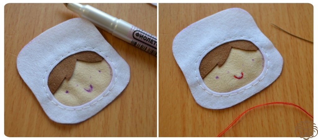 3. Инструменты и прочее: самоисчезающий маркер, клей Момент Кристалл, иголка, синтепон, декоративные мелкие пуговицы, помпончик, клеевой пистолет, ножницы, черный мелкий бисер, бантик, румяна, дырокол по фетру, мулине золотого цвета