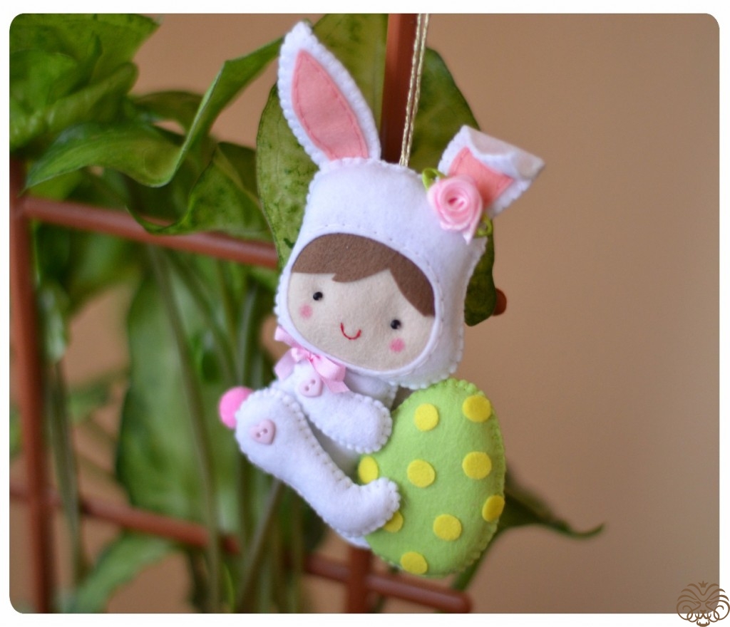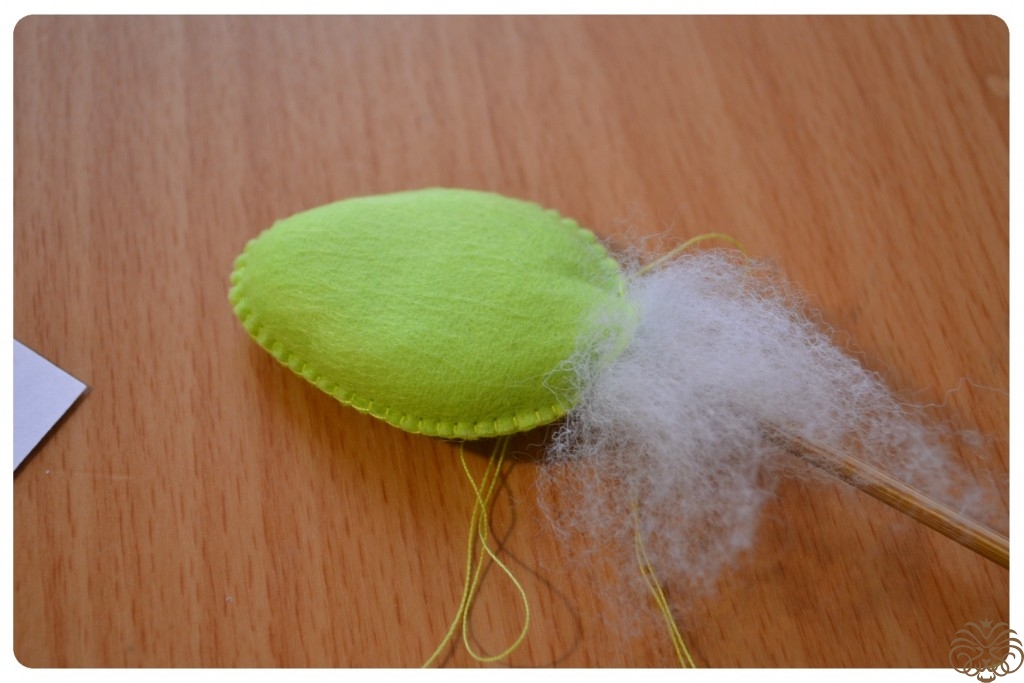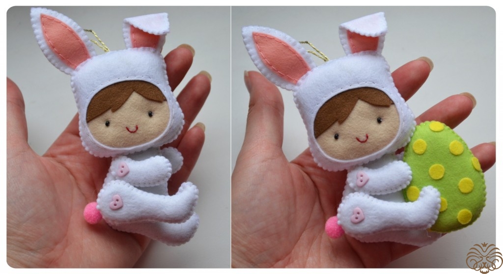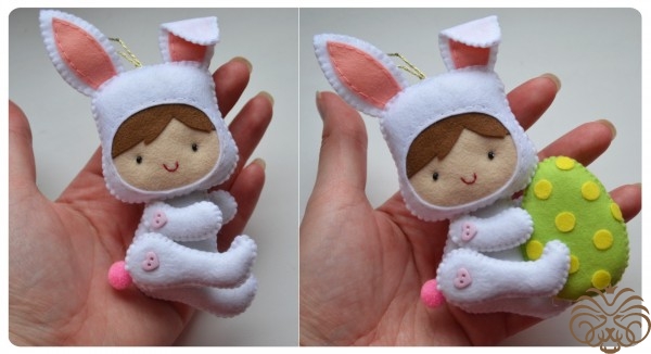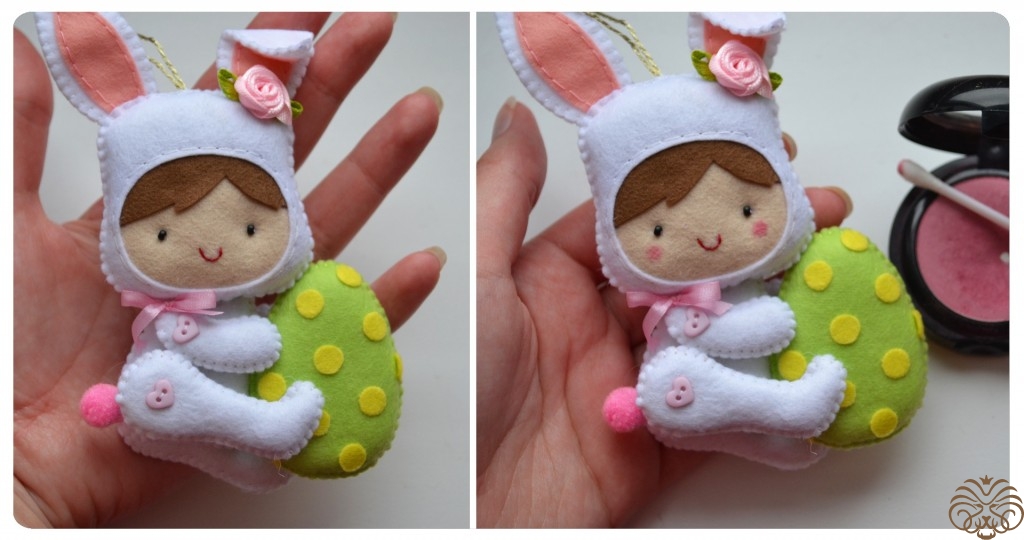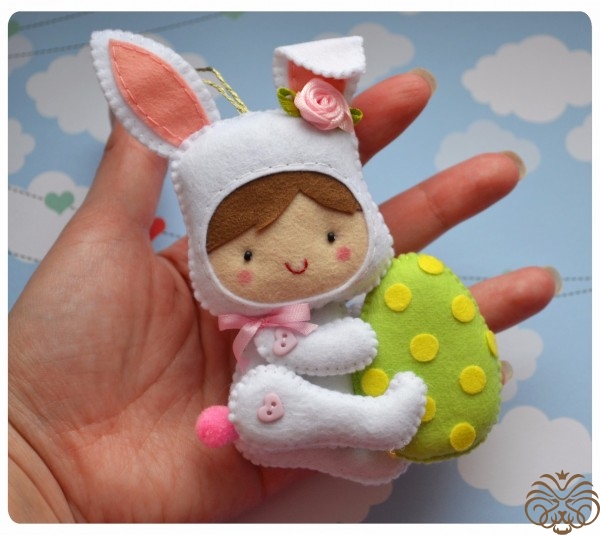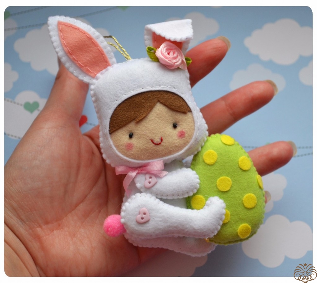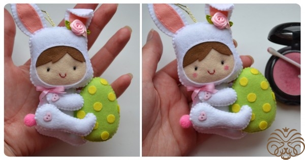 Теперь давайте украсим пасхальной яйцо. Его можно украсить цветочками или полосками. Я решила свое украсить горошком. Дыроколом по фетру вырубаем мелкие кругляшки из желтого фетра. Если у вас нет такого дырокола, то воспользуйтесь маникюрными ножницами. Затем приклеиваем горошек на яйцо клеем Момент Кристалл в хаотичном порядке. Не забудьте украсить яйцо и с задней стороны