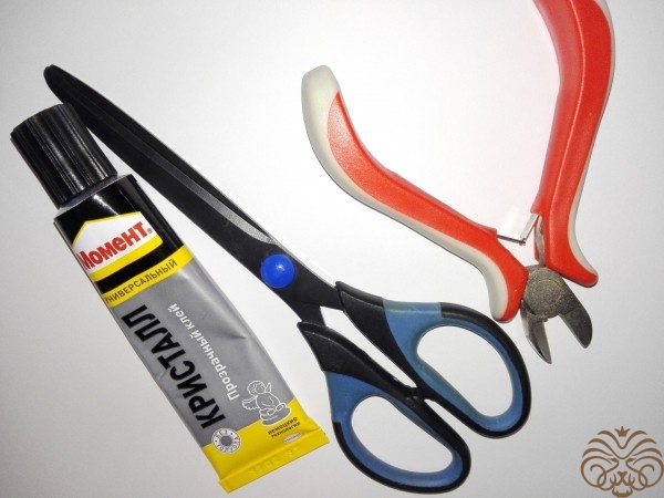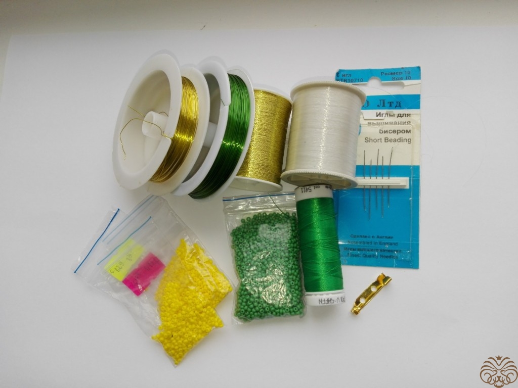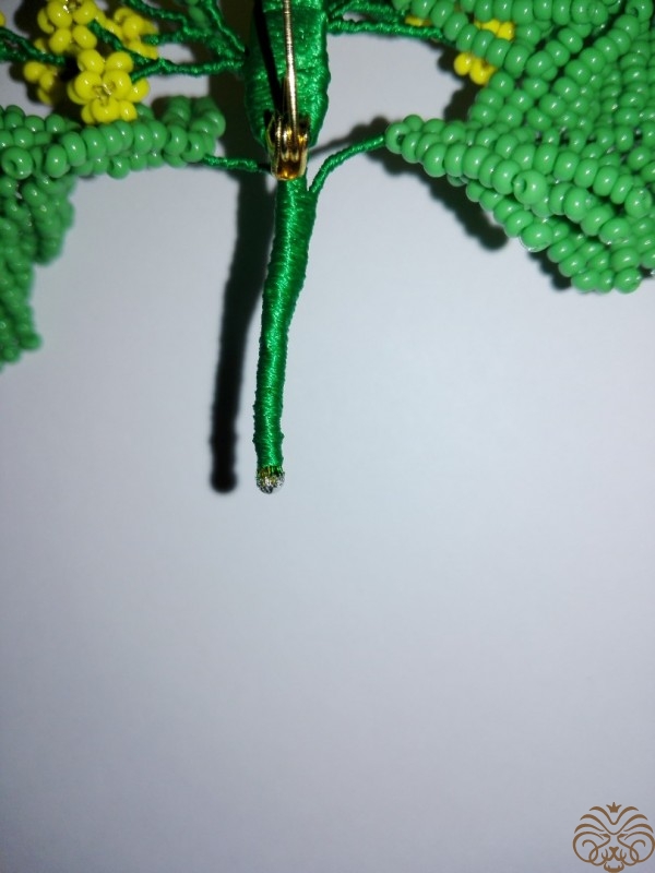 Собираем веточку и не забываем прикрепить основу для броши. Нужно учесть, что ее нельзя прикреплять в самом низу броши, иначе брошь будет наклоняться из-за тяжести бисера. Для того, чтобы основа не порезала ниточку, обмотала ее небольшим кусочком флористической ленты. Нить закрепляем, ненужные концы проволоки и нитки отрезаем бокорезами и ножницами. На кончик капаем немного прозрачного клей, который не даст распускаться нити внизу броши и предохранит от повреждений об острые концы проволоки.