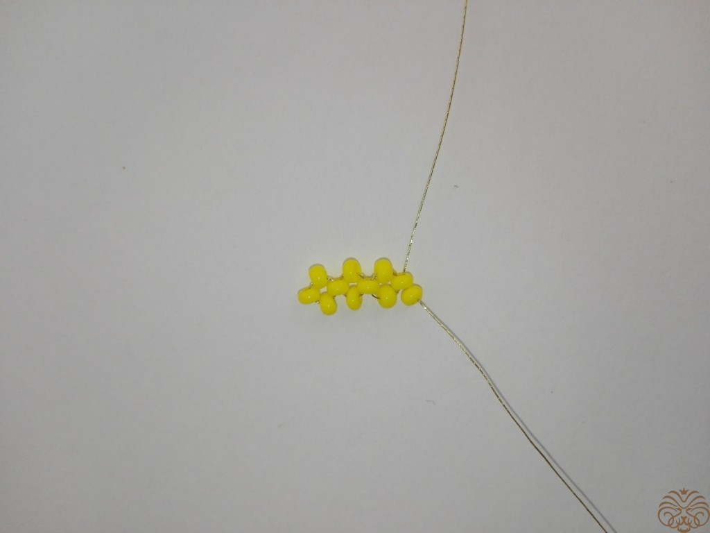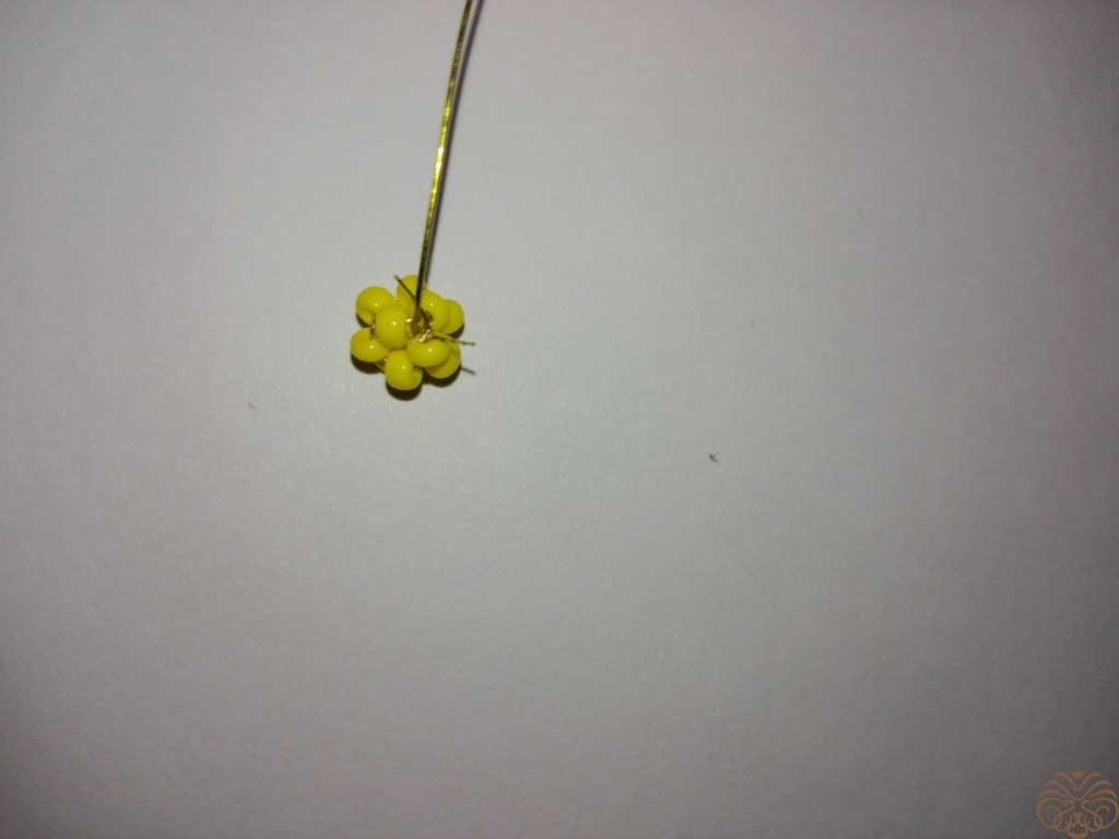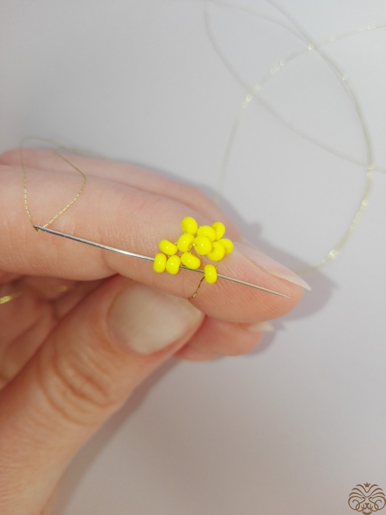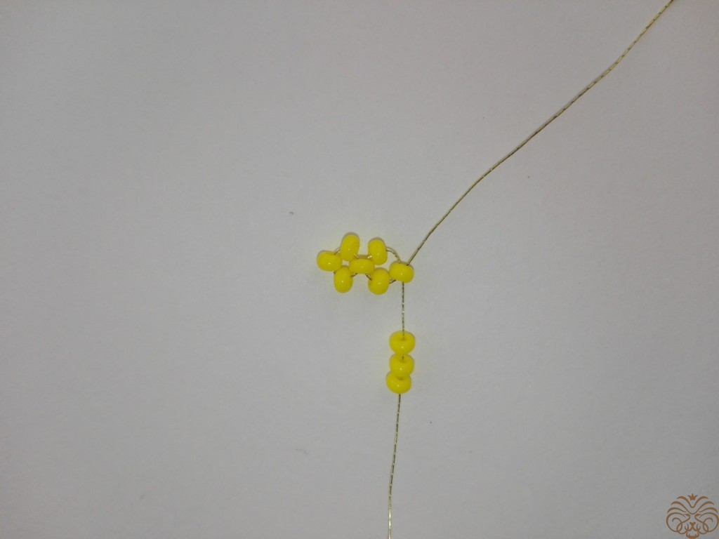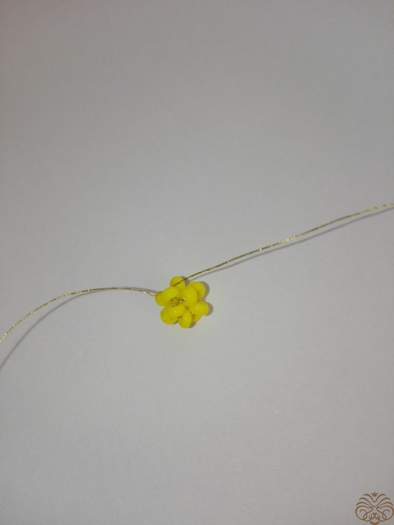 Начинаем плетение с шариков-цветочков. На желтую нить (для таких мелочей использую нить люрекс) набираем 9 бисеринок, проходим через шестую и затягиваем. Получается крестик. Набираем одну бисеринку, проходим через четвертую и затягиваем. Снова набираем одну, проходим через вторую, затягиваем. Получаем 3 крестика. Набираем одну бисеринку, проходим через восьмую бисеринку (начало первого крестика) и через первую, затягиваем. Получаем мягкий шарик. Закрепляем его, пройдя через края крестиков с обеих сторон. Делаем узелок. Лишнюю нить отрезаем (всегда оставляю небольшой кусочек нити и затем прячу его под обмоткой).