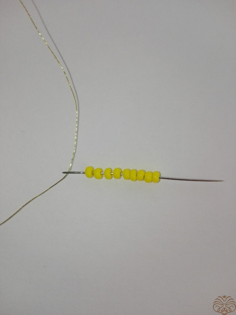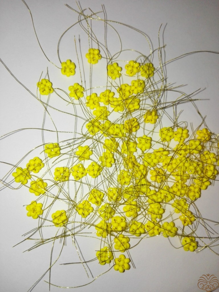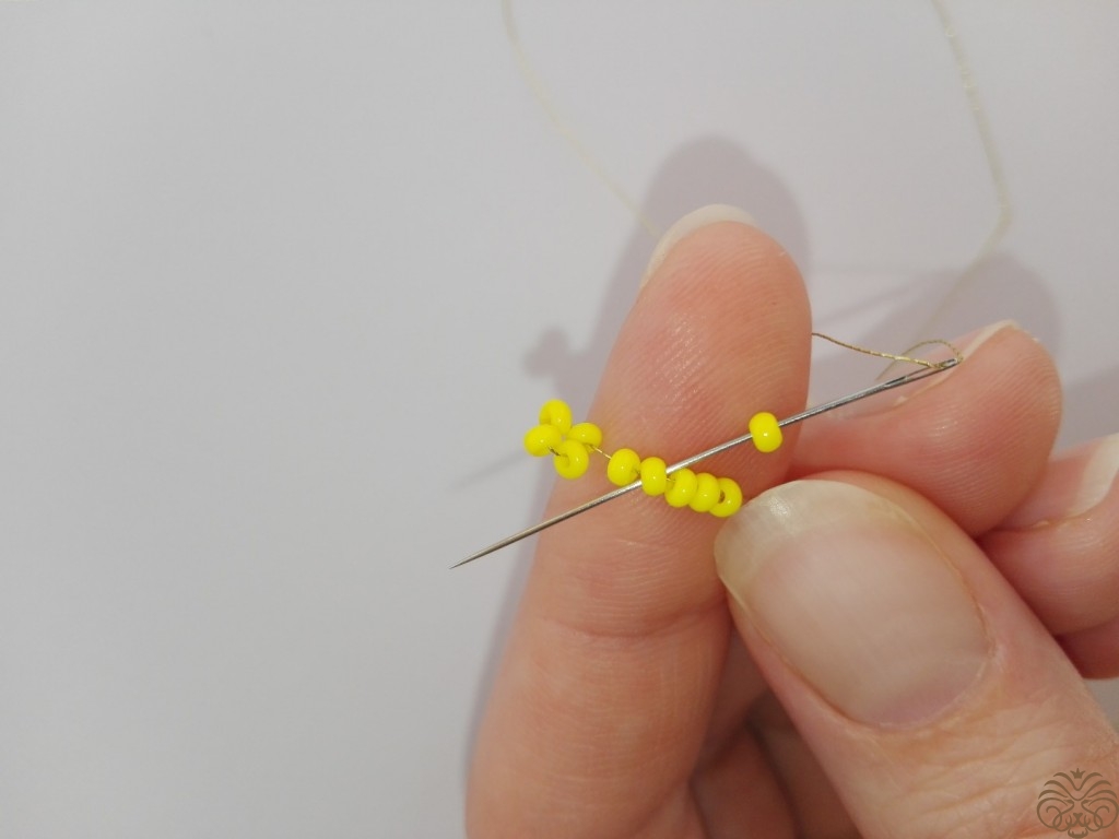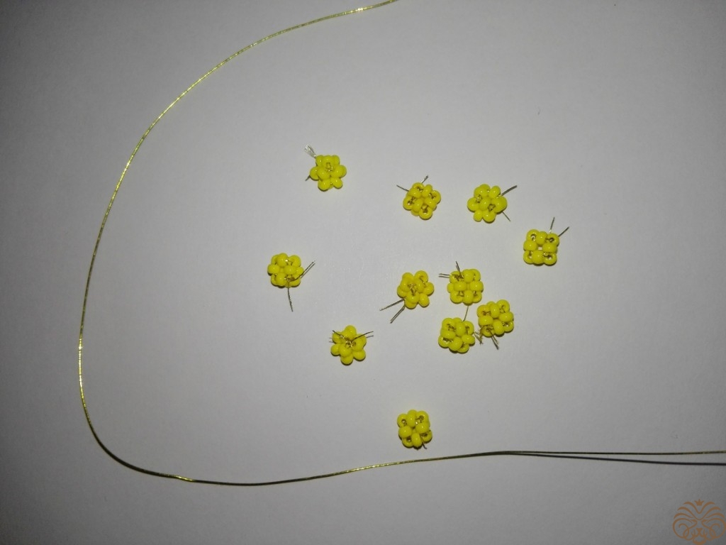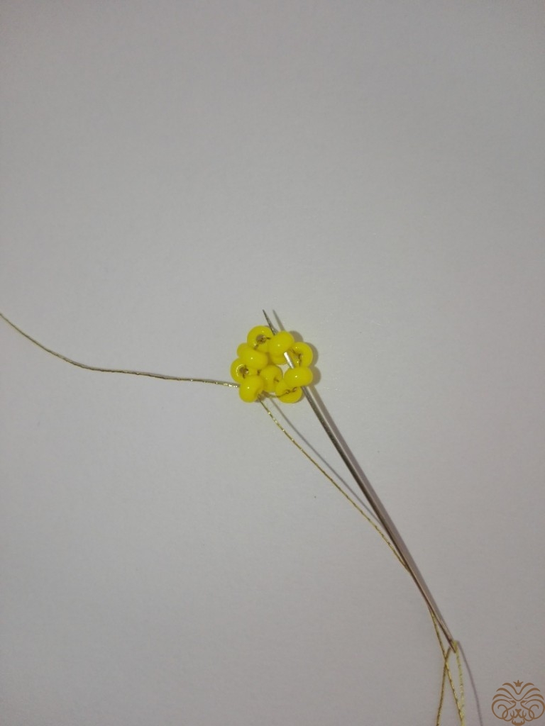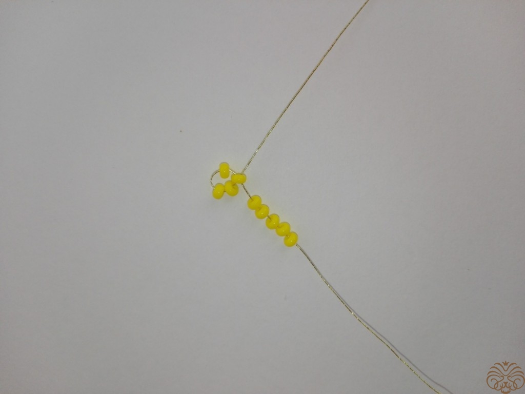 Начинаем плетение с шариков-цветочков. На желтую нить (для таких мелочей использую нить люрекс) набираем 9 бисеринок, проходим через шестую и затягиваем. Получается крестик. Набираем одну бисеринку, проходим через четвертую и затягиваем. Снова набираем одну, проходим через вторую, затягиваем. Получаем 3 крестика. Набираем одну бисеринку, проходим через восьмую бисеринку (начало первого крестика) и через первую, затягиваем. Получаем мягкий шарик. Закрепляем его, пройдя через края крестиков с обеих сторон. Делаем узелок. Лишнюю нить отрезаем (всегда оставляю небольшой кусочек нити и затем прячу его под обмоткой).