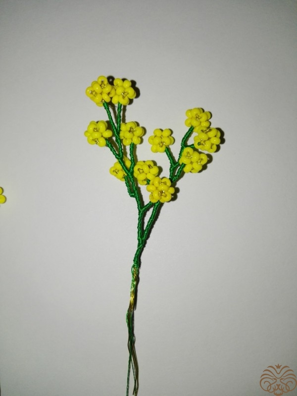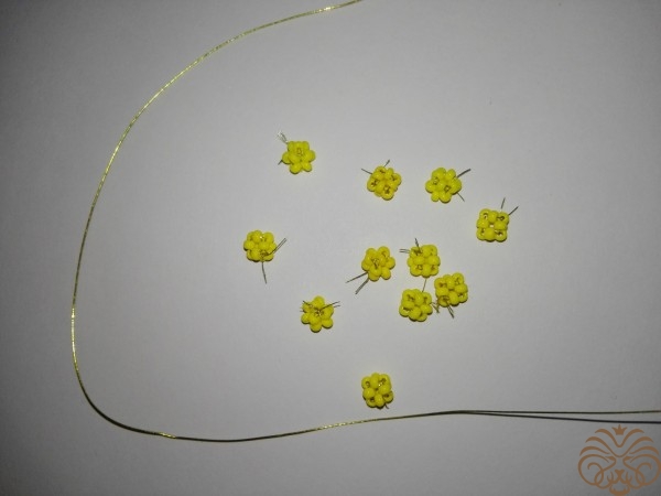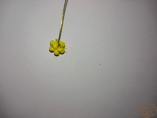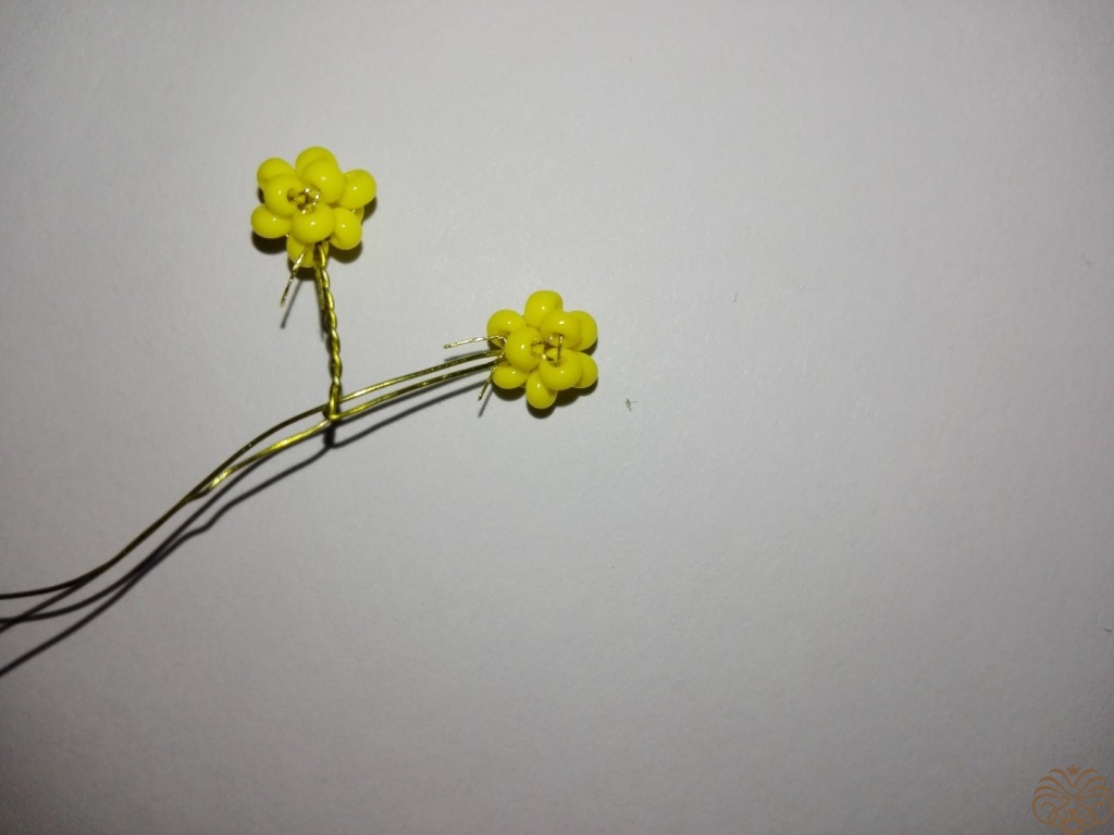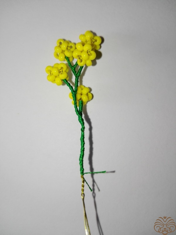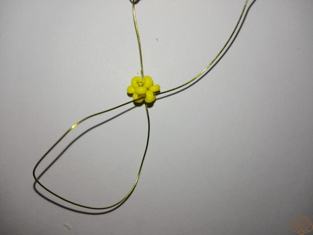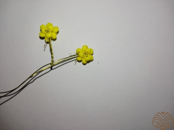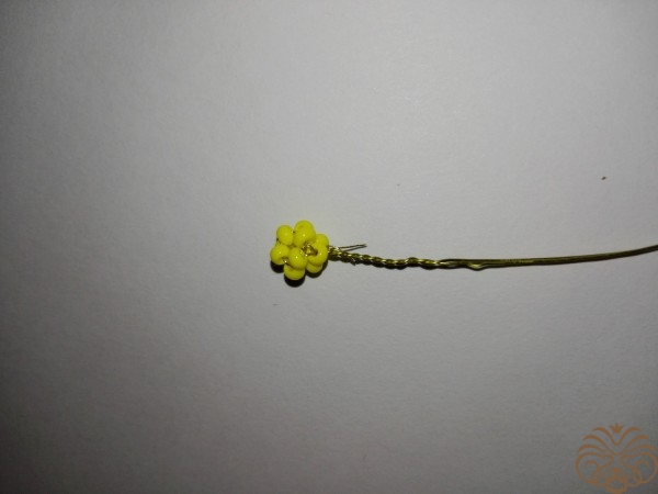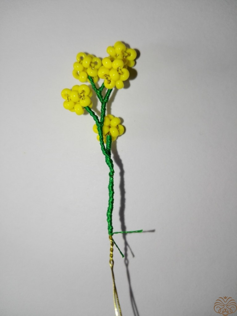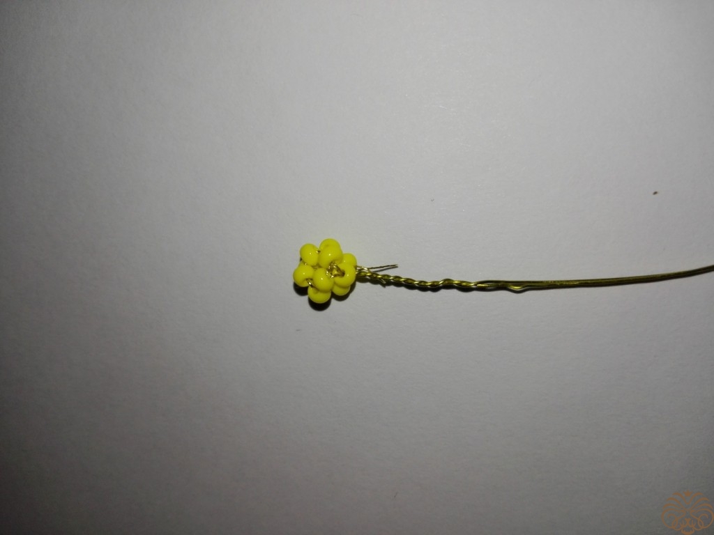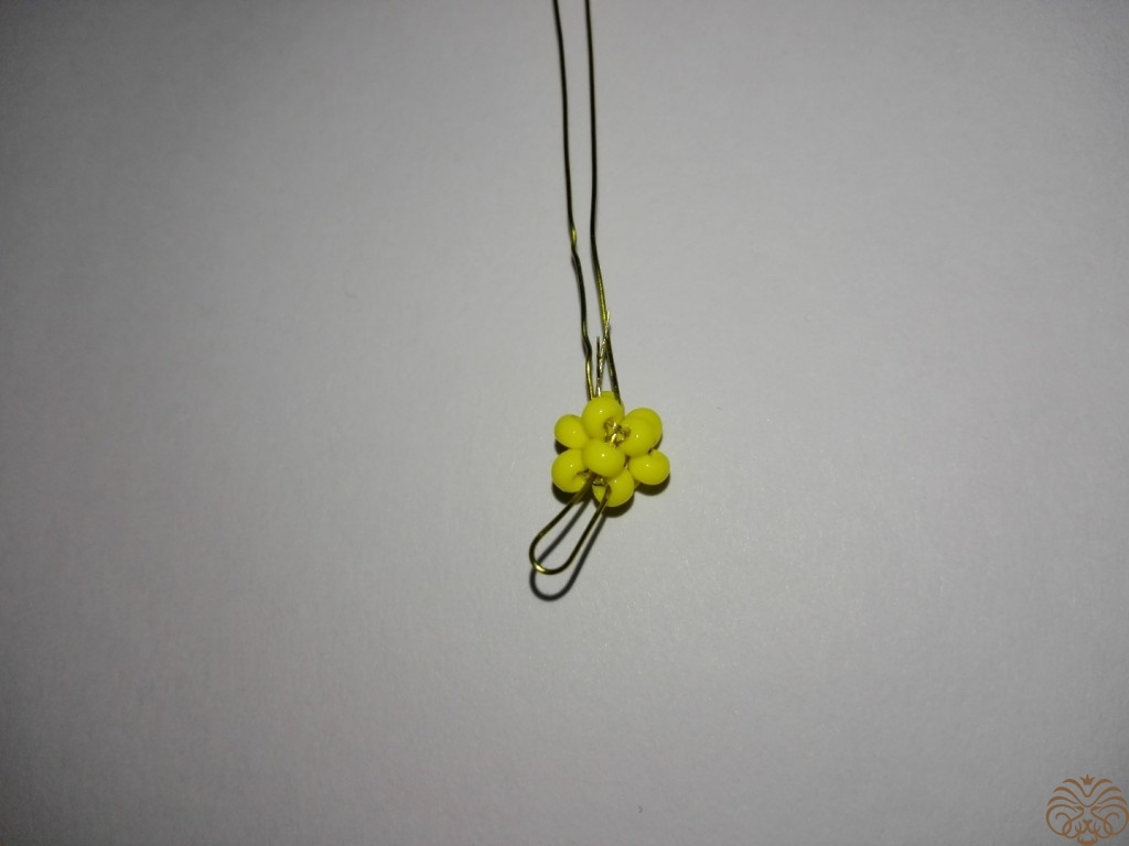 Делаем веточки. Для этого берем кусок желтой проволоки длиной около 30 см (можно и больше), надеваем шарик на проволоку около узелка, проходим через одну из бисеринок, и выходим проволокой из шарика снова около узелка. Закручиваем. На один из свободных концов проволоки снова одеваем шарик и т.д. по очереди, пока не останется слишком маленькие концы проволоки.