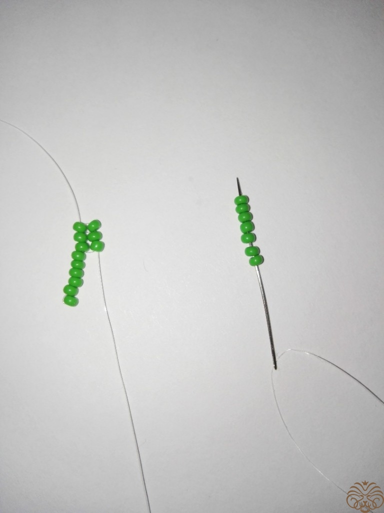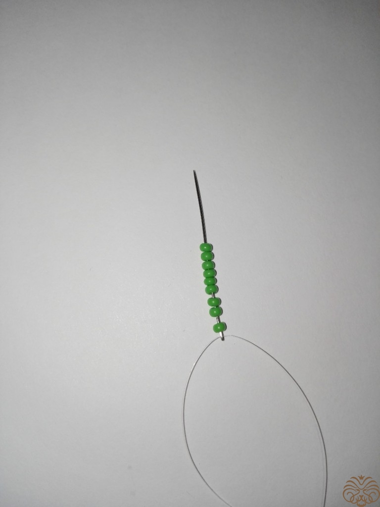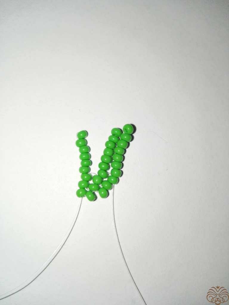 Листья плетем петербургской цепочкой. Набираем 9 бисеринок, последнюю и первую бисеринки попускаем, проходим в обратном направлении через остальные бисеринки. Набираем 2 бисеринки для новой иголочки и пришиваем их к первой, пройдя через третью, вторую и первую бисеринки. Набираем одну бисеринку, проходим через две уже пришитые, набираем еще 7 бисеринок. Пропуская последнюю набранную, проходим в обратном направлении через шесть набранных и одну пришитую бисеринку. Набираем 2 бисеринки следующей иголочки и пришиваем как предыдущую, пройдя через 3 бисеринки, оставляя одну бисеринку в основании иголочки свободной.