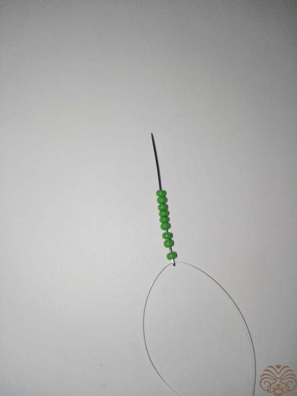 Добавляем зеленую проволоку, пройдя через центральные бисеринки (при плетении были выступающими), и обматываем зеленой ниточкой, пряча под ней рабочие концы.