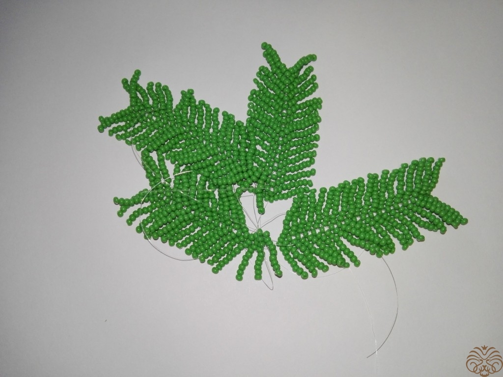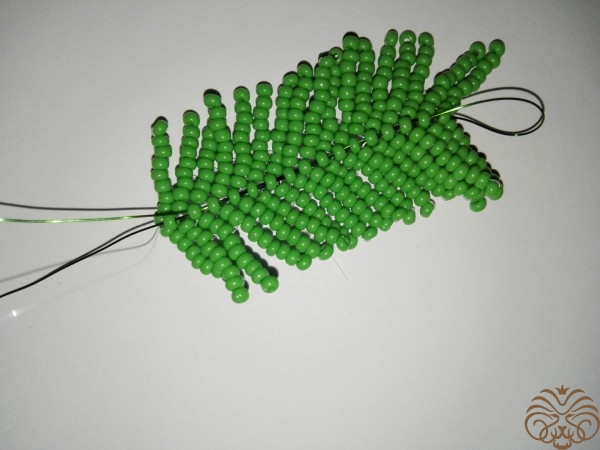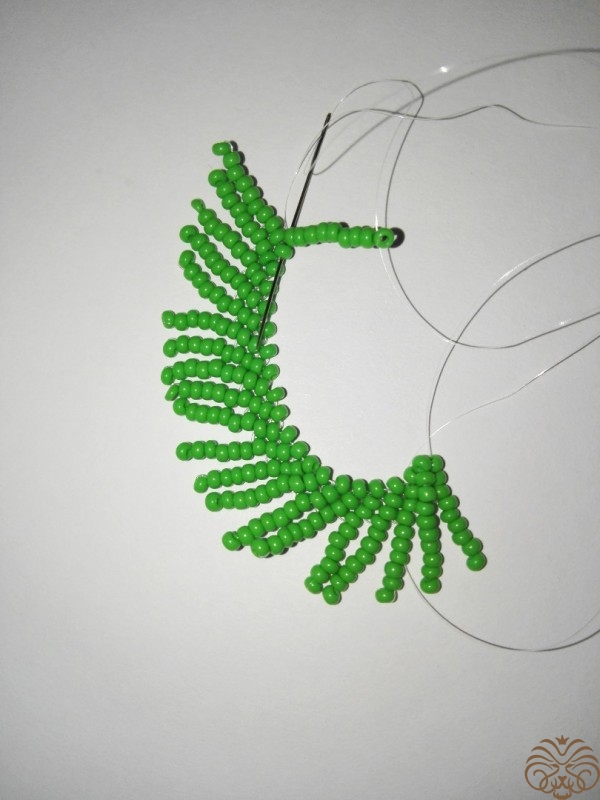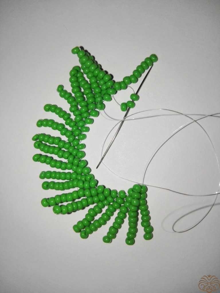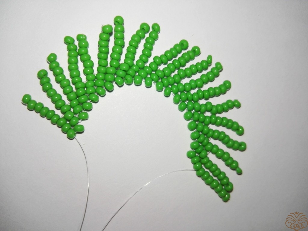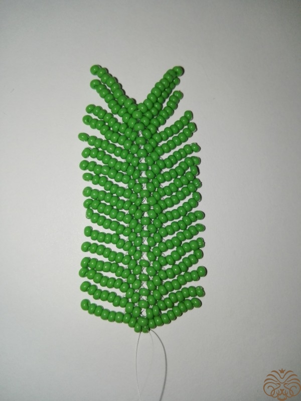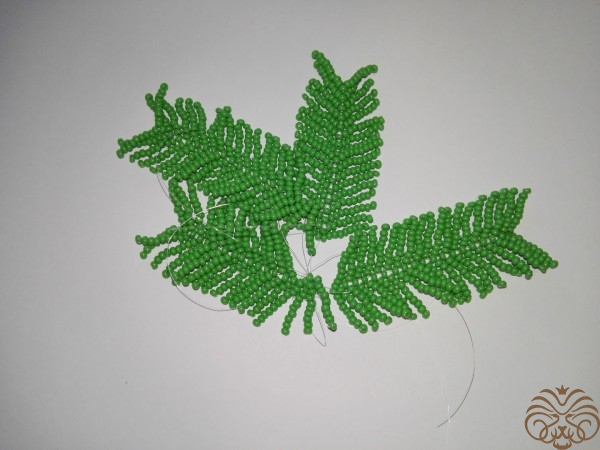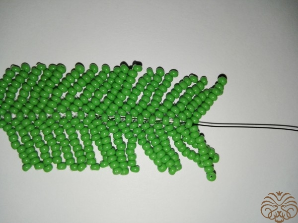 Делаем 15-20 иголочек с одной стороны. К последней иголочке новые бисеринки не пришиваем, а проходим через всю иголочку. Набираем 9 бисерин, пропуская последнюю набранную, проходим через остальные, делая иголочку. Далее проходим через верхнюю выспупающую бисеринку, набираем три бисеринки и пришиваем их к иголочке, пройдя через две бисеринки предыдущей иголочки, а затем еще раз через вторую и третью только что набранные. Далее набираем шесть бисеринок и, пропуская последнюю, проходим через 5 набранных и три пришитых бисеринки. Опять проходим через слеующую выступающую бисеринку, пришиваем три бисеринки, набираем еще шесть и делаем иголочку. Делаем листик до конца. Если несколько иголочек не будет хватать из-за окончания мононити, то ничего страшного в этом нет - можно оставить листочек таким. Завязываем узелок. Отрезаем лишние концы мононити, оставляя несколько сантиметров.