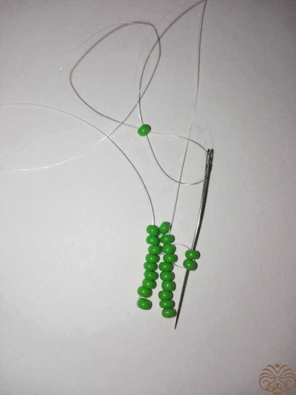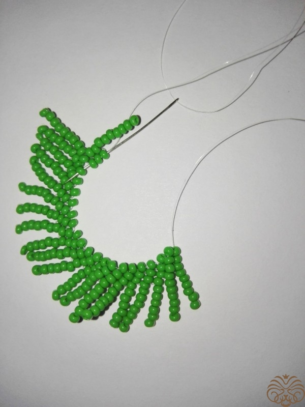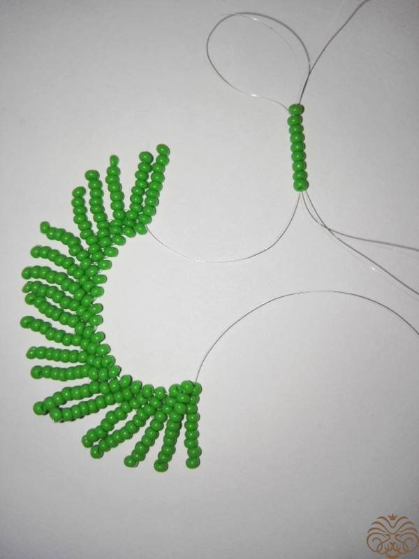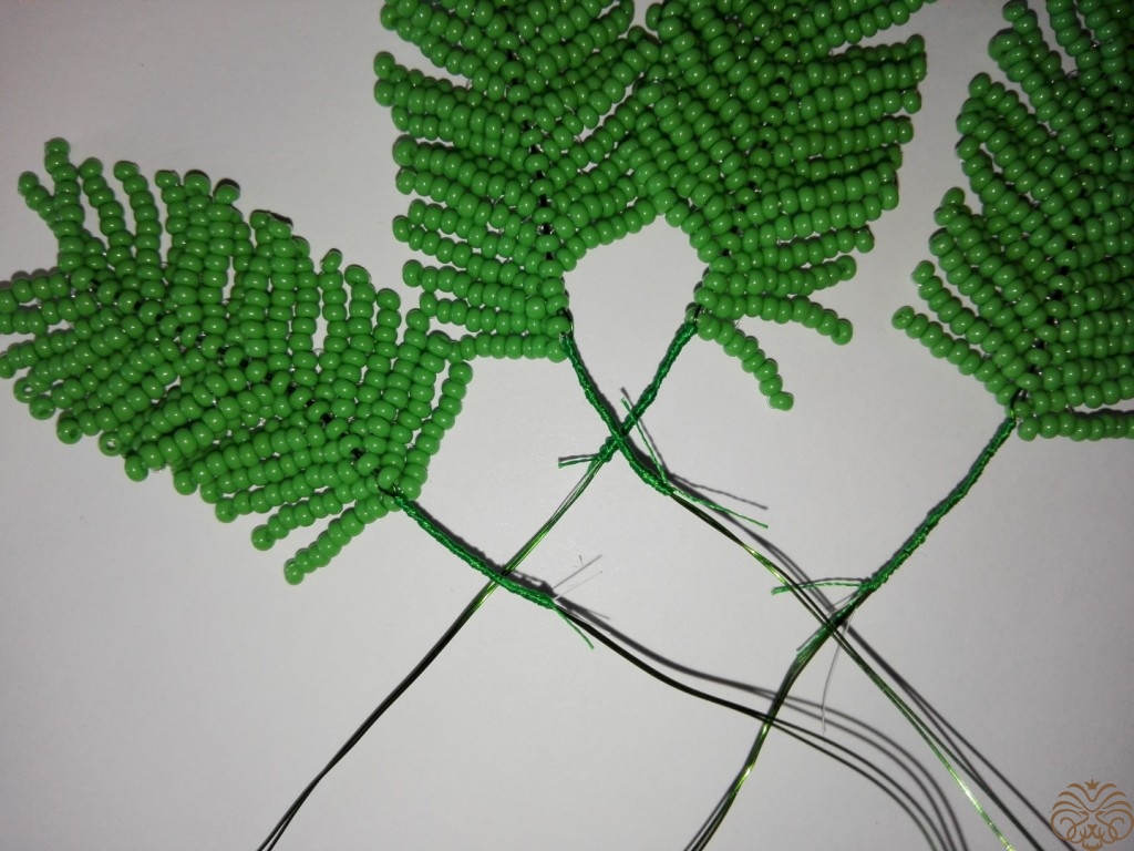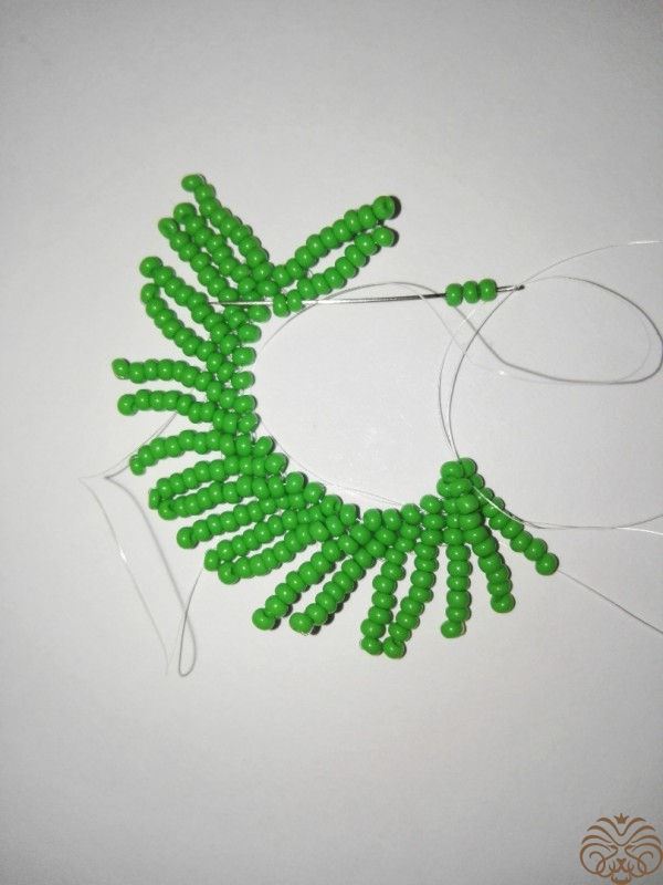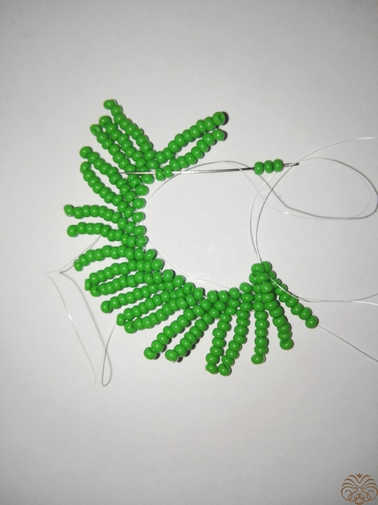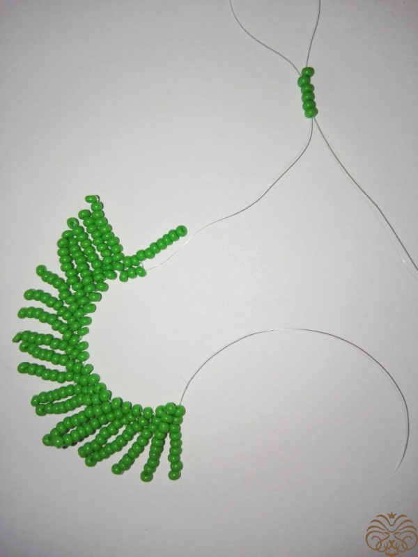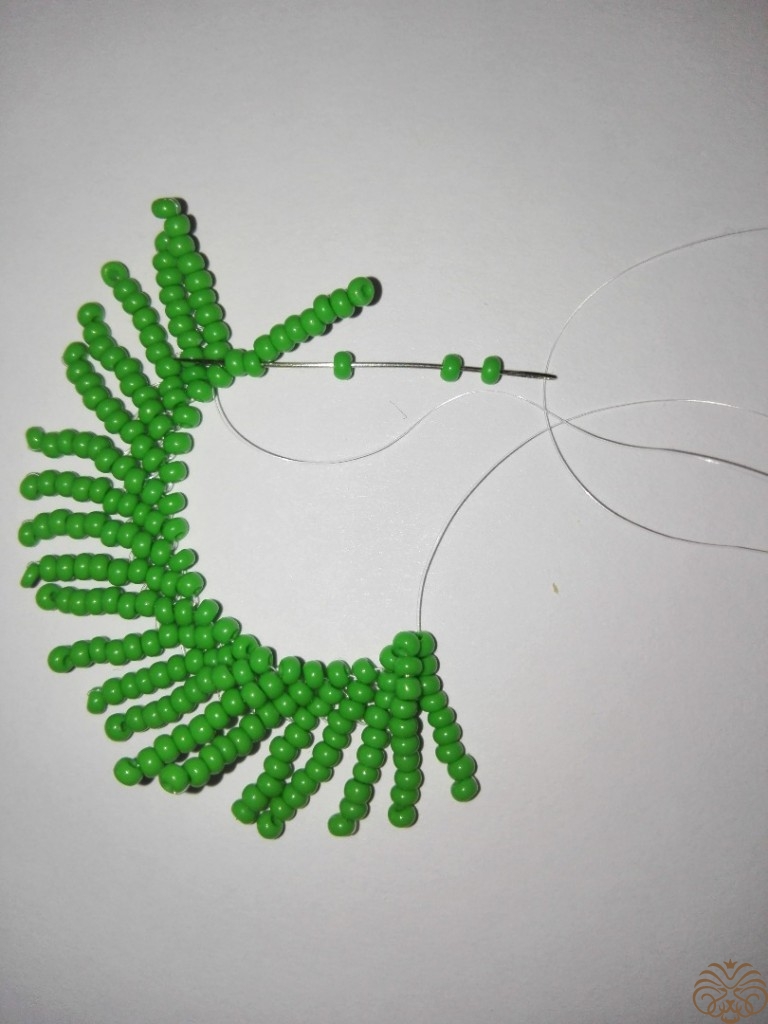 Делаем 15-20 иголочек с одной стороны. К последней иголочке новые бисеринки не пришиваем, а проходим через всю иголочку. Набираем 9 бисерин, пропуская последнюю набранную, проходим через остальные, делая иголочку. Далее проходим через верхнюю выспупающую бисеринку, набираем три бисеринки и пришиваем их к иголочке, пройдя через две бисеринки предыдущей иголочки, а затем еще раз через вторую и третью только что набранные. Далее набираем шесть бисеринок и, пропуская последнюю, проходим через 5 набранных и три пришитых бисеринки. Опять проходим через слеующую выступающую бисеринку, пришиваем три бисеринки, набираем еще шесть и делаем иголочку. Делаем листик до конца. Если несколько иголочек не будет хватать из-за окончания мононити, то ничего страшного в этом нет - можно оставить листочек таким. Завязываем узелок. Отрезаем лишние концы мононити, оставляя несколько сантиметров.