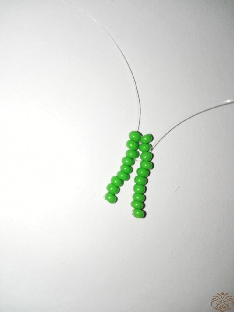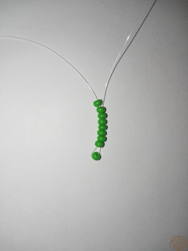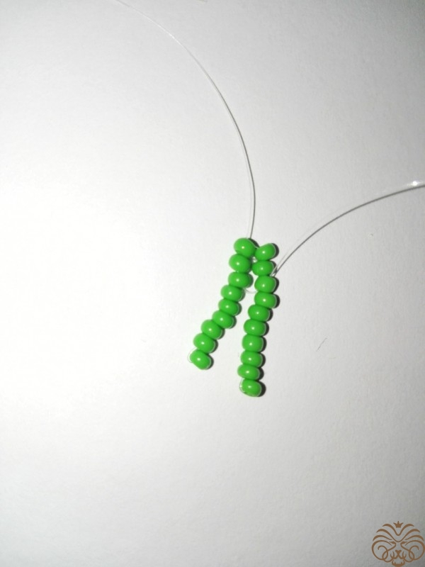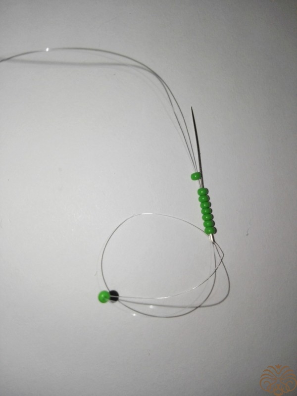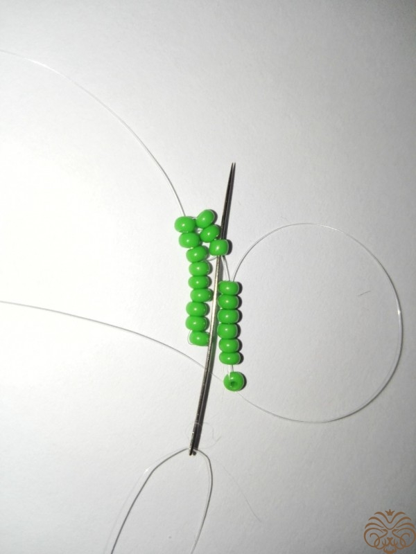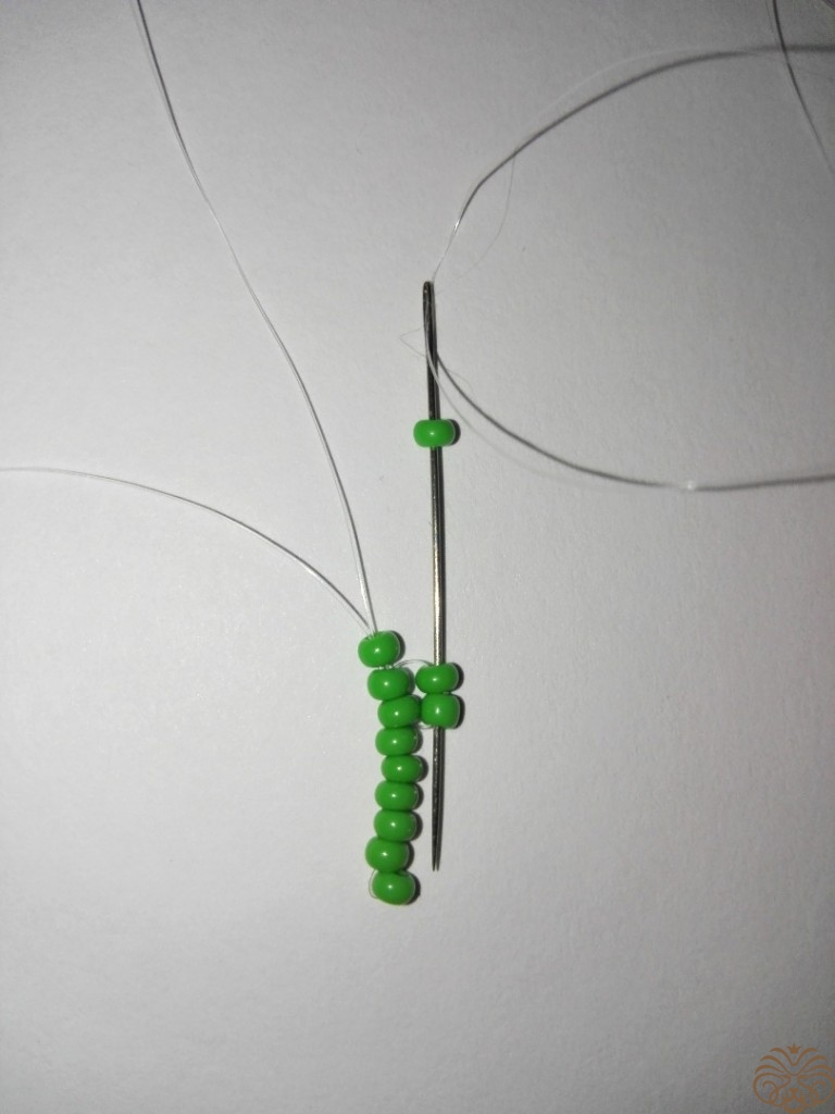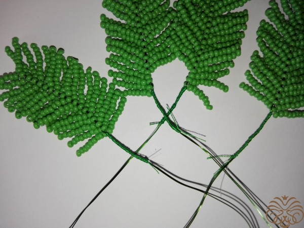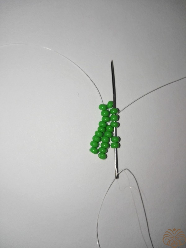 Делаем 15-20 иголочек с одной стороны. К последней иголочке новые бисеринки не пришиваем, а проходим через всю иголочку. Набираем 9 бисерин, пропуская последнюю набранную, проходим через остальные, делая иголочку. Далее проходим через верхнюю выспупающую бисеринку, набираем три бисеринки и пришиваем их к иголочке, пройдя через две бисеринки предыдущей иголочки, а затем еще раз через вторую и третью только что набранные. Далее набираем шесть бисеринок и, пропуская последнюю, проходим через 5 набранных и три пришитых бисеринки. Опять проходим через слеующую выступающую бисеринку, пришиваем три бисеринки, набираем еще шесть и делаем иголочку. Делаем листик до конца. Если несколько иголочек не будет хватать из-за окончания мононити, то ничего страшного в этом нет - можно оставить листочек таким. Завязываем узелок. Отрезаем лишние концы мононити, оставляя несколько сантиметров.
