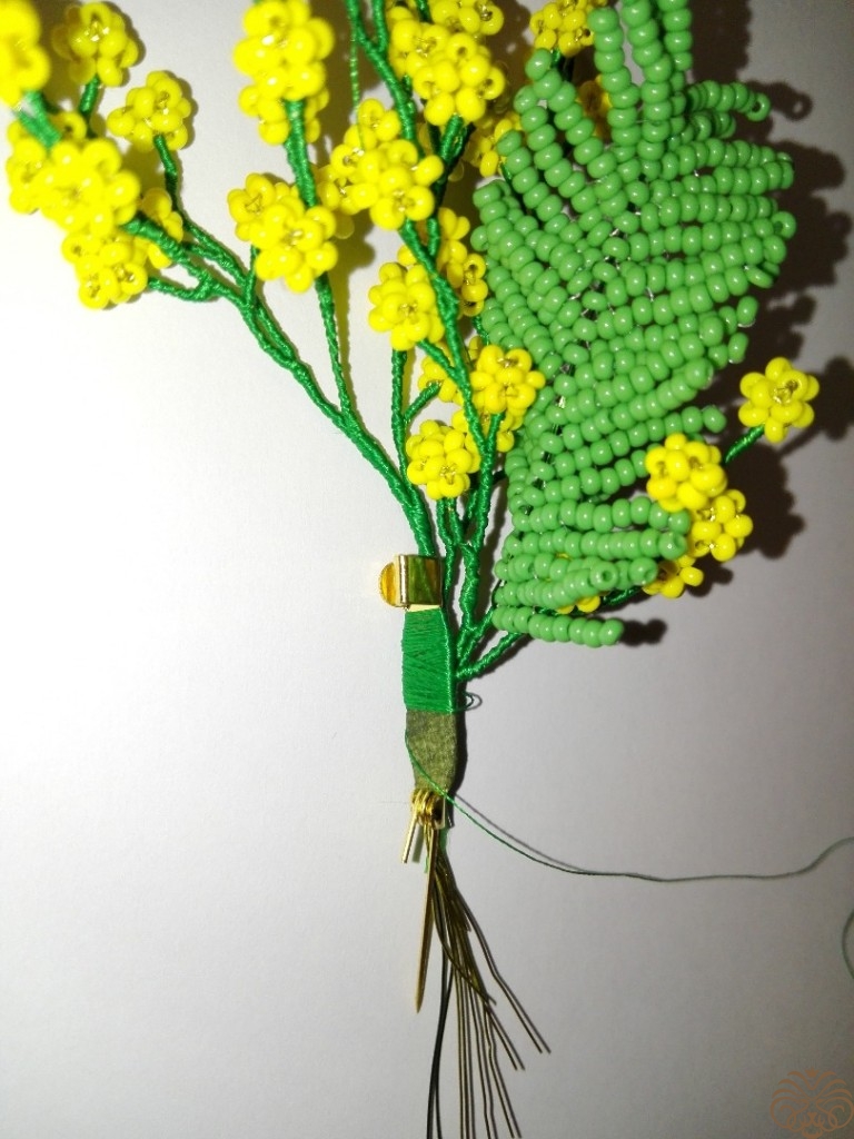 Обматываем зеленой ниточкой стебельки с цветами, пряча под ней рабочие концы.