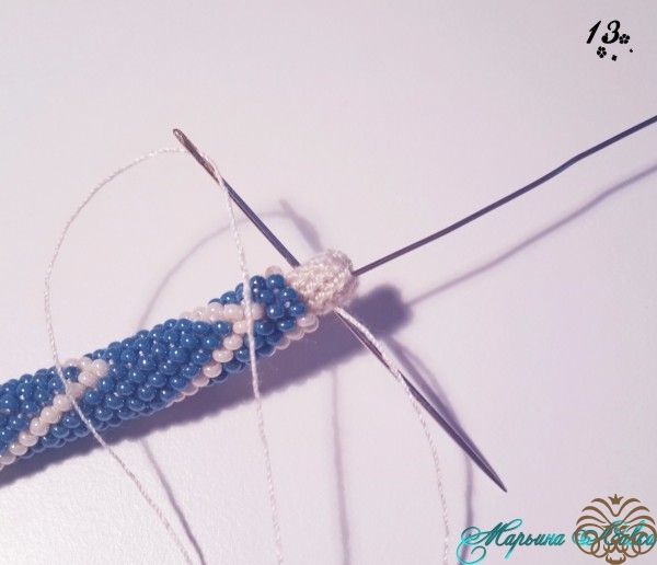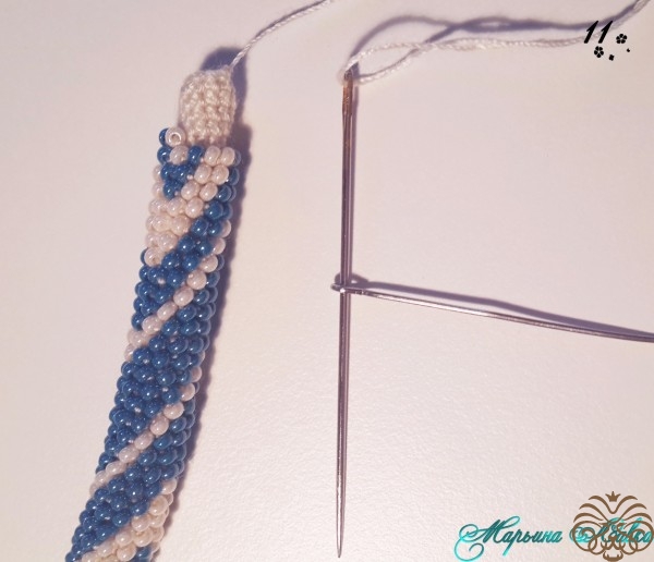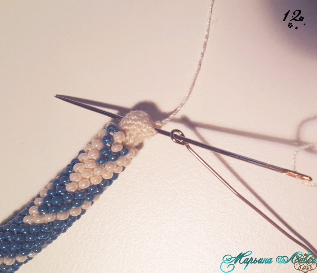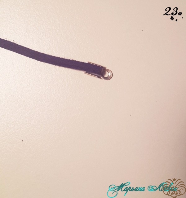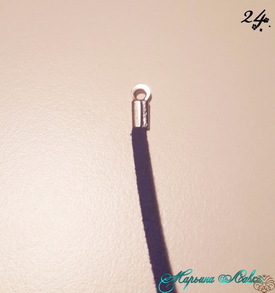 Многие используют для крепления бусину, мне для такого тонкого жгута хватает и вшивания.