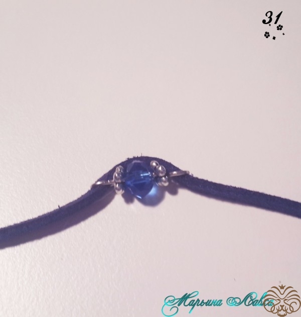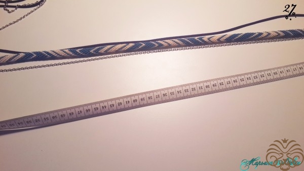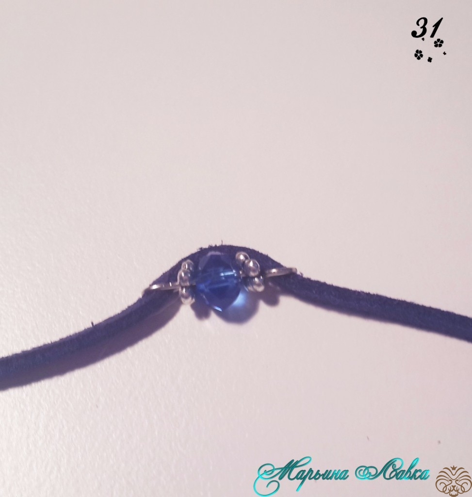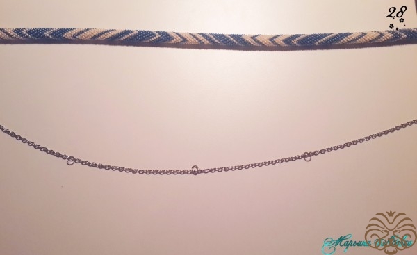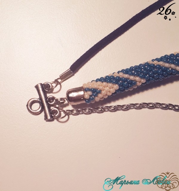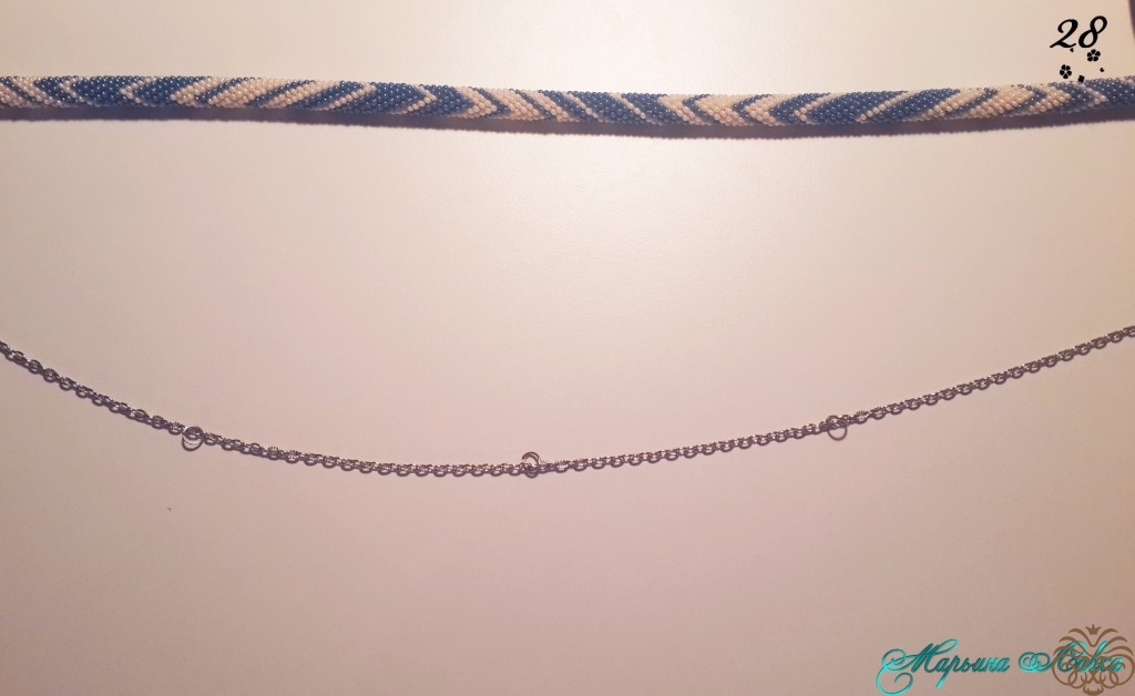 Далее кладем наш жгут прямо, нанизываем первую бусину на шнур, продевая через обе петельки (получится так, будто шнур слегка обнимает бусину), продвигаем бусину почти к самому концу в промежуток между коннектором и первым соединительным колечком на цепочке, продеваем шнур в первое соединительное колечко на цепочке (стараемся что-бы бусина получилась по середине этого расстояния). Так проделываем с каждой бусиной, оплетая тем самым жгут. ( Можно в таком порядке: Соединение шнура и цепи спереди, потом сзади, потом снова спереди и т.д.).