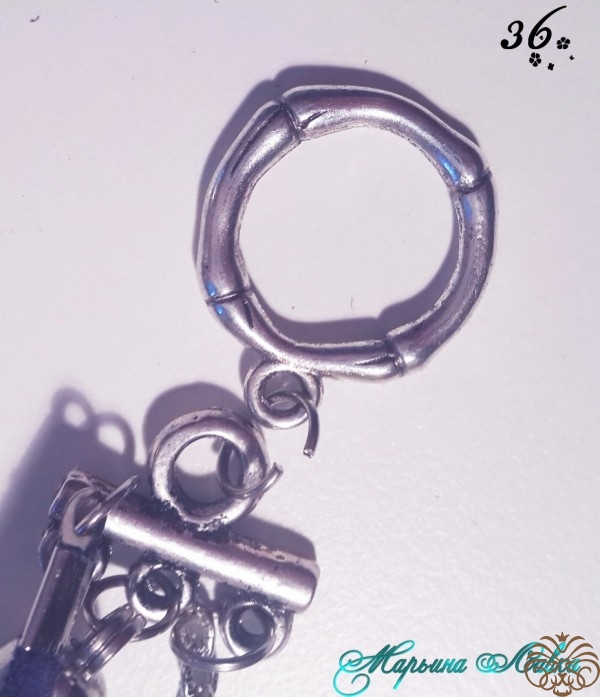 Далее на равных расстояниях крепим соединительные колечки на цепочке, у меня вышло 6 колечек. Также второй свободный конец присоединяем к другому коннектору, так, чтобы цепь оказалась на одной стороне от жгута.Теперь, необходимо закрепить бусины и разделители для бусин на пинах, по такому же принципу как мы делали концы для жгута (90 градусов, а потом крутим на себя). У меня получилось 7 таких бусин.