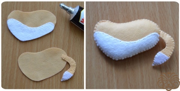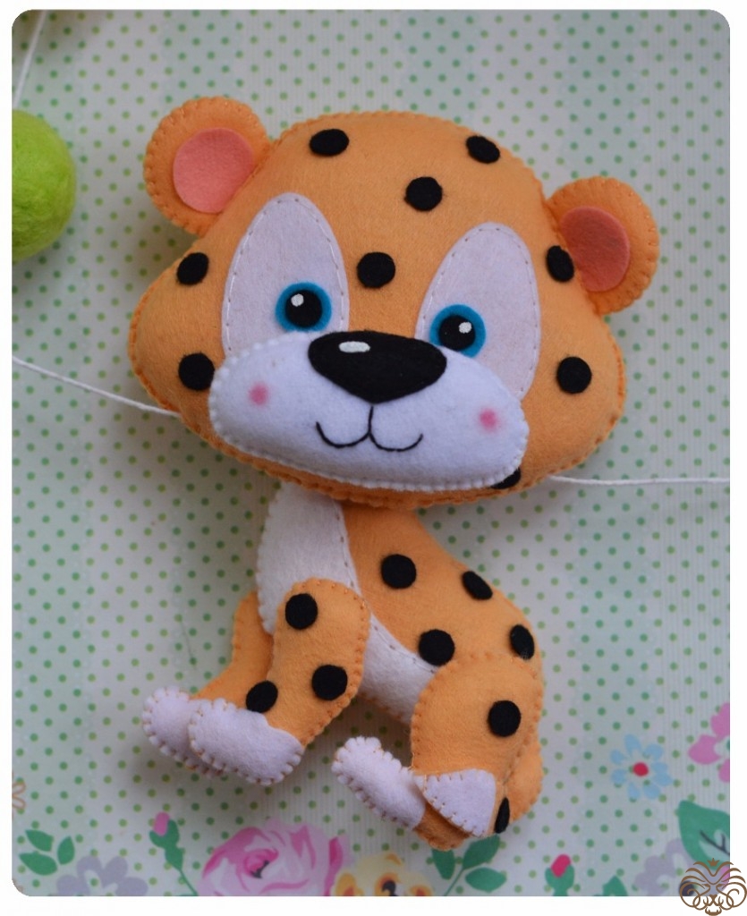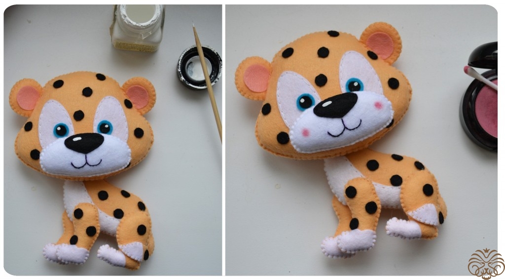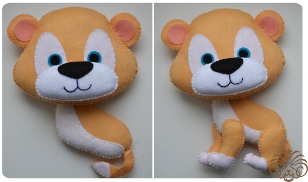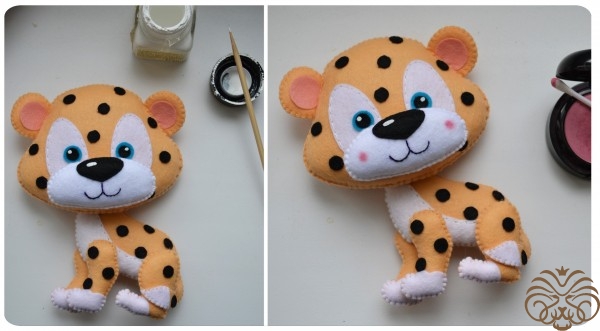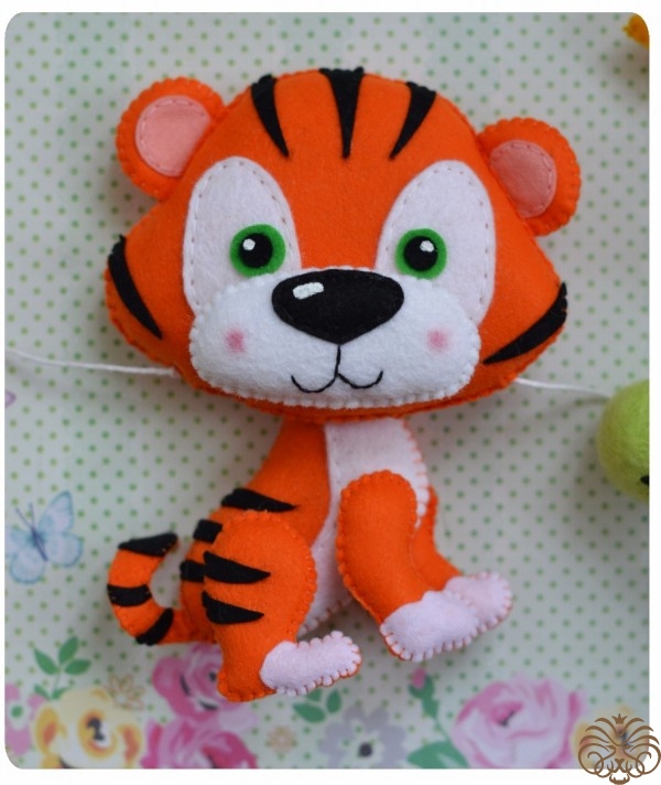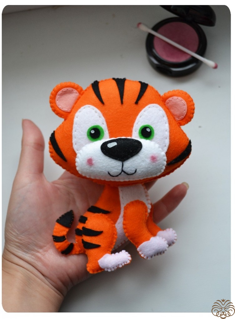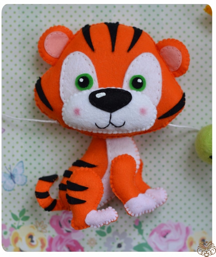 Теперь сделаем тигра! Воспользуйтесь той же самой выкройкой, что и в леопарде, только зеркально отразите все детали, кроме головы и заметите персиковый фетр на рыжий. Также добавьте полоски вместо пятен до сшивания деталей. Я нарезала много одинаковых произвольных полосок и затем приклеивала их одни полностью, другие только край. Затем обрезала торчащие не приклеенные края полосок. Также кончик хвоста я сделала не белый, а черный и повернула его вверх, а не вниз, как было у леопарда. И изменила цвет глаз на зеленый