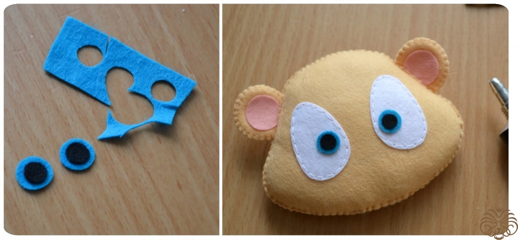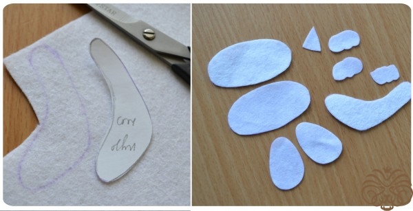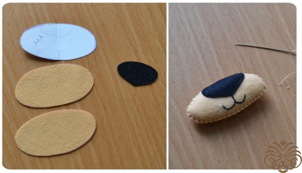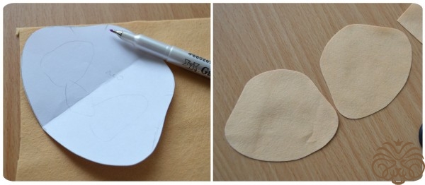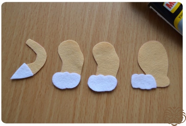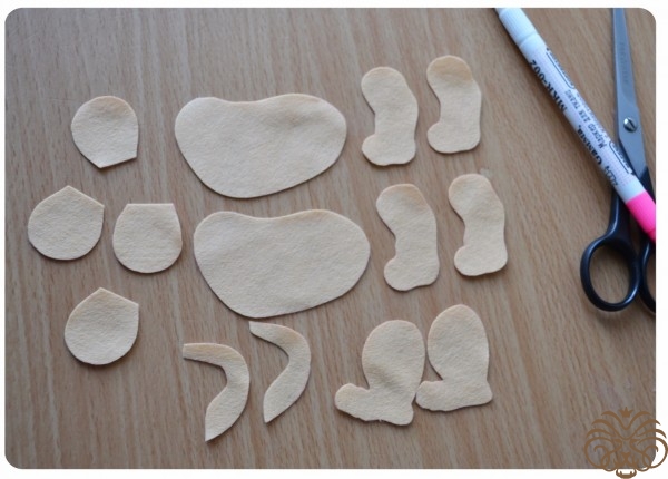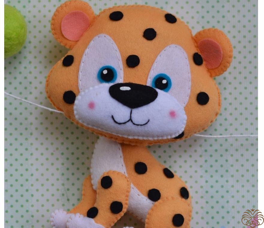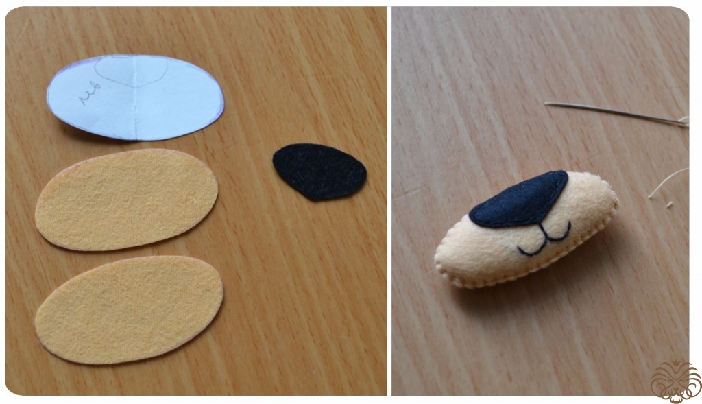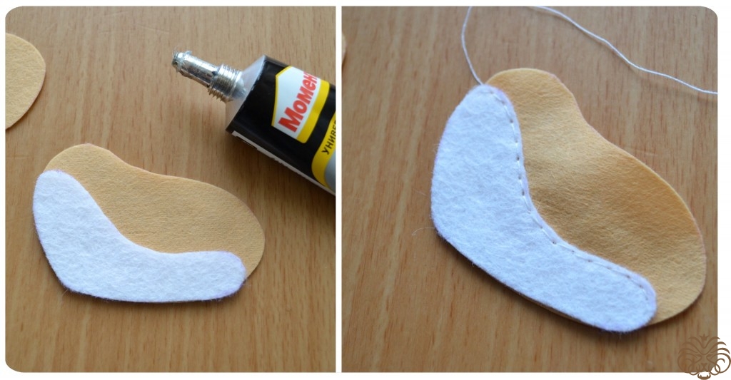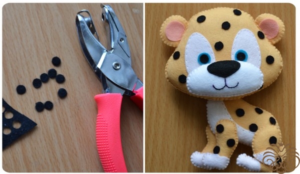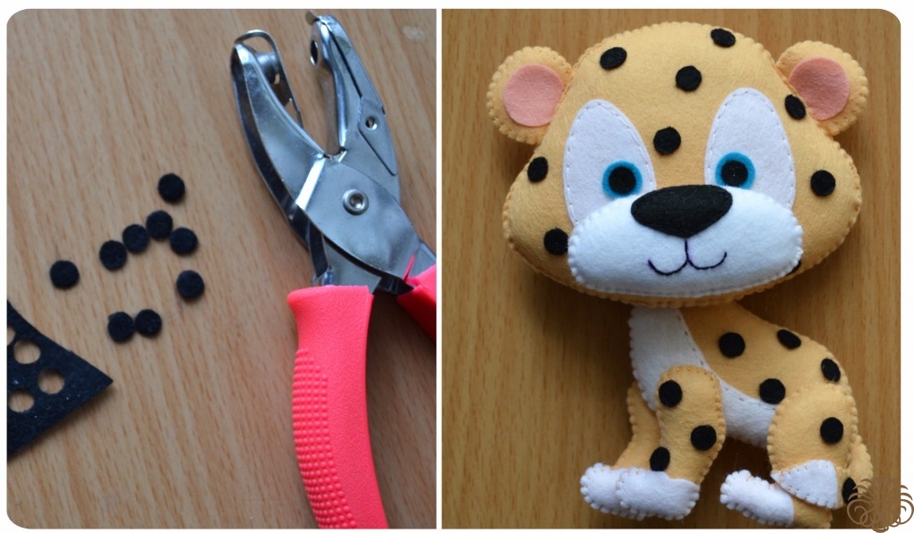 Теперь сделаем тигра! Воспользуйтесь той же самой выкройкой, что и в леопарде, только зеркально отразите все детали, кроме головы и заметите персиковый фетр на рыжий. Также добавьте полоски вместо пятен до сшивания деталей. Я нарезала много одинаковых произвольных полосок и затем приклеивала их одни полностью, другие только край. Затем обрезала торчащие не приклеенные края полосок. Также кончик хвоста я сделала не белый, а черный и повернула его вверх, а не вниз, как было у леопарда. И изменила цвет глаз на зеленый