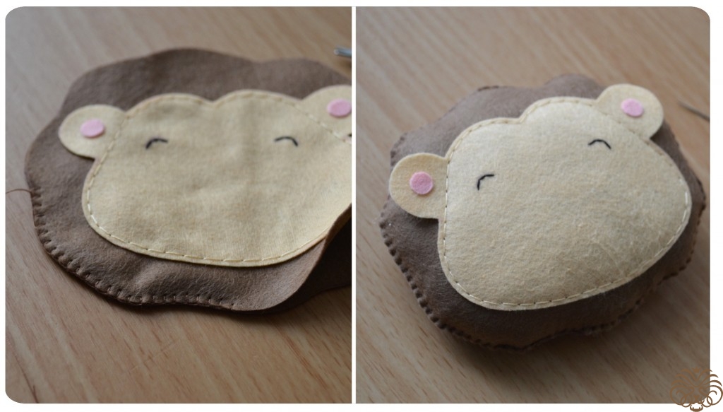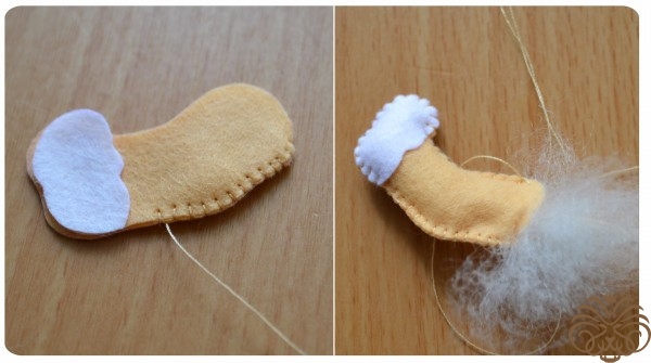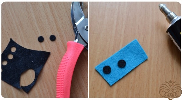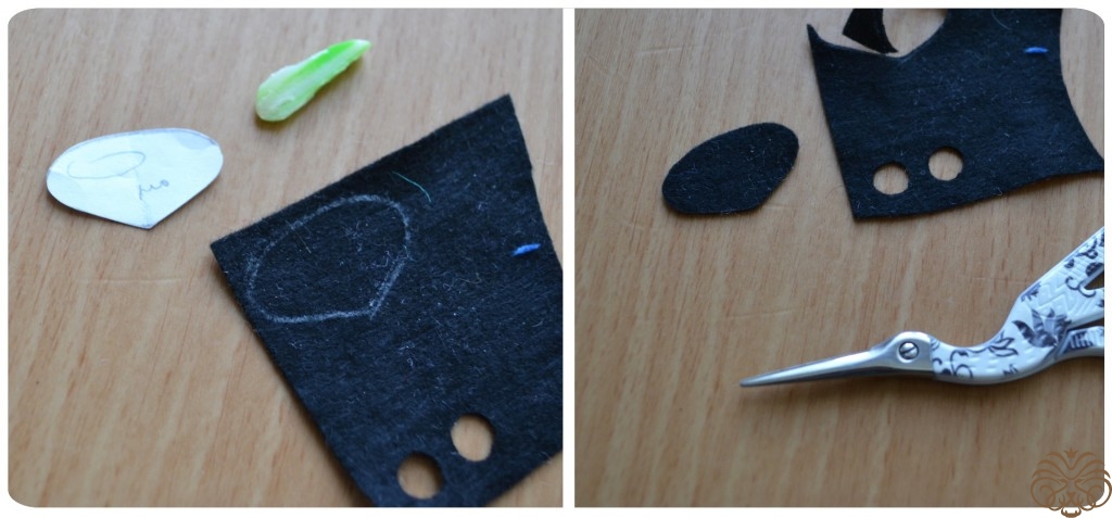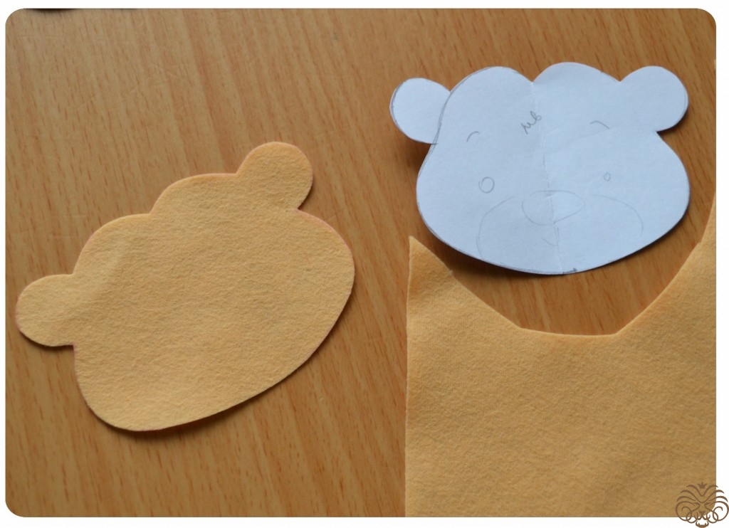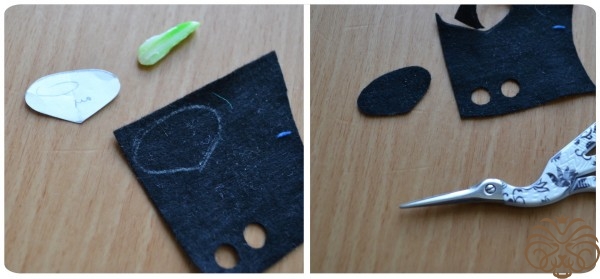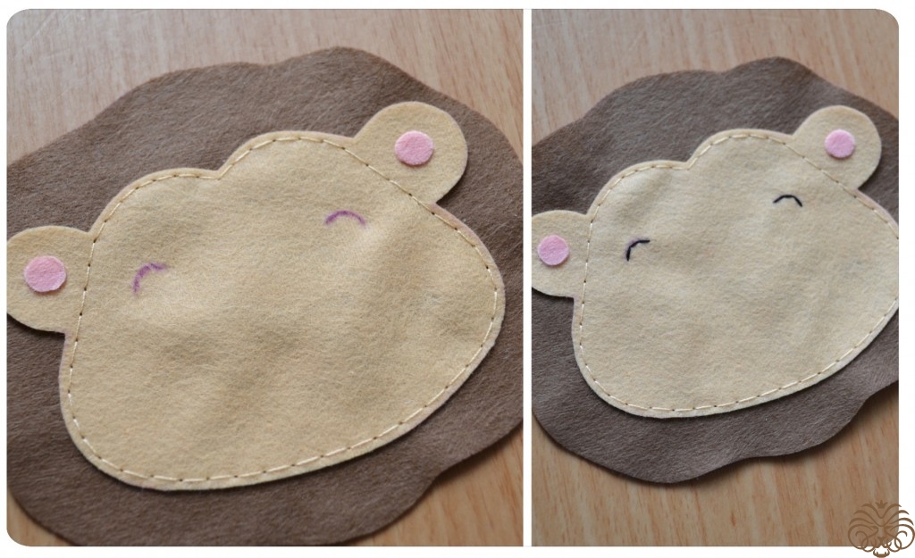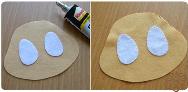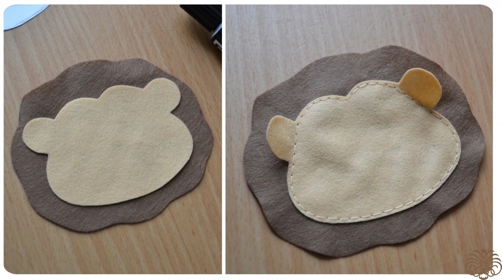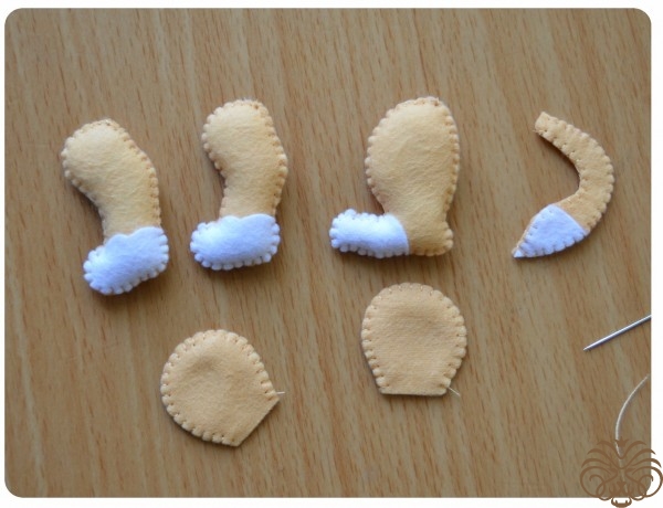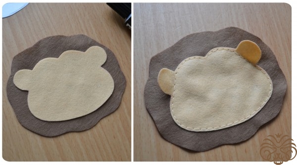Теперь сделаем тигра! Воспользуйтесь той же самой выкройкой, что и в леопарде, только зеркально отразите все детали, кроме головы и заметите персиковый фетр на рыжий. Также добавьте полоски вместо пятен до сшивания деталей. Я нарезала много одинаковых произвольных полосок и затем приклеивала их одни полностью, другие только край. Затем обрезала торчащие не приклеенные края полосок. Также кончик хвоста я сделала не белый, а черный и повернула его вверх, а не вниз, как было у леопарда. И изменила цвет глаз на зеленый