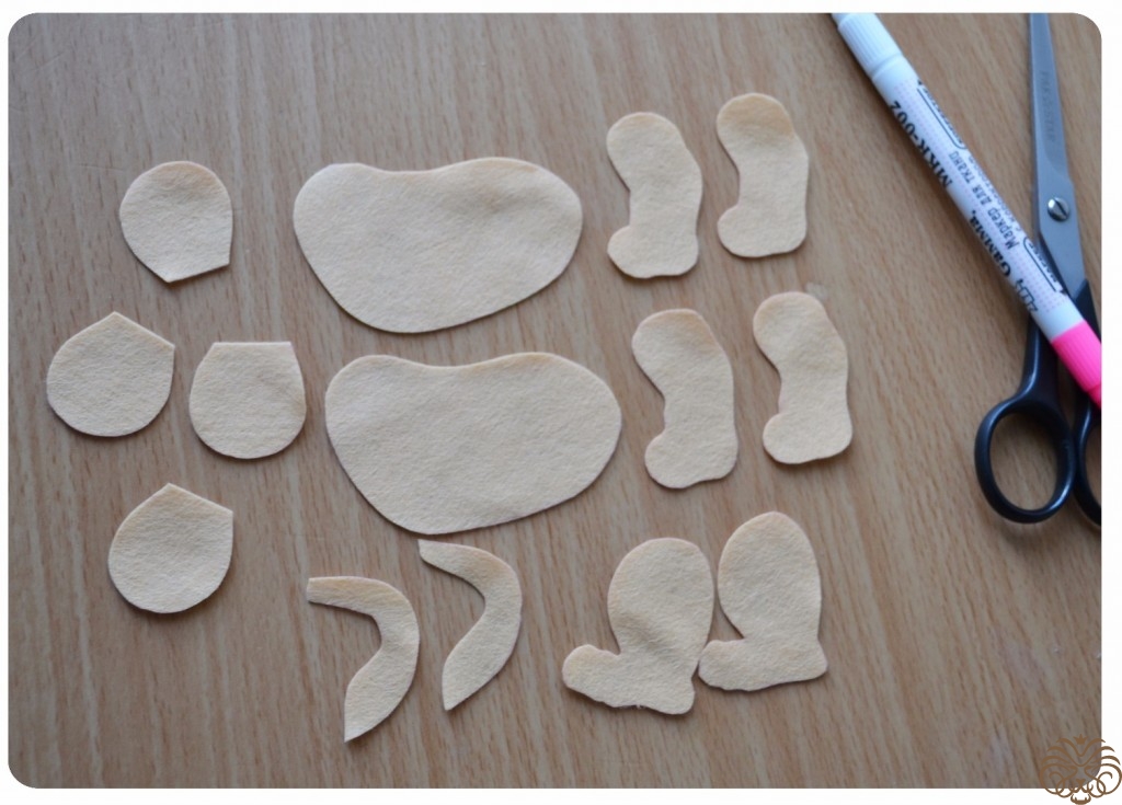 2. Фетр: персиковый, белый, черный, ультрамарин, розовый, коричневый, зеленый, рыжий (я буду использовать самый тонкий (1мм) мягкий полиэстеровый испанский фетр)