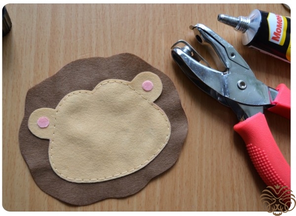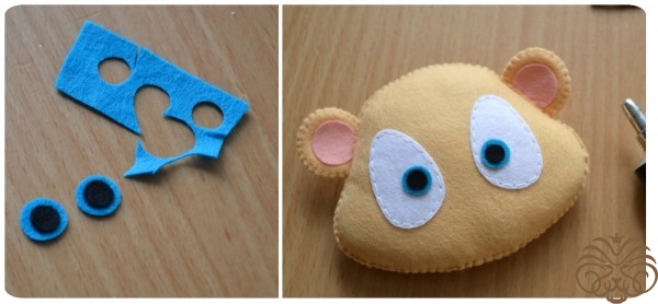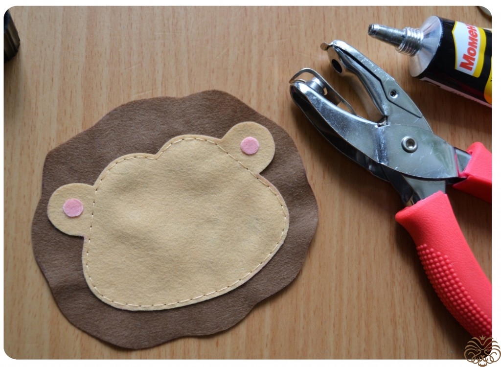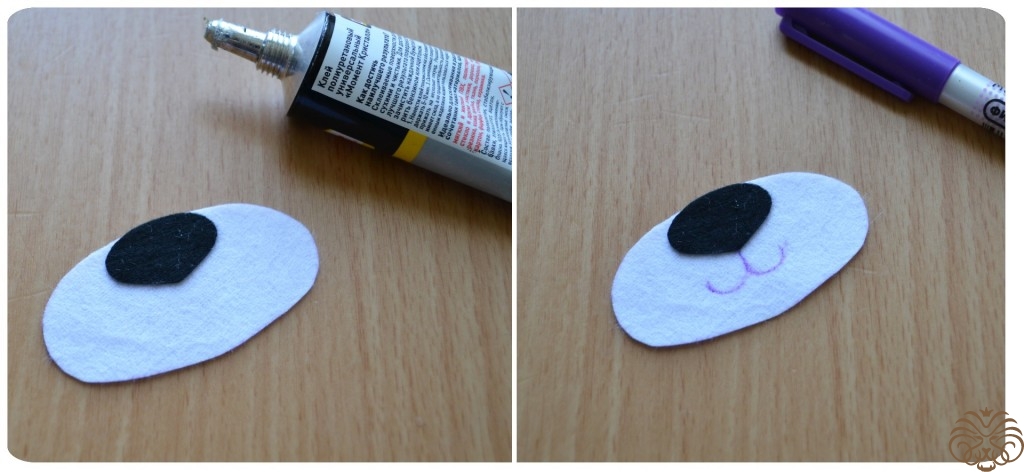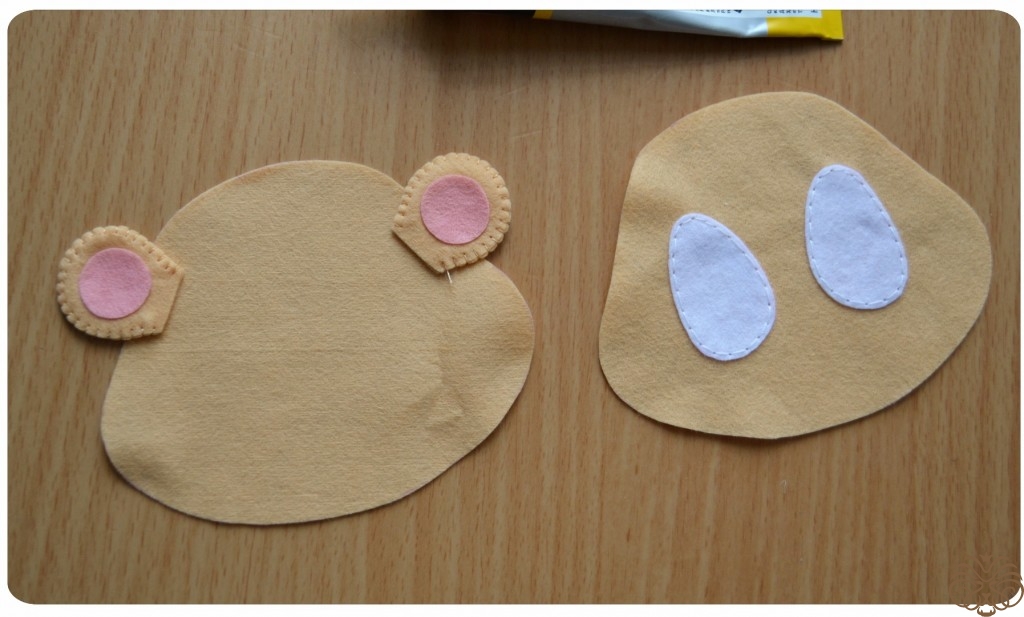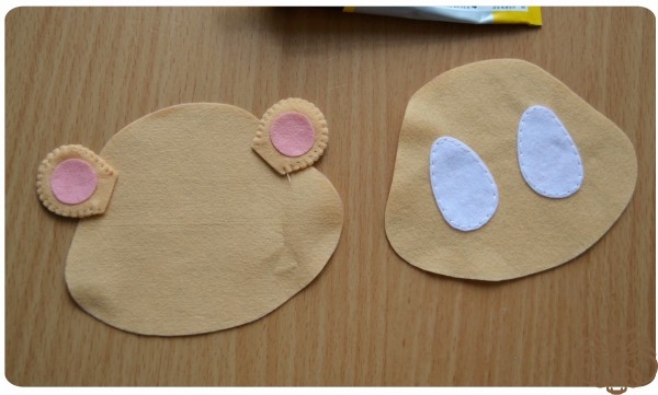 Вырезаем два розовый круглешка. У меня их диаметр совпал с диаметром копеечки, которую я и использовала как деталь, по которой можно обвести круг. Приклеиваем кругляшки на ушки