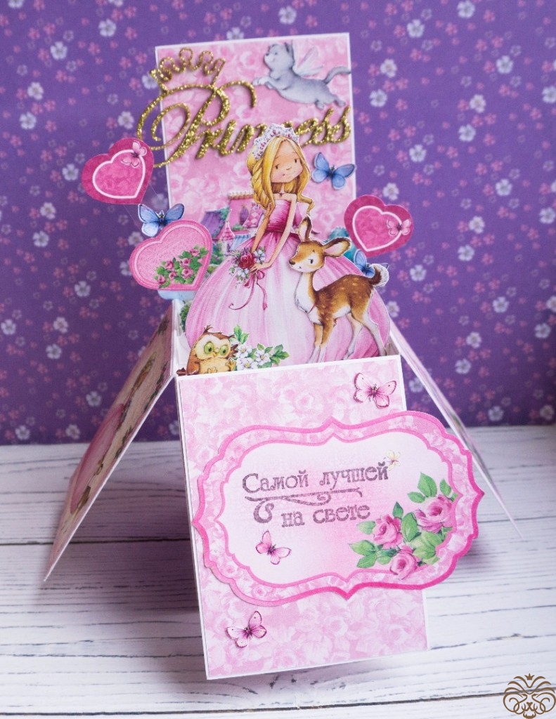 Такая объемная открытка станет отличным дополнением к подарку для маленькой принцессы или вариантом приглашения на детский праздник. В сложенном виде она легко поместится в конверт и станет приятным сюрпризом для получателя.
