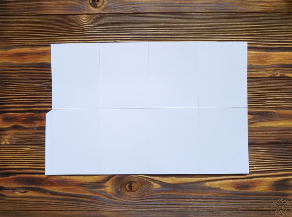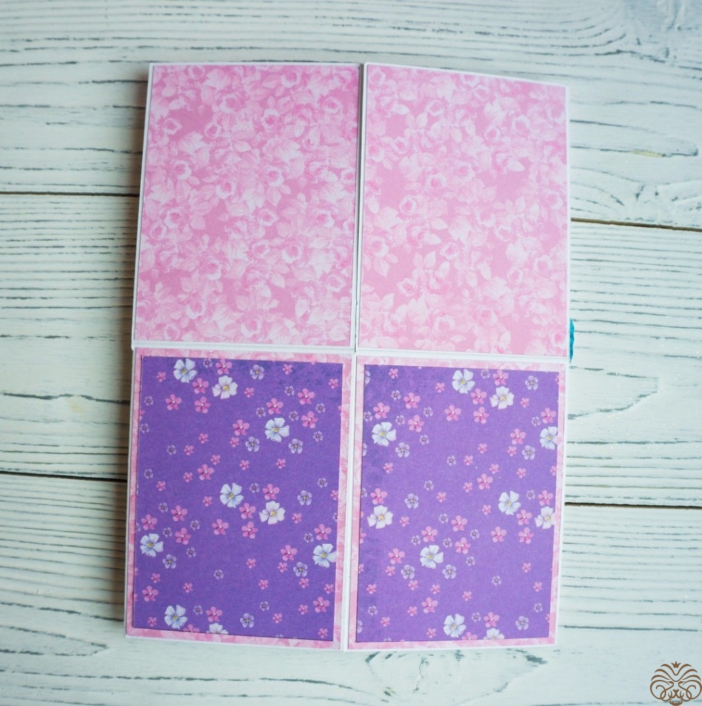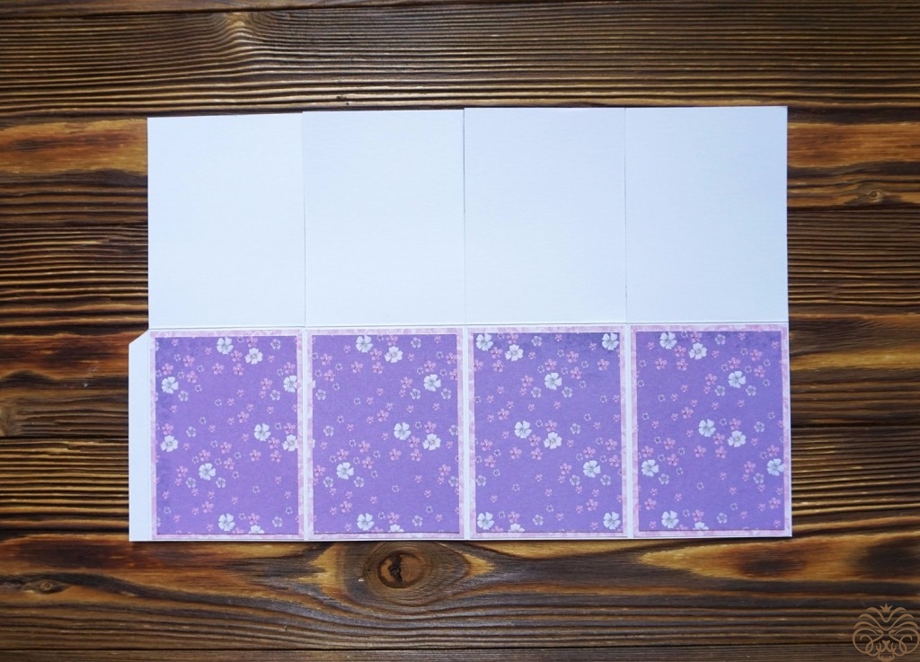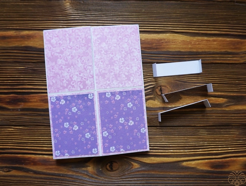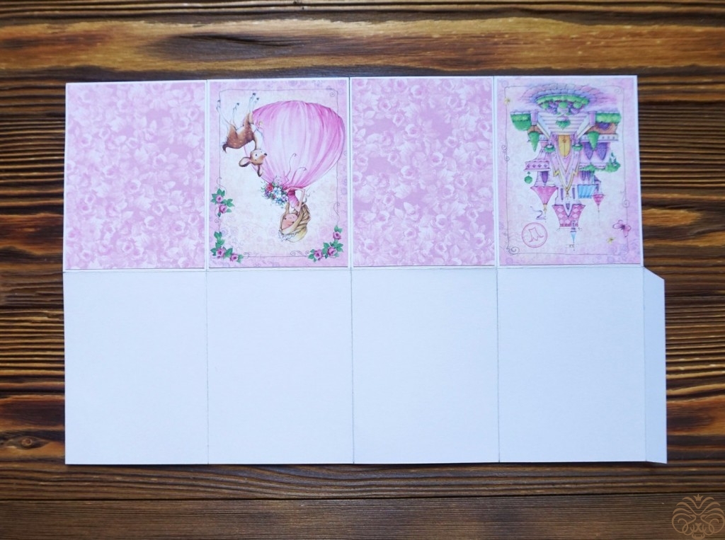 Внутреннюю часть будем декорировать только сверху, т.е. те стороны, которые у нас будут отгибаться. Соответственно карточки приклеиваем "вверх ногами".