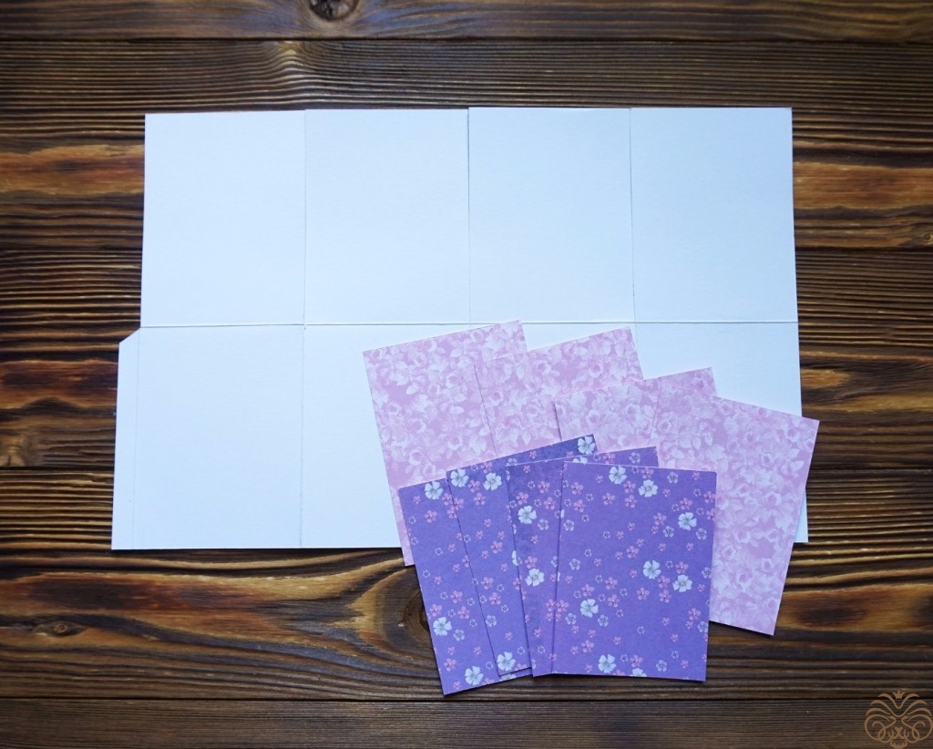 Обклеиваем внешнюю часть открытки скрапбумагой. Я вырезаю прямоугольники из скрапбумаги примерно на 2 мм меньше с каждой стороны размеров окошечка заготовки.