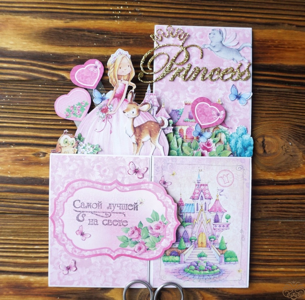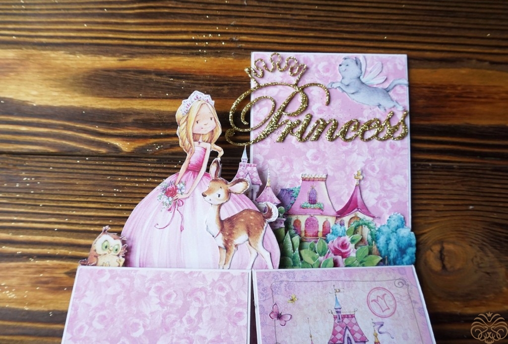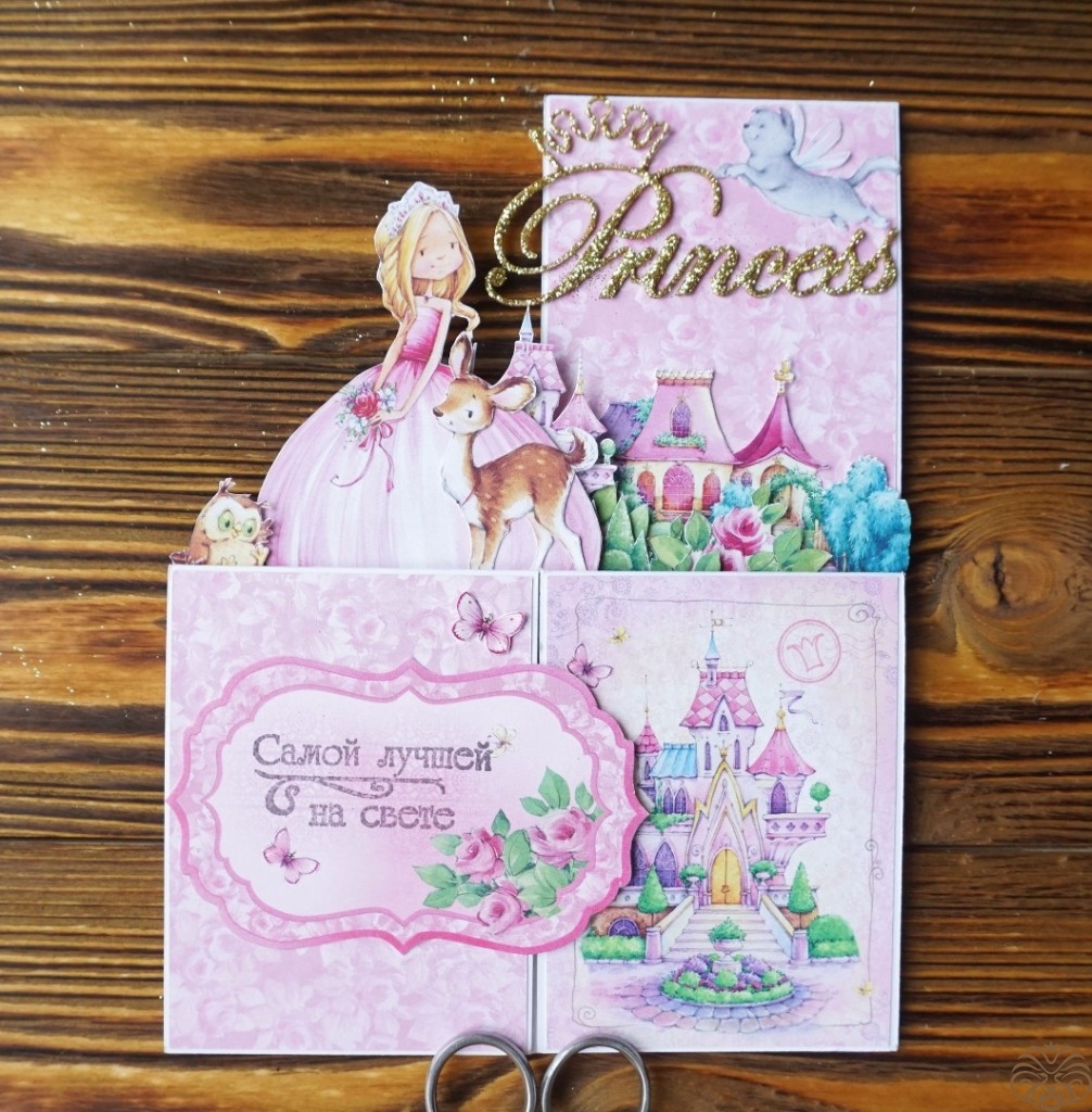 В наборе бумаги были очень красивые карточки с принцессой и замком, поэтому в размерах окошечек я отталкивалась от размеров карточек.