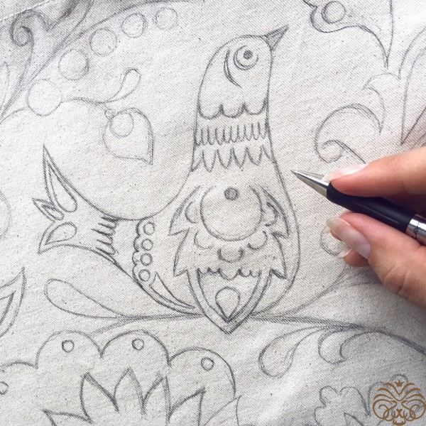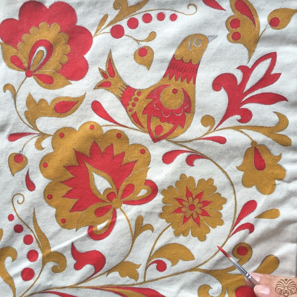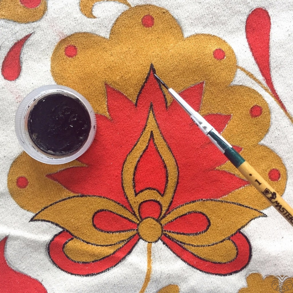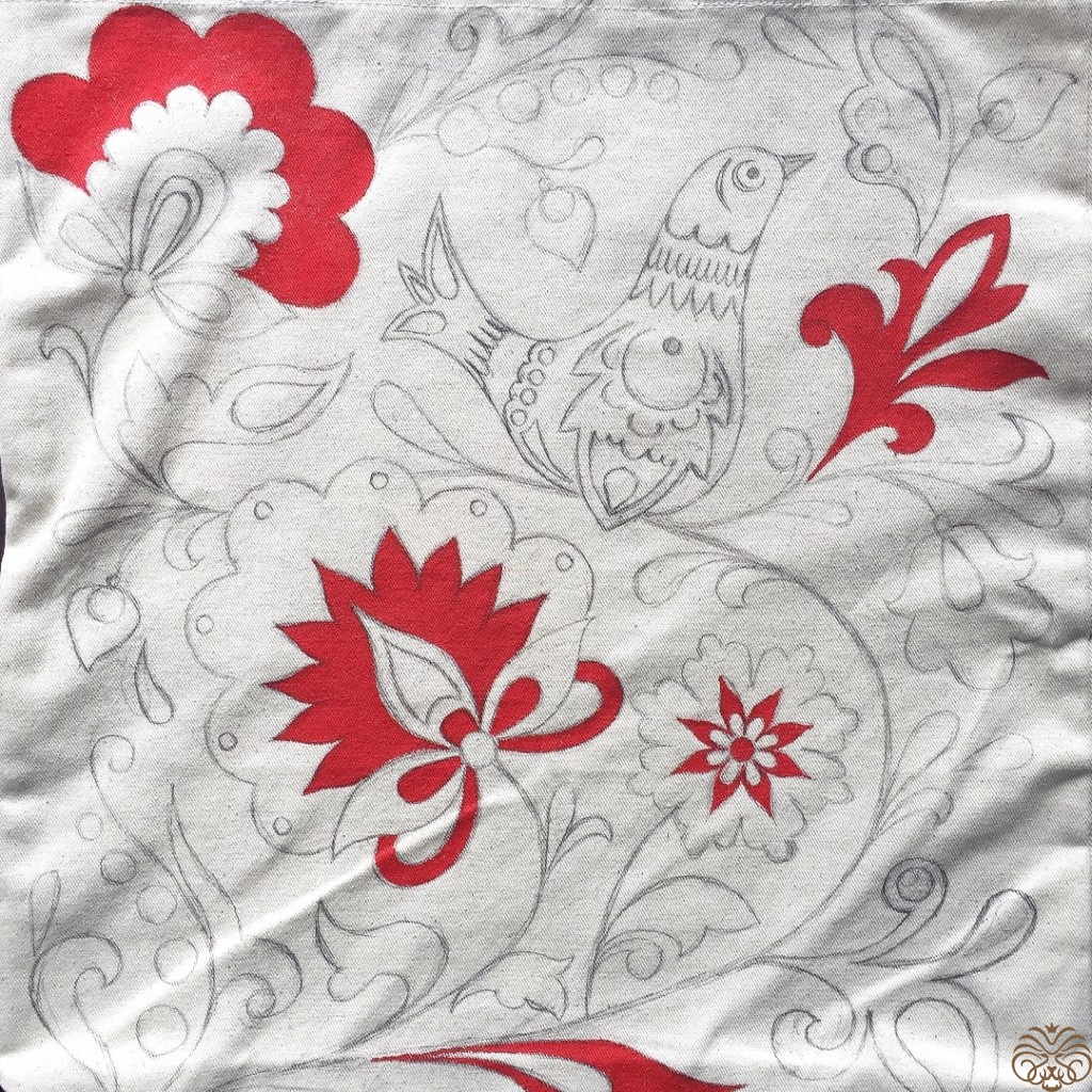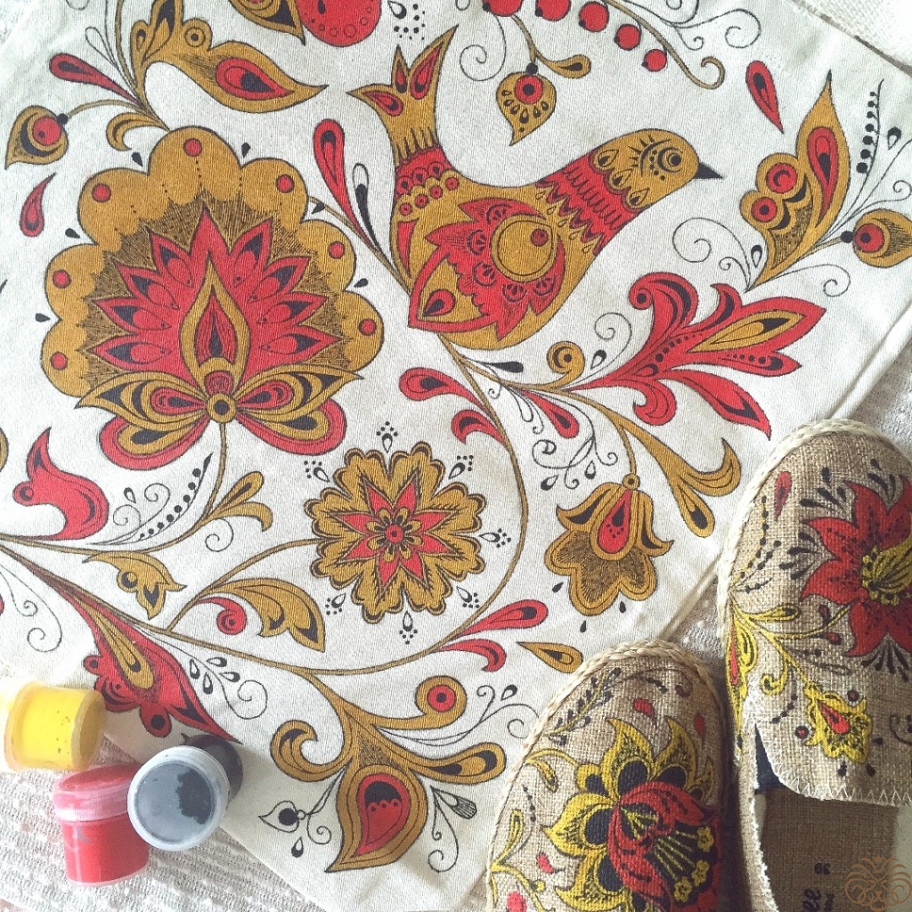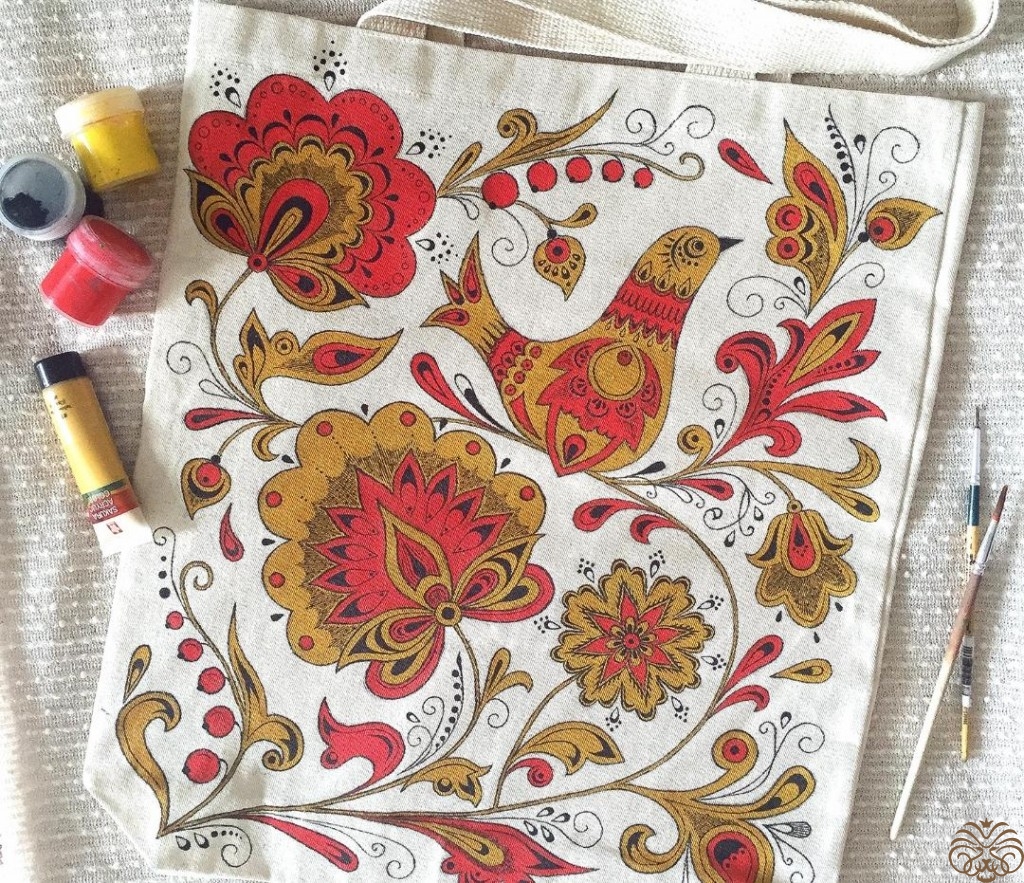 Сегодня мы создаем принт на холщевой сумке по русским мотивам хохломской росписи. Это средней сложности вязь узоров, выполненная всего в 3х цветах и не требующая художественных навыков работы с "переходами цвета" и созданием теней (что, безусловно, облегчает нам задачу).