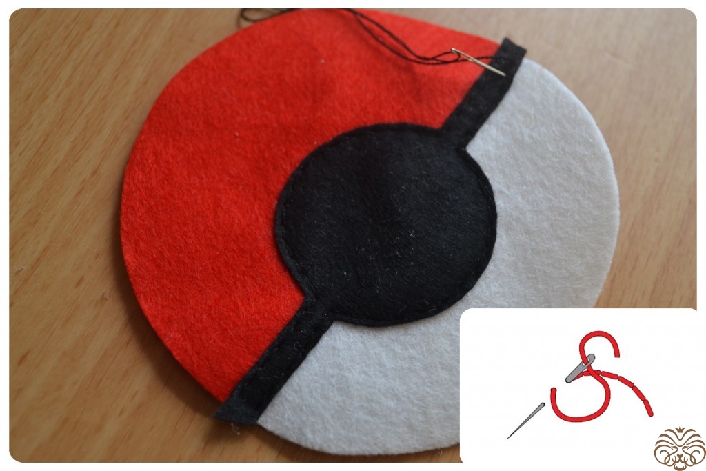 На белом круге раскладываем красную половинку Бола и черную разделительную деталь. Для удобства пришивания зафиксируем все эти детали клеем Момент Кристалл. Нам нужно поставить лишь пару мелких капель