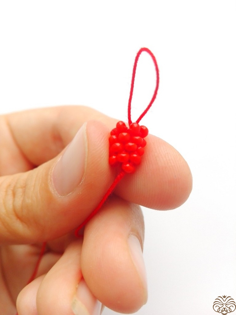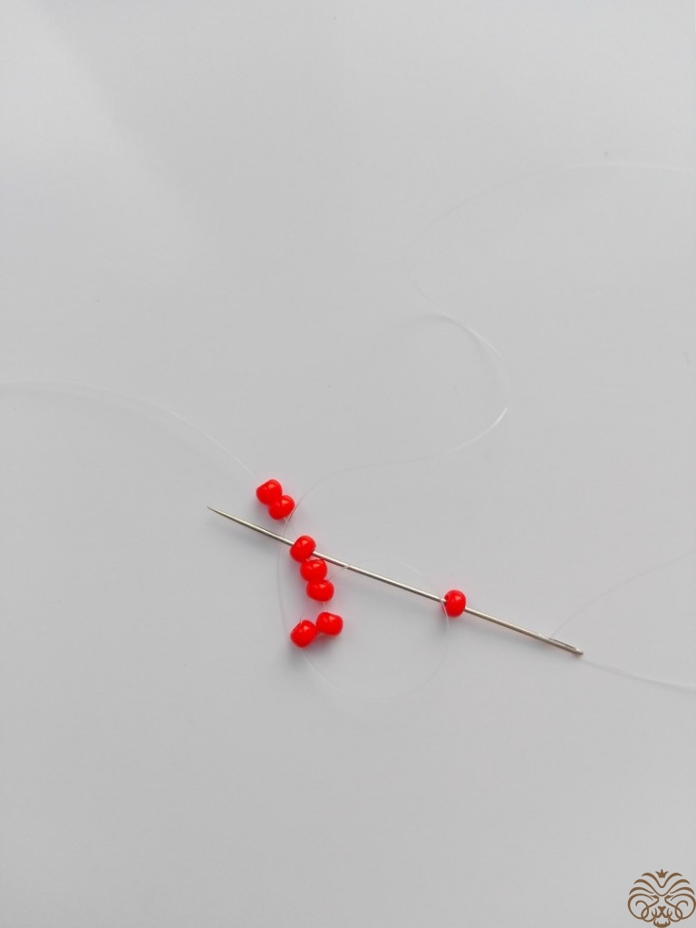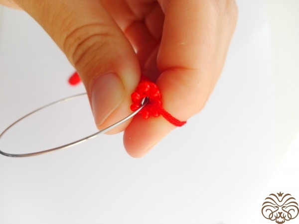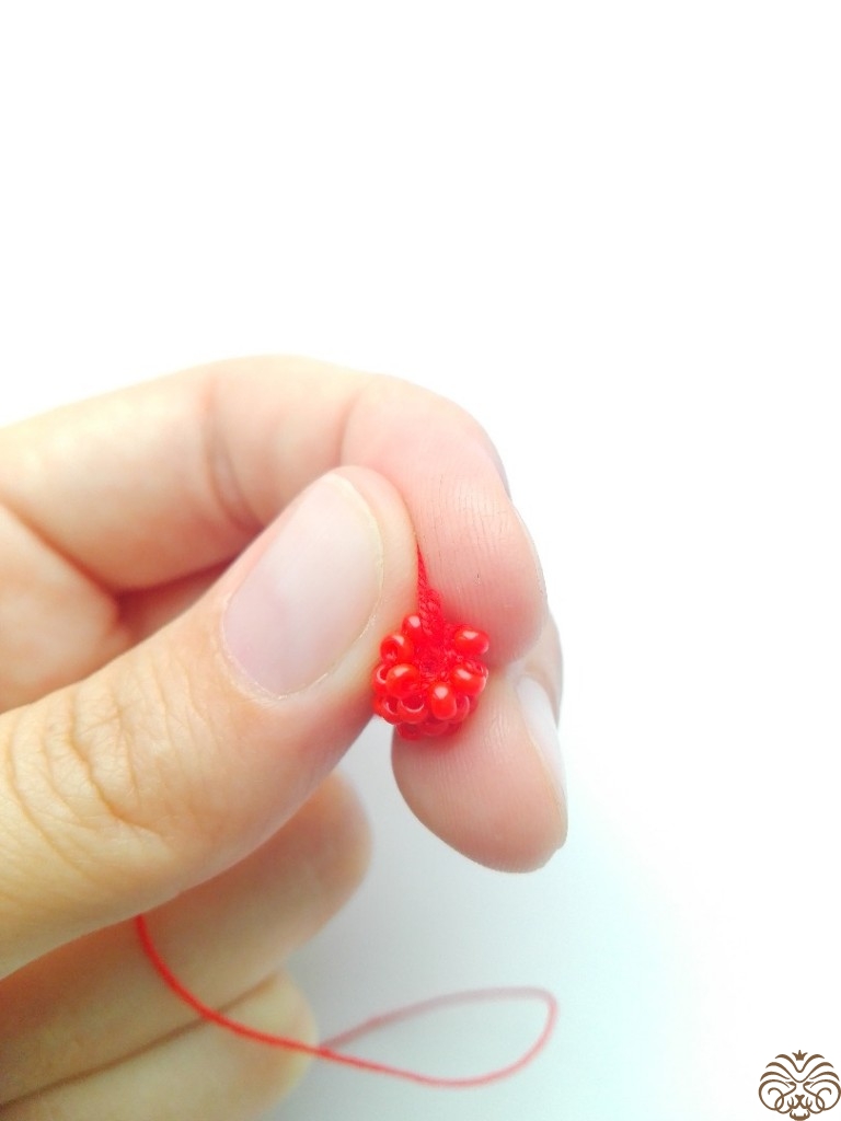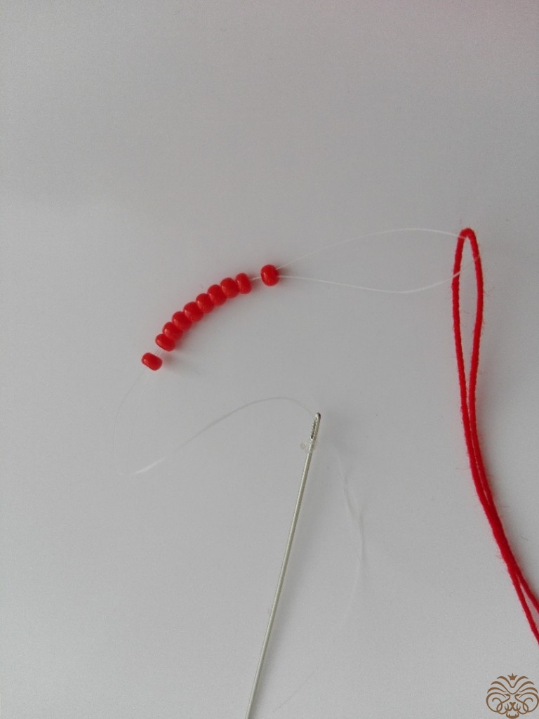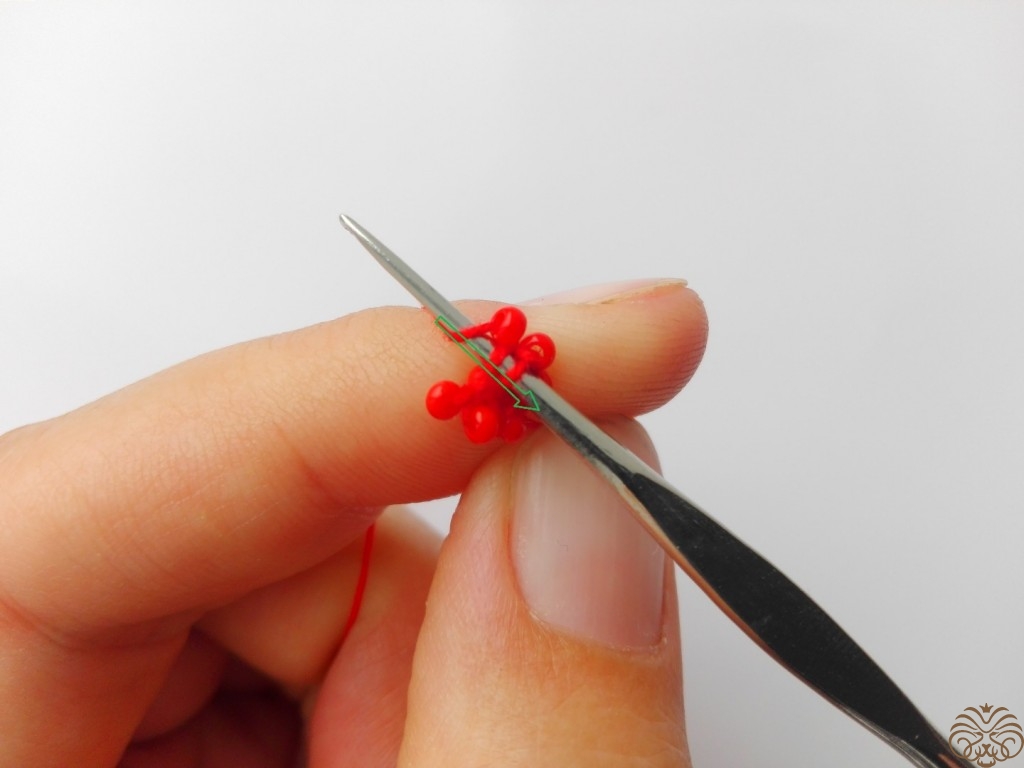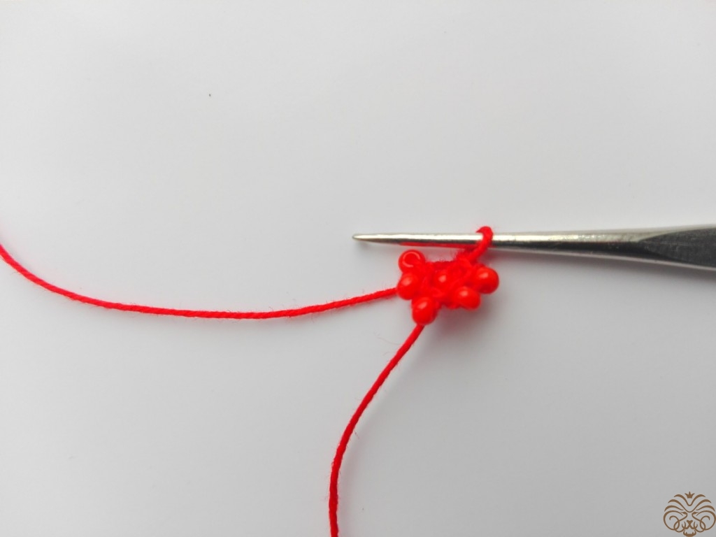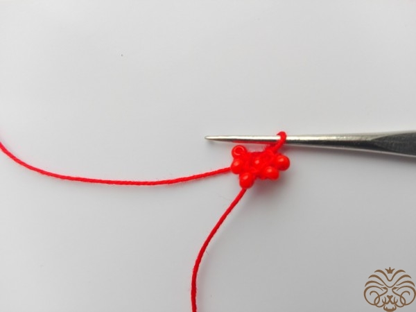 Лишний конец закрепляем. Для этого выходим из бисеринки, рядом с бисеринкой делаем петлю за нить и проходим в эту петлю иглой, затягивая узелок. Для надежности делаем подряд 4-5 узелков.