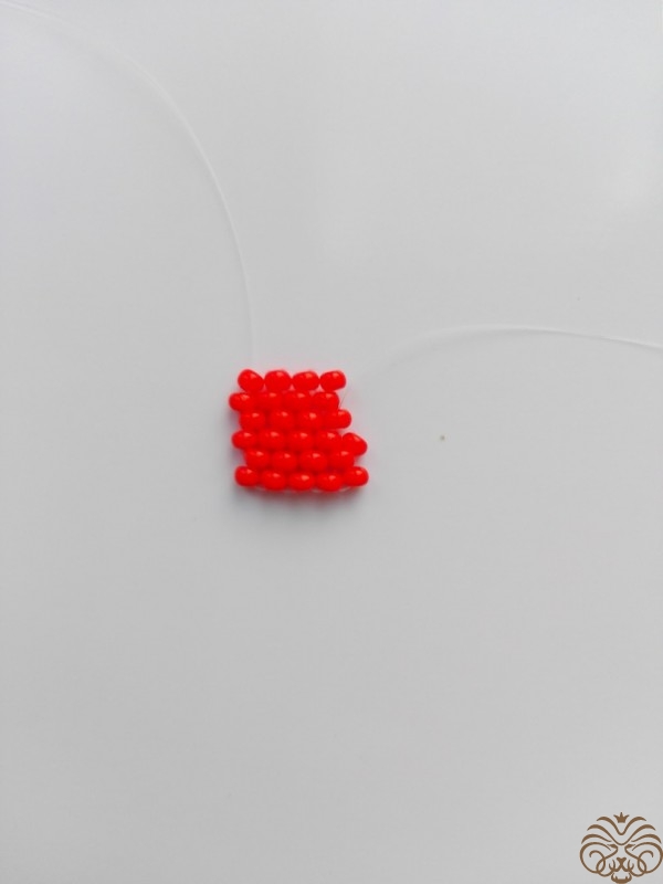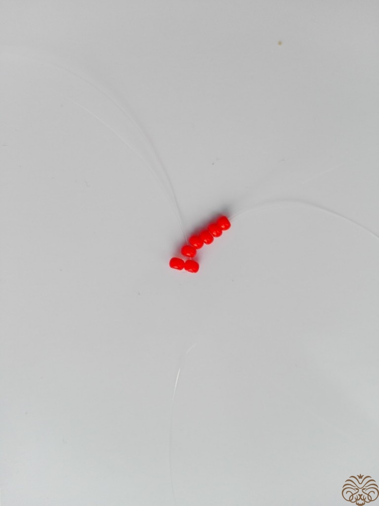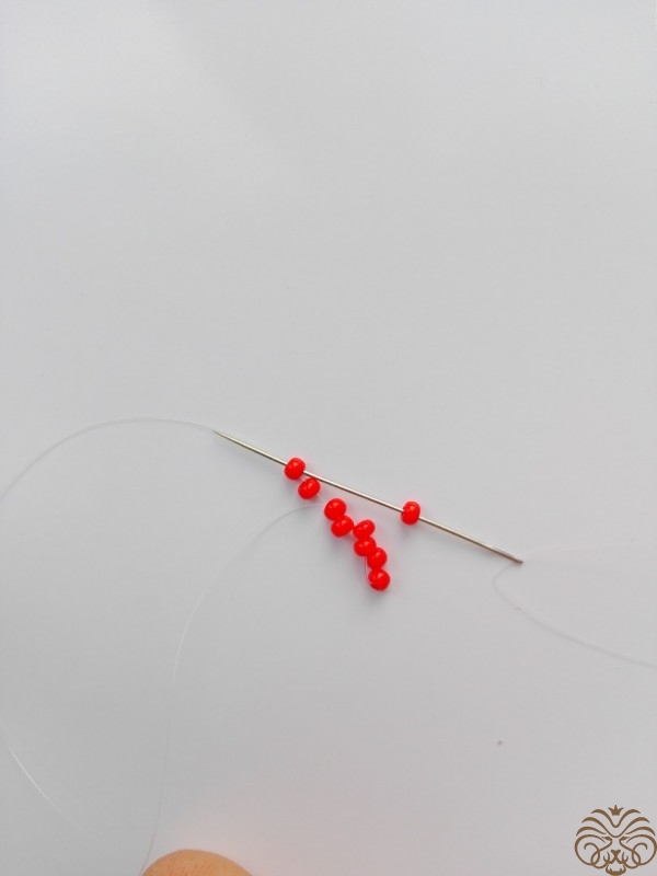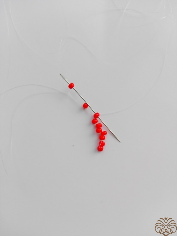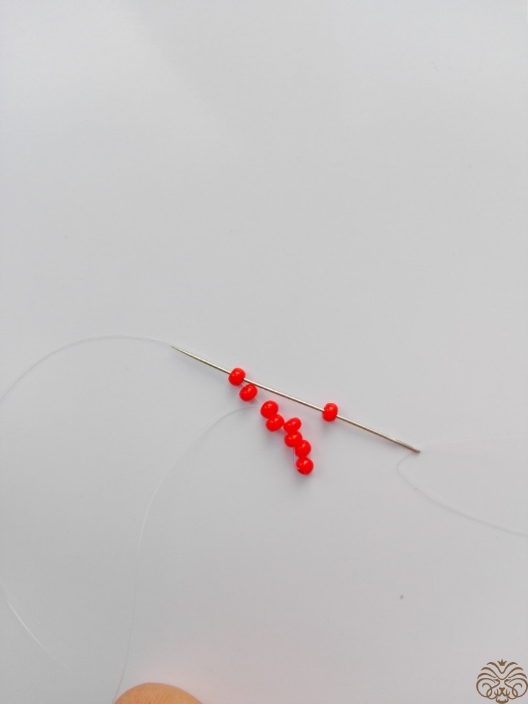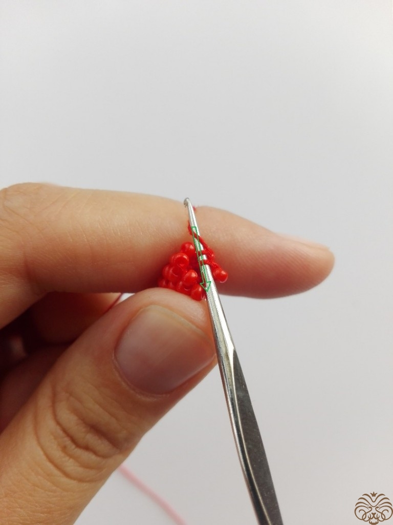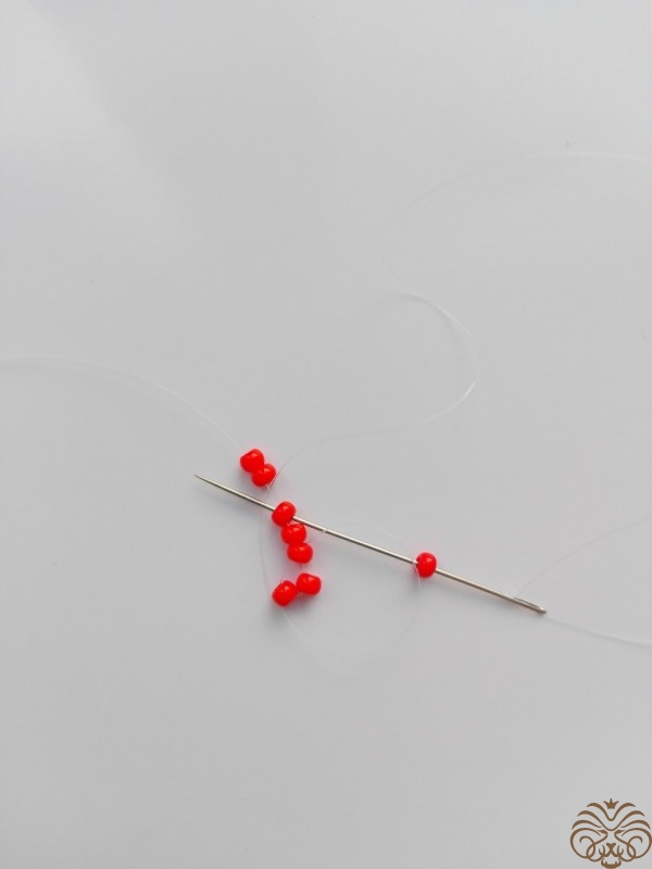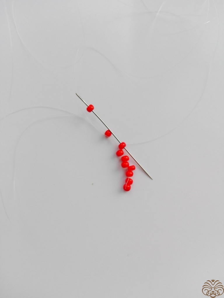 Лишний конец закрепляем. Для этого выходим из бисеринки, рядом с бисеринкой делаем петлю за нить и проходим в эту петлю иглой, затягивая узелок. Для надежности делаем подряд 4-5 узелков.