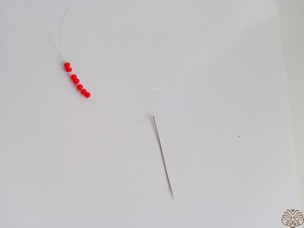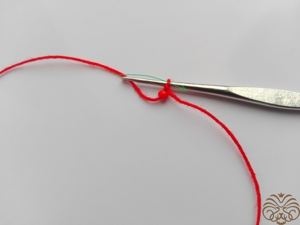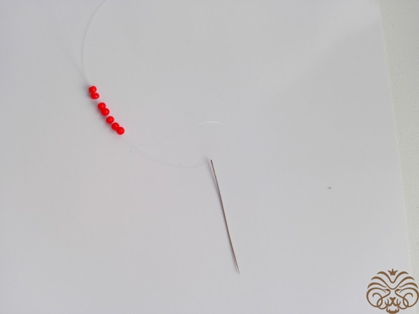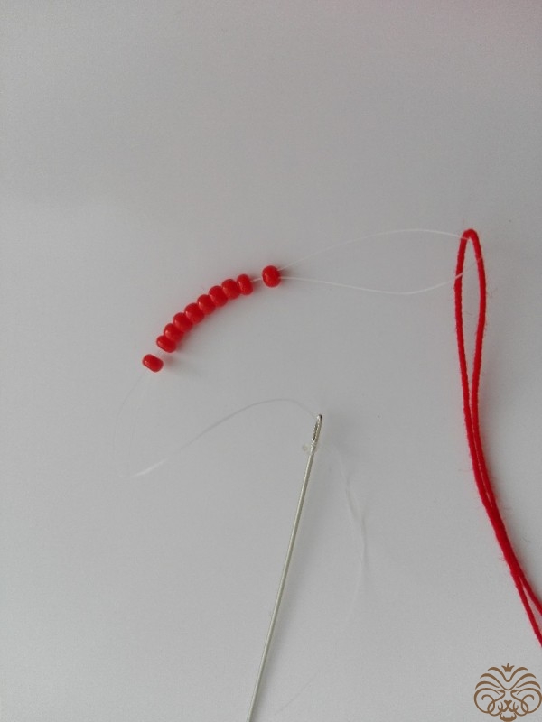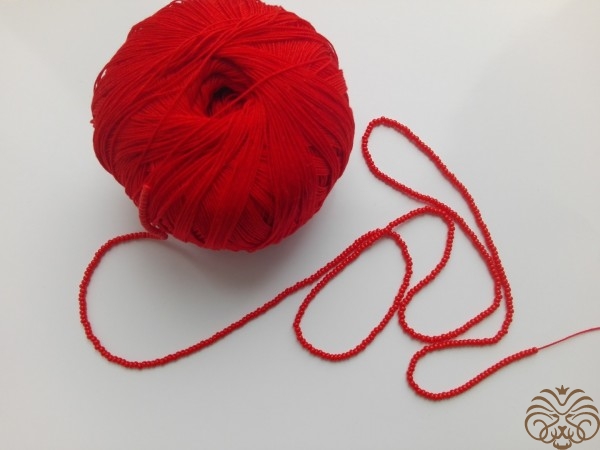 Для начала набираем на нить для вязания бисер. Если нить не проходит в ушко иголки, то делаем переходник: отрезаем небольшой кусочек мононити, продеваем оба конца в ушко, а в образовавшуюся петлю вдеваем конец нити для вязания. Набираем около 70 см бисера. Нить НЕ отрезаем от мотка. Завязываем скользящий узел., вдеваем крючок и затягиваем.