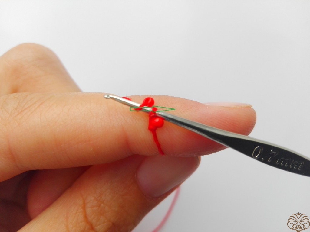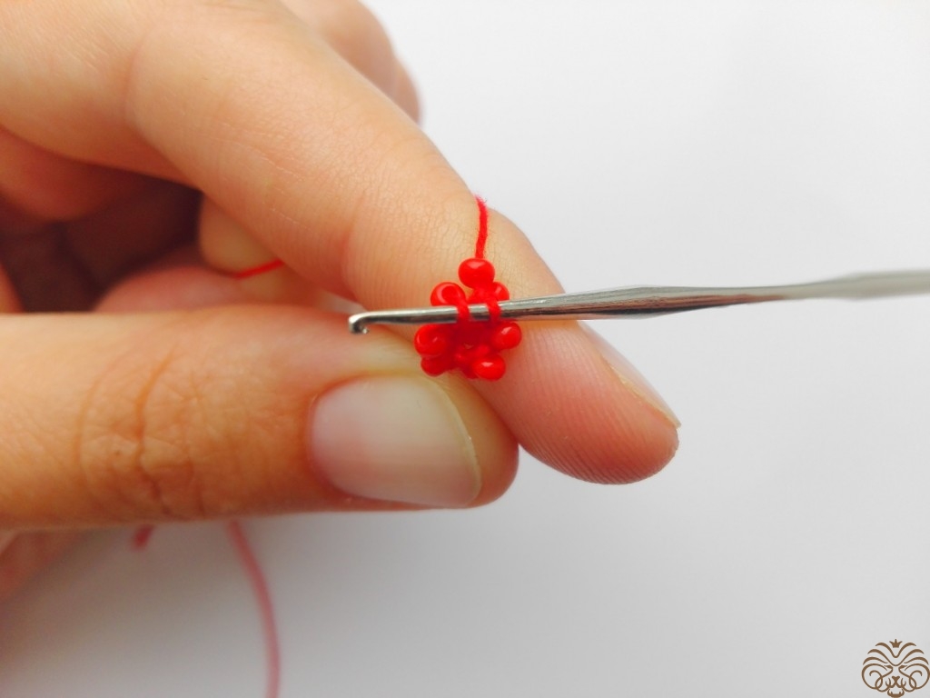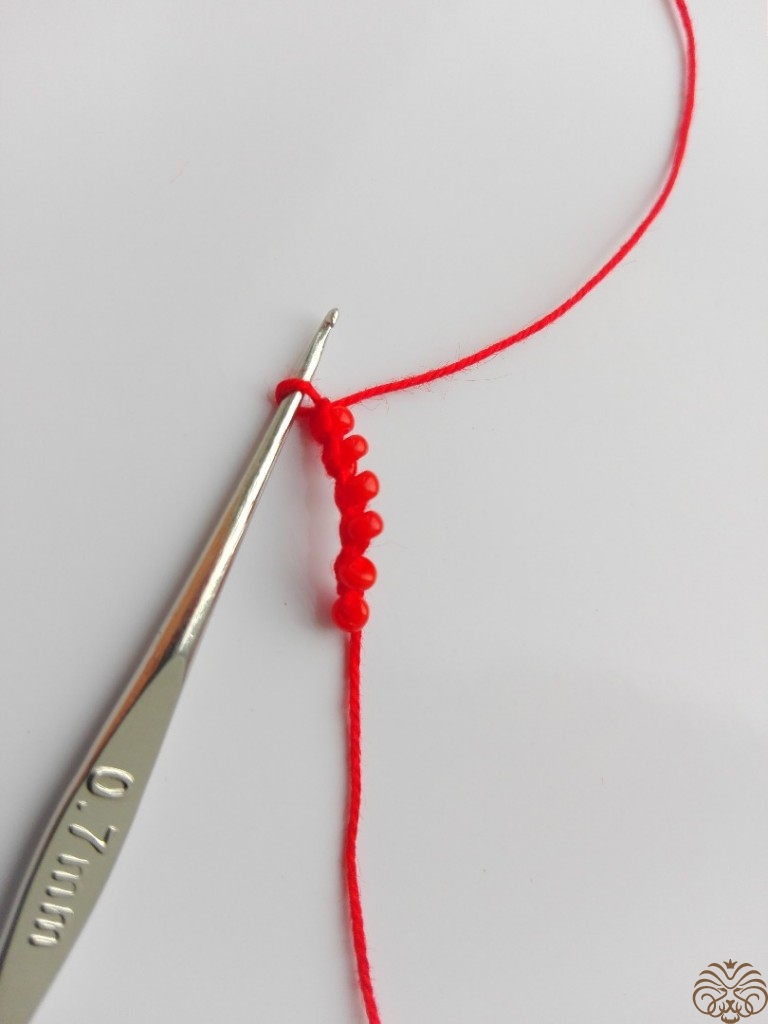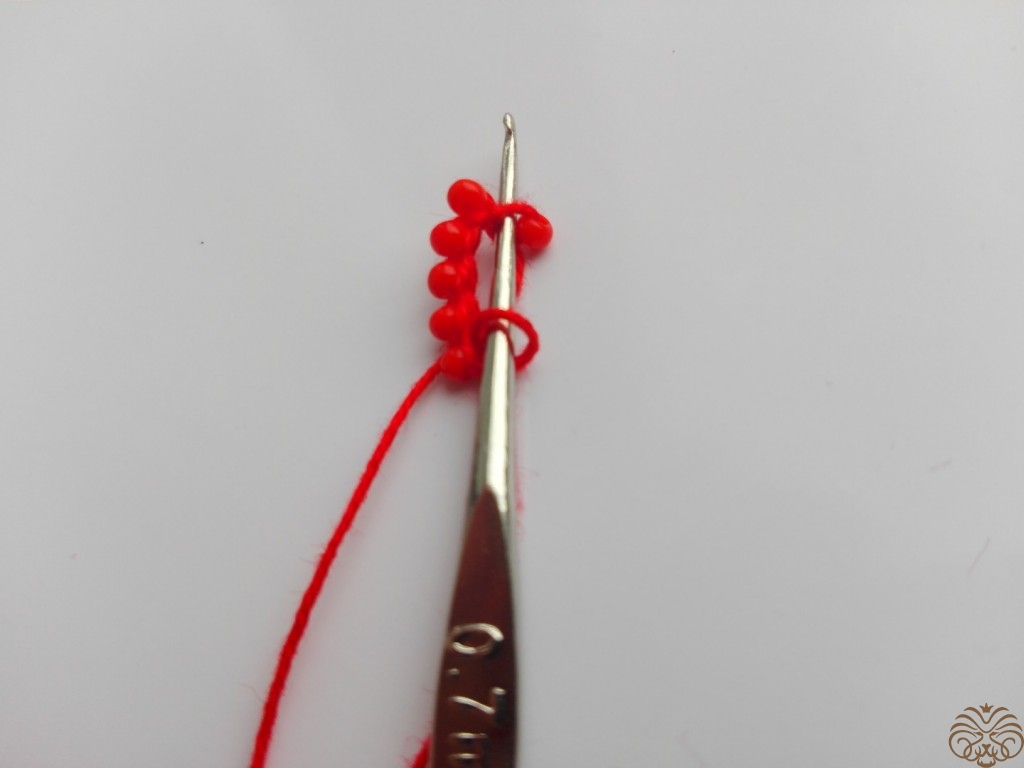 Замыкаем в кольцо. Вводим крючок под первую бисеринку и отодвигаем ее вправо от крючка. Придвигаем к вязанию одну бисеринку, цепляем крючком нить за ней и вытягиваем новую петлю через обе. Снова вводим крючок под петлю со второй провязанной бисеринкой, отодвигая ее вправо, придвигаем бисеринку и вытягиваем петлю через две петельки и т.д. провязывает бисеринки полустолбиком по спирали. На фото видно, что 6 бисеринок в ряду. Вяжем 11,5 см жгута.