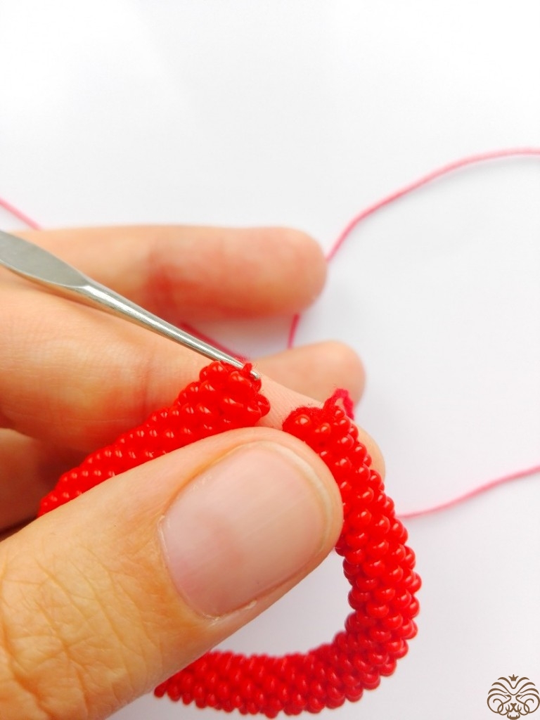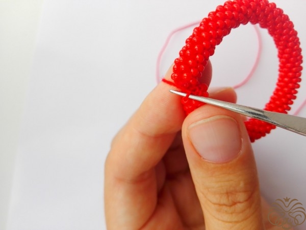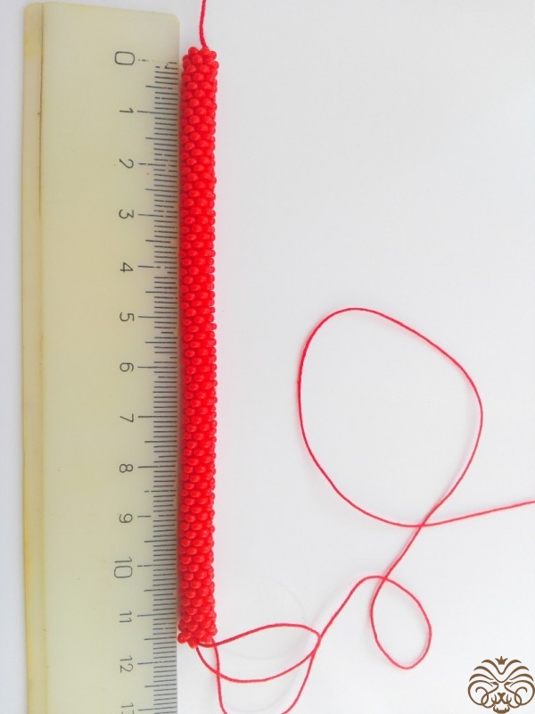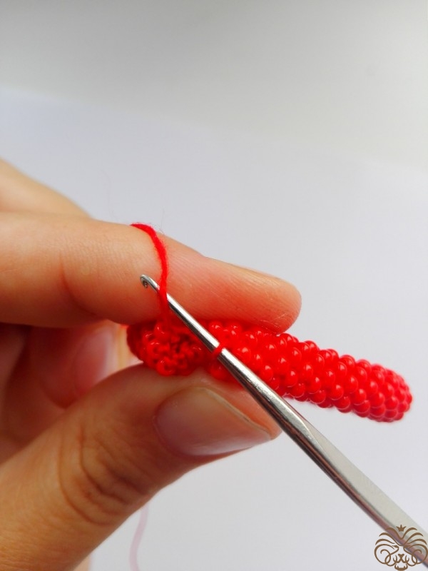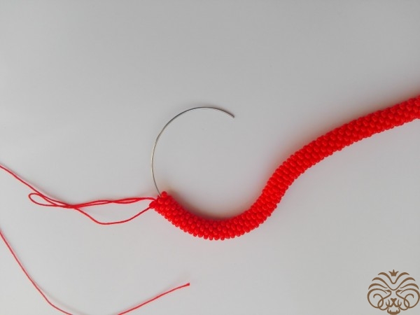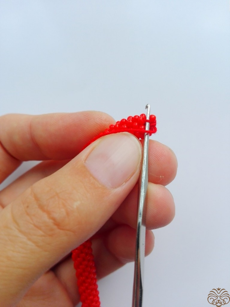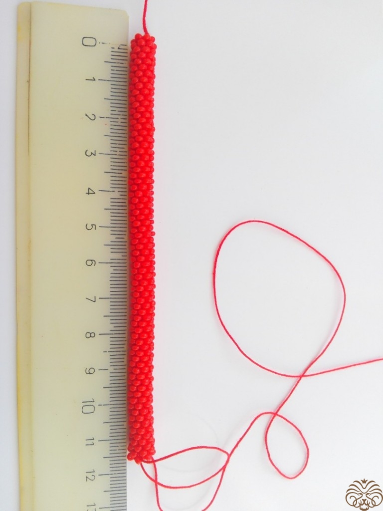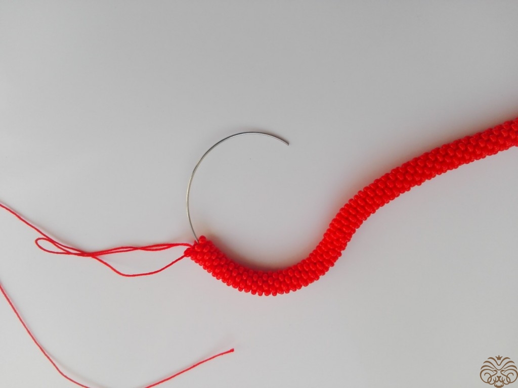 Провязываем ряд без бисера, чтобы правильно уложить последние бисеринки. Теперь обрезаем нить. В конце оставляем около 20 см и петлю вытягиваем, чтобы не распустить вязание. В начале жгута оставляет маленькие кончик нити и прячем его внутри жгута. Если вязание слишком слабое, то самый первый ряд с помощью иголки аккуратно распускаем.