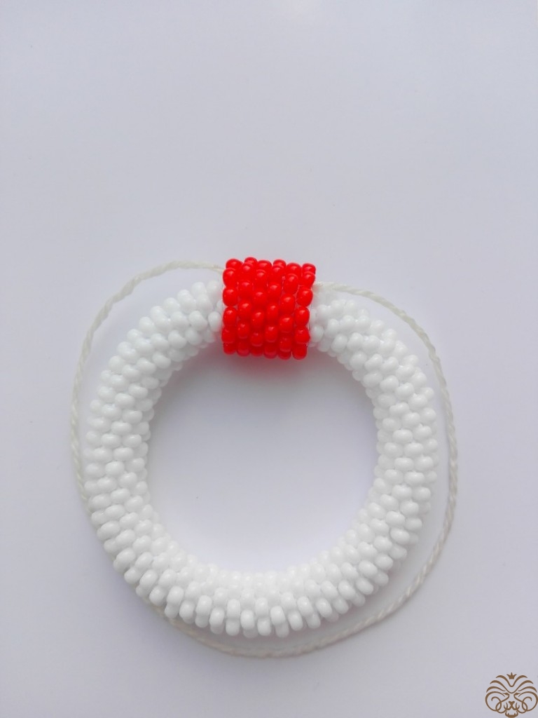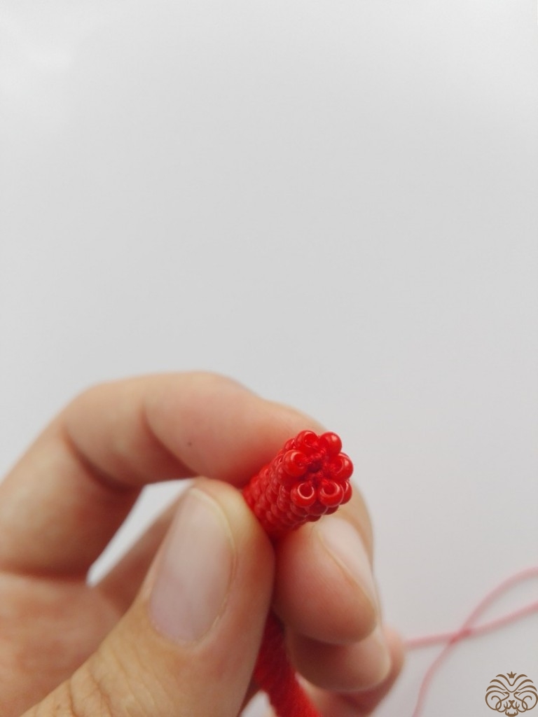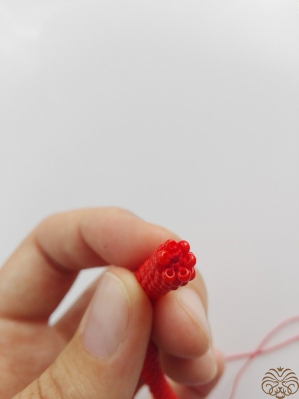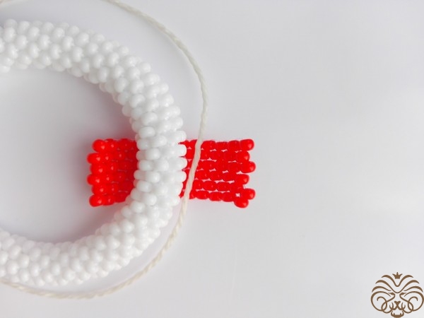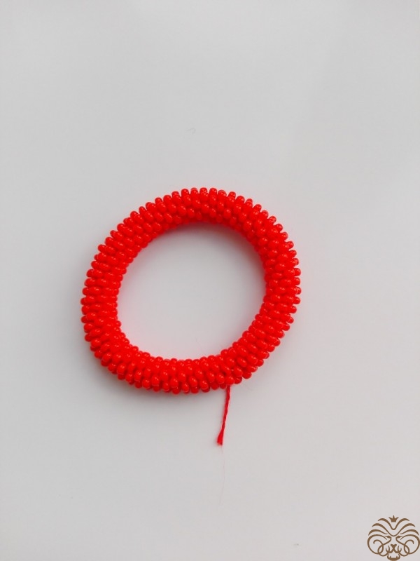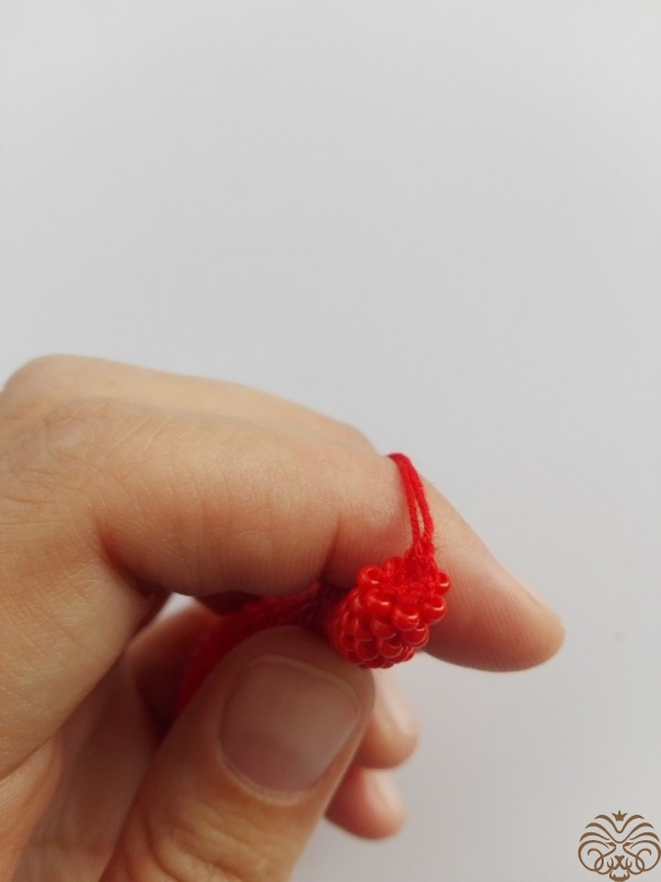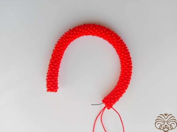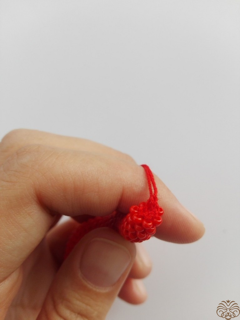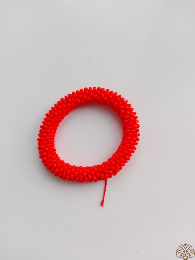 Провязываем ряд без бисера, чтобы правильно уложить последние бисеринки. Теперь обрезаем нить. В конце оставляем около 20 см и петлю вытягиваем, чтобы не распустить вязание. В начале жгута оставляет маленькие кончик нити и прячем его внутри жгута. Если вязание слишком слабое, то самый первый ряд с помощью иголки аккуратно распускаем.