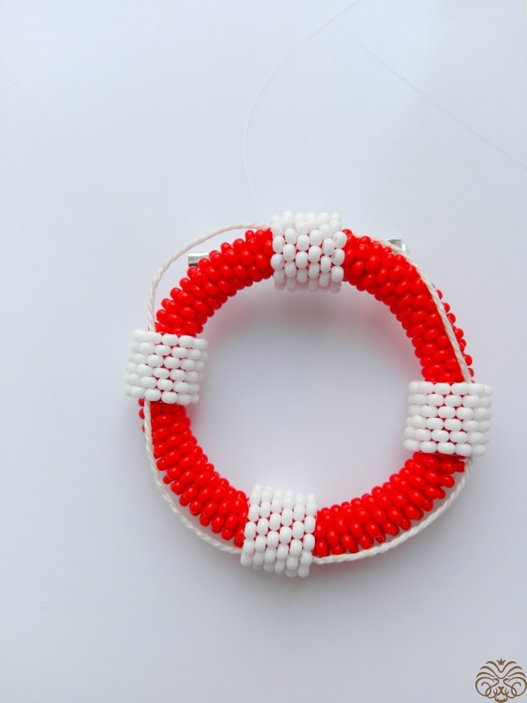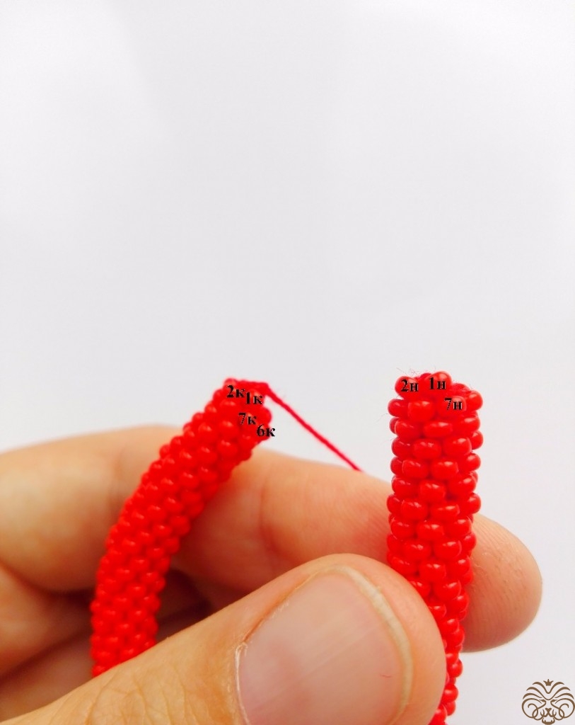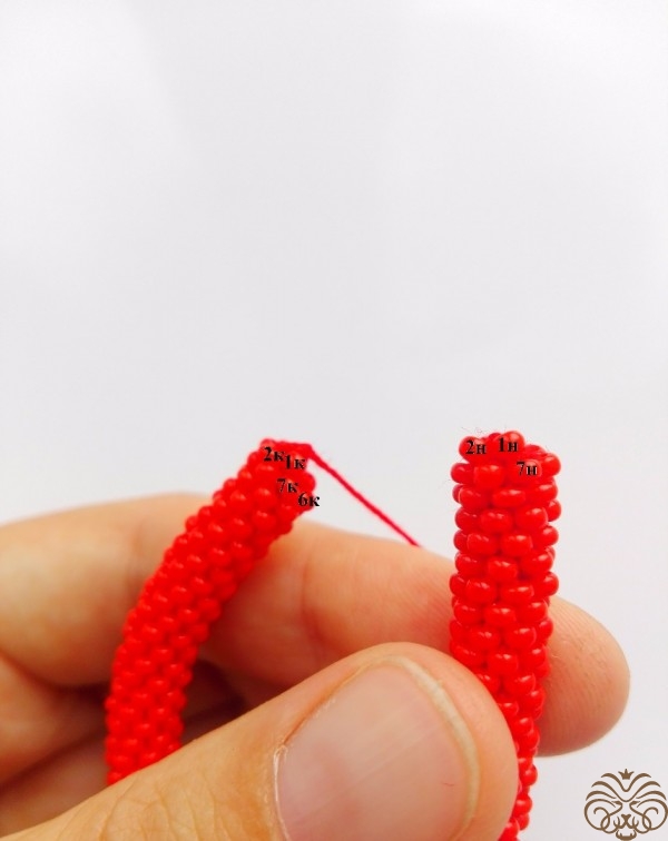 Обозначим бисеринки: 1н, 2н, ..., 7н в начале жгута, и 1к, 2к, ..., 7к в конце жгута. Бисеринки 1н и 1к - первая и последняя бисеринки жгута. С помощью иглы или крючка выводим нить через петлю нити, выходящей из бисеринки 7к (на нее частично накладывается бисеринка 1к). Сводим начало и конец жгута и выводим нить под петлей из бисеринки 1н. Далее переходим к петле из бисеринки 6к, затек к петле из бисеринки 2н и т.д. по кругу сшиваем жгут, заканчивая бисеринкой 7н. Закрепляем ниточку, отрезаем лишний конец и прячем его в жгуте.
