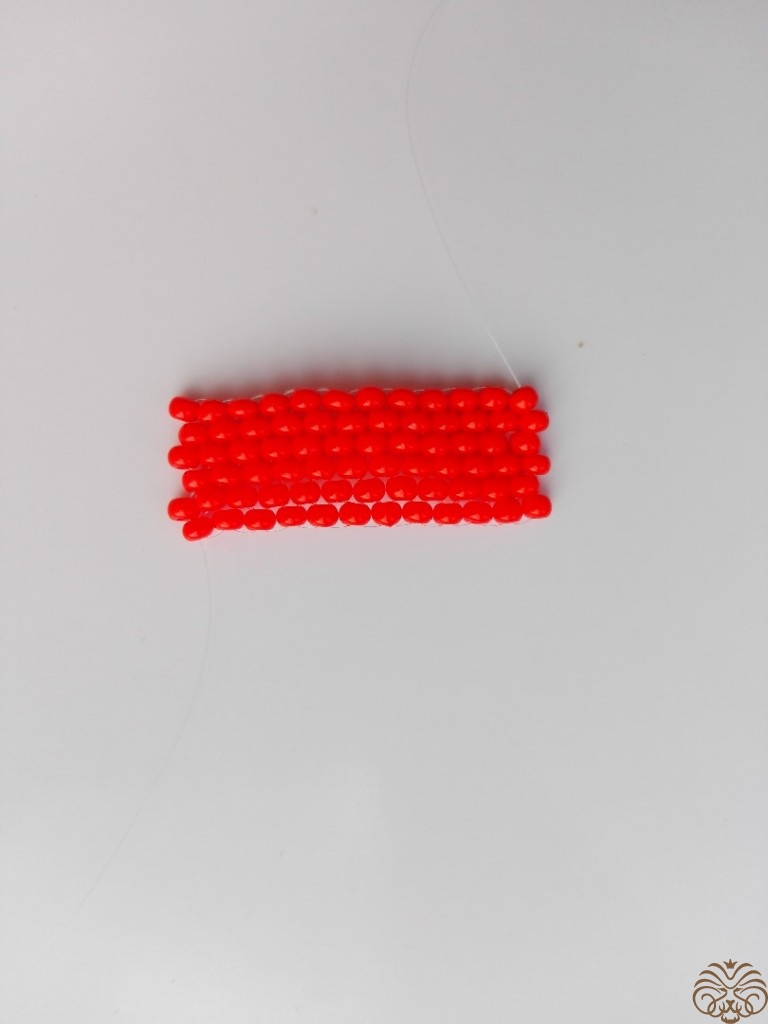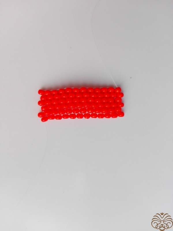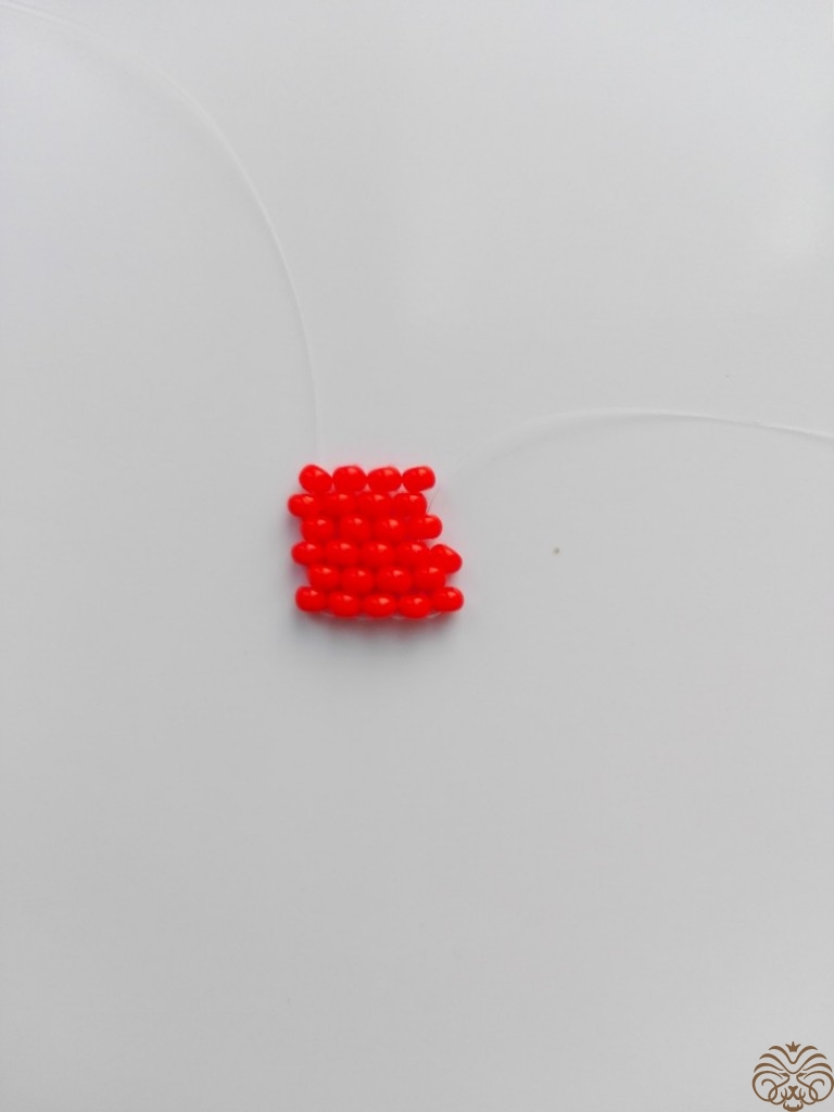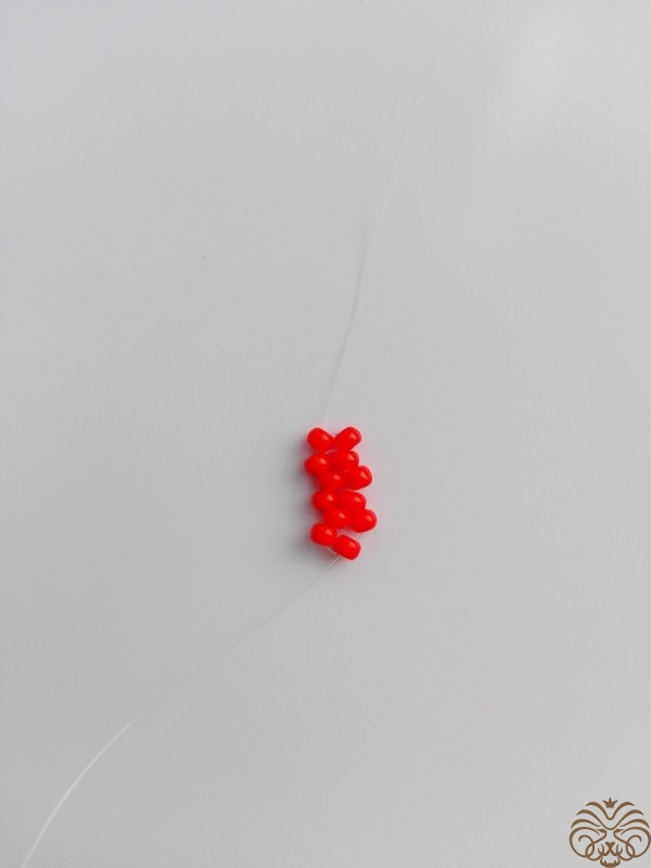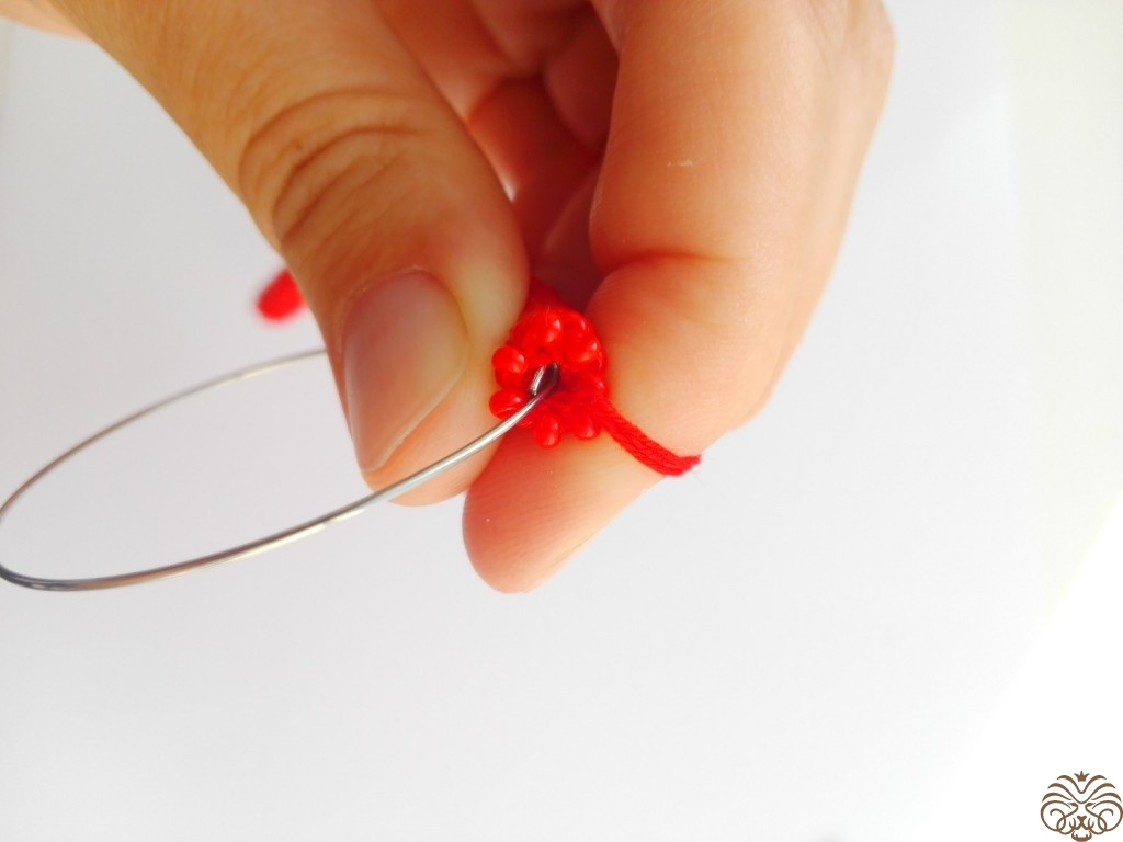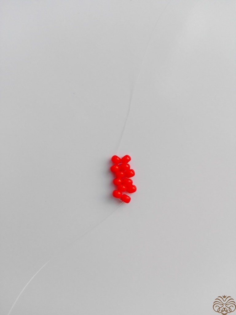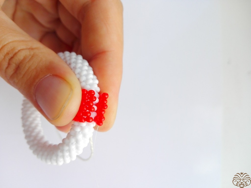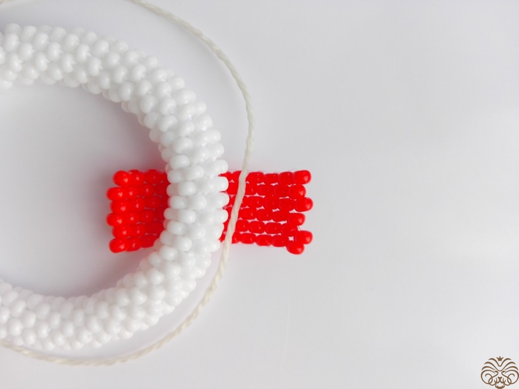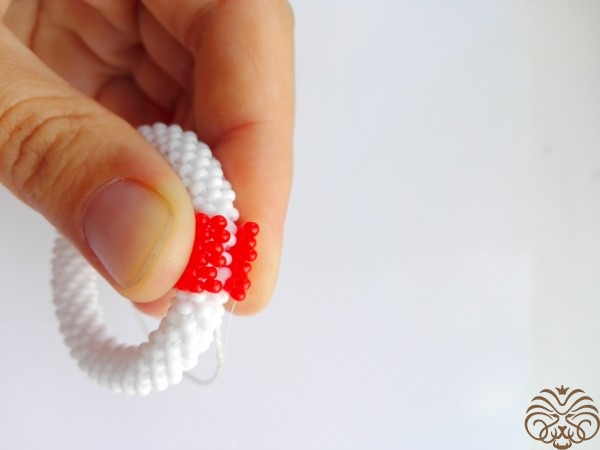Плетем вставки. На мононить набираем 7 бисеринок второго цвета, отличного от кольца. Для мастер-класса взяла красный бисер, чтобы было лучше видно. Проходим через пятую бисеринку в обратном направлении и затягиваем. Набираем одну (восьмую) бисеринку и проходим через третью бисеринку в обратном направлении. Набираем еще одну (девятую) бисеринку и проходим через первую. Плетем мозаикой: набираем бисеринку и проходим через девятую, снова набираем бисеринку и через восьмую, одна бисеринка и через седьмую. Разворачиваемся и продолжаем плести, набирая по одной бисеринке и проходя через ближайшую выступающую. Плетем столько рядов, чтобы можно было соединить концы вокруг кольца из бисера.