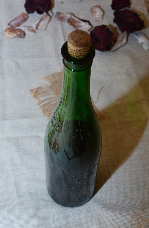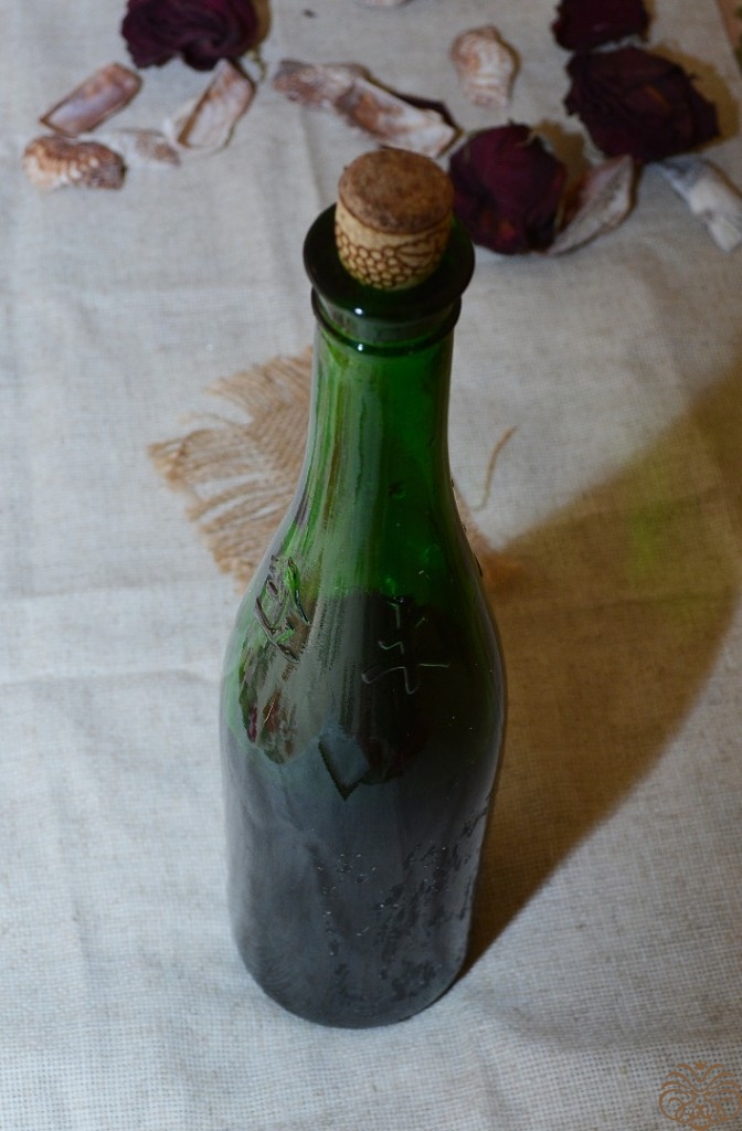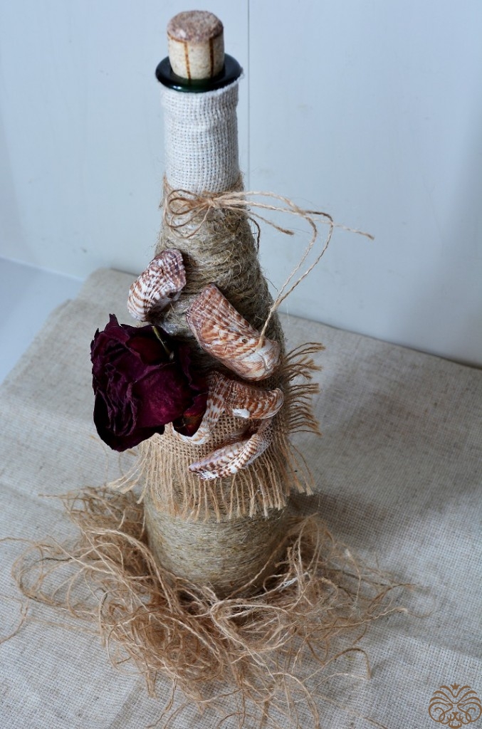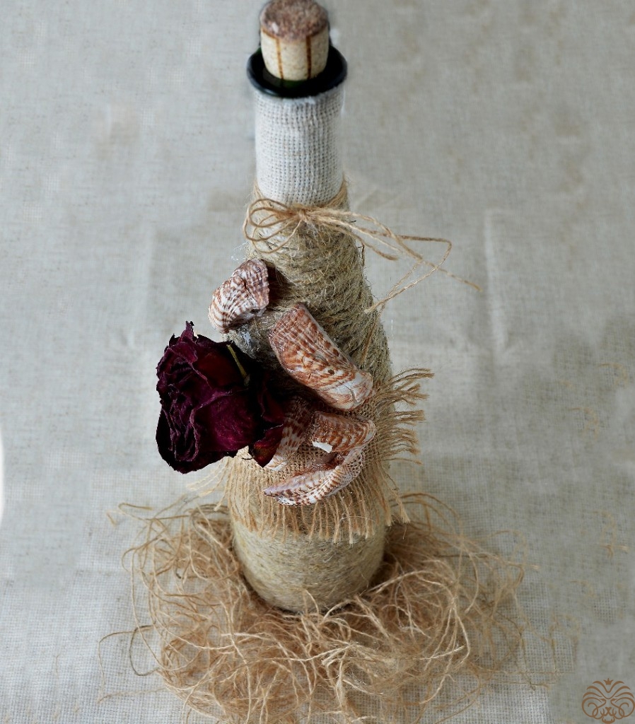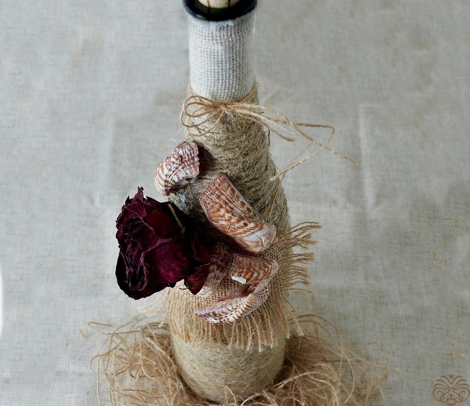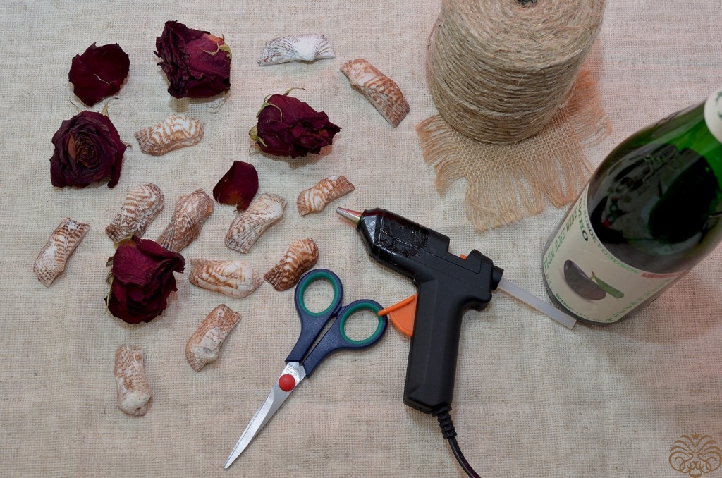 Возьмем пустую стеклянную бутылочку любой формы. Кстати, не обязательно пустую, у меня в бутылке еще есть вино-это никак не помешает, может даже наоборот-поможет))). Так же берем шпагат, мешковину, ракушки и сухие лепестки роз, ножницы и клеевой пистолет. Все приготовили-поехали...