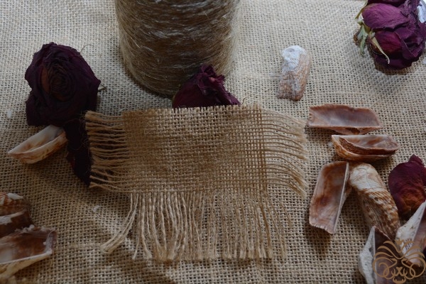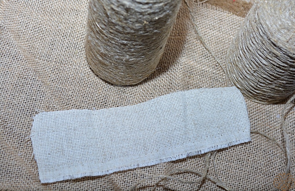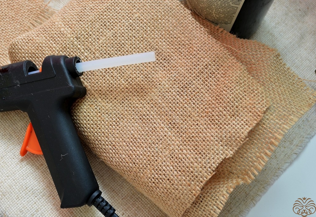 Нам понадобится еще один кусочек мешковины, только она немного грубее,чем та, которую мы приклеивали на горлышко.