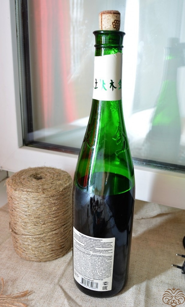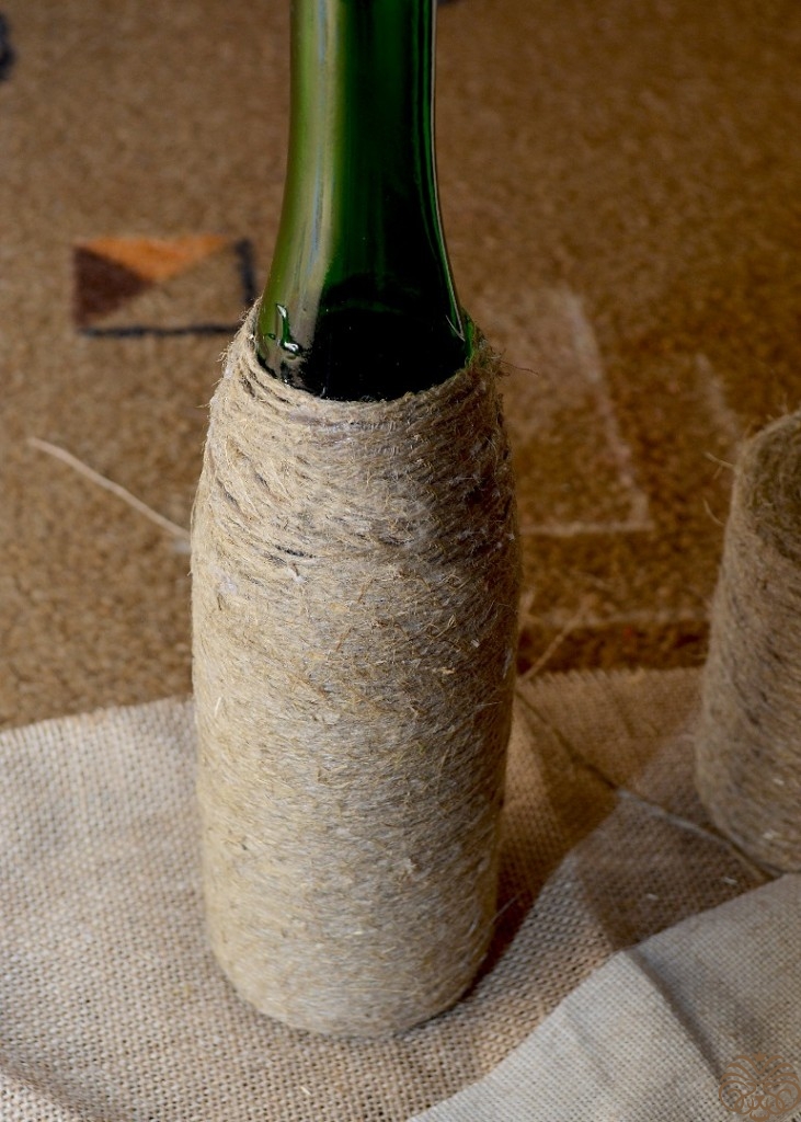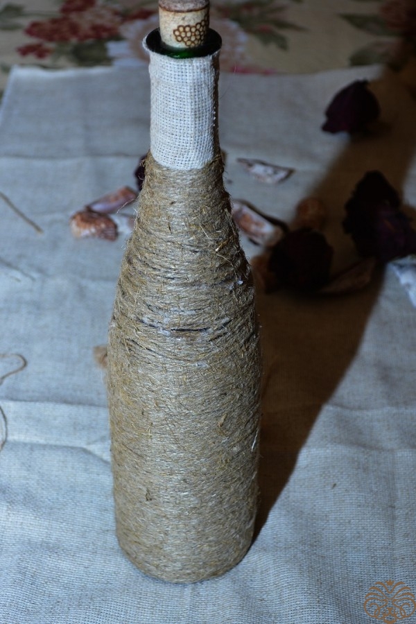 Если у вас где-то местами бутылка просвечивается-это не страшно, а вообще желательно наматывать очень плотно. Там, где бутылка идет на сужение-мотать сложнее, поэтому некоторые ряды я подклеивала клеем.