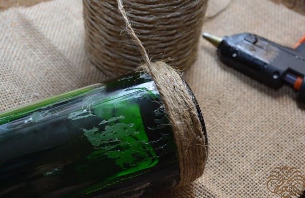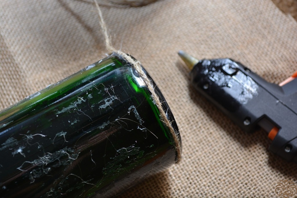 Нагреваем пистолет с клеем и начинаем приклеивать шпагат со дна бутылки. Обматываем всю бутылочку до горлышка шпагатом по кругу.