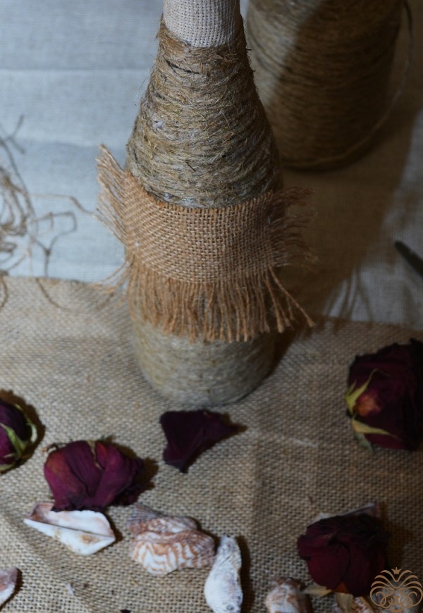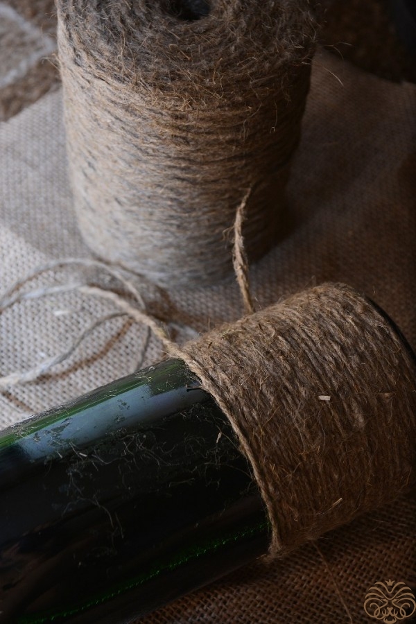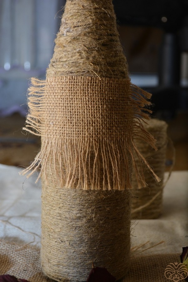 И так, отрезаем маленький кусочек мешковины и приклеиваем на горлышко бутылочки, далее проматываем шпагатом до края мешковины. Самое главное мы сделали. Сейчас осталось украсить бутылку и звать гостей  на "загадочное" вино)))