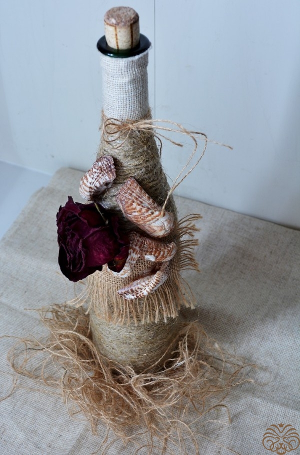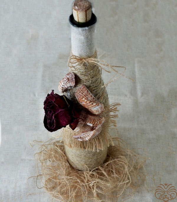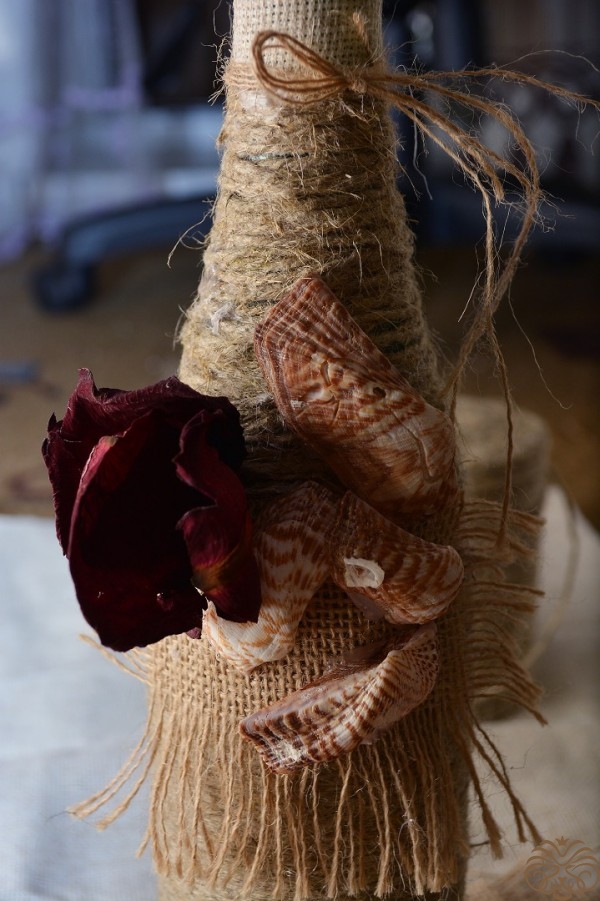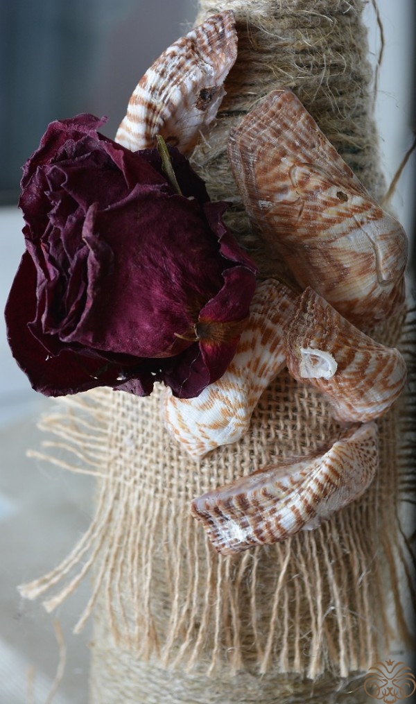 Осталось дело за малым-наклеить ракушки и лепестки сухих роз, повязать тоненький бантик на горлышко....и все.