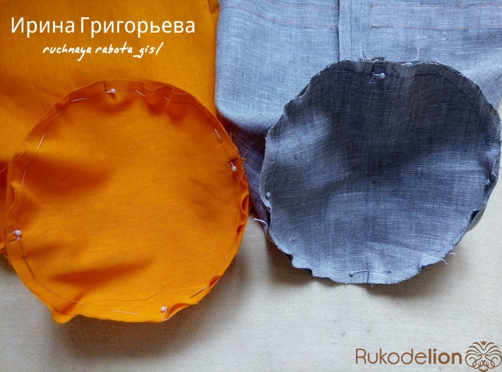 Шаг6. Приложите детали дна к стенкам переда и подклада лицевыми сторонами друг к другу, совмещая метки, и приколите булавками, прошейте.
