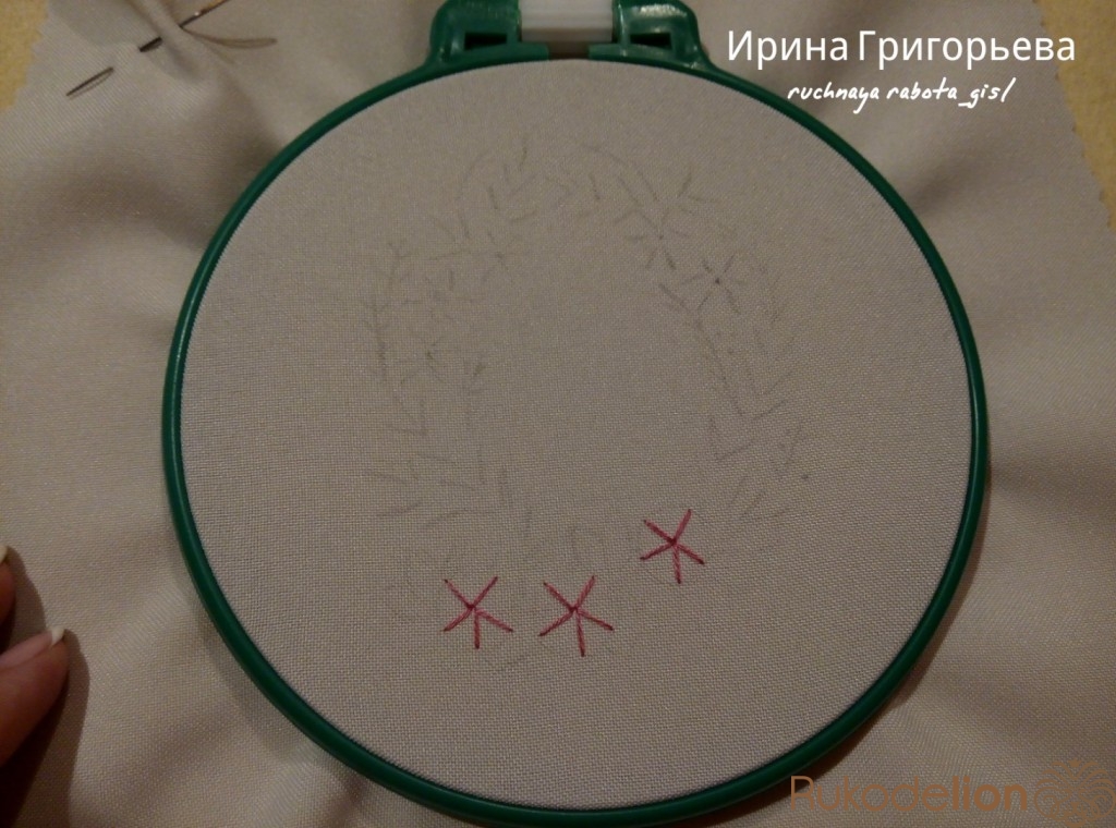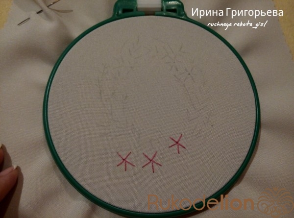 Натяните ткань на пяльца, сделайте контур будущей вышивки нарисовав овал, на котором в дальнейшем будут располагаться вышитые элементы.