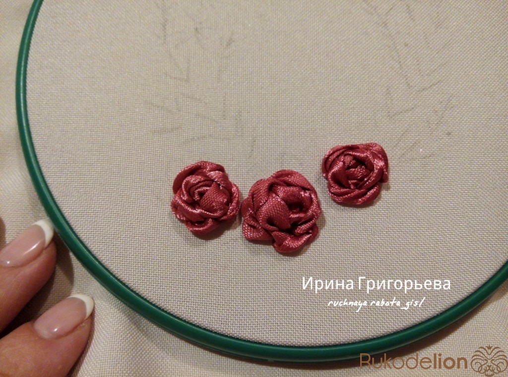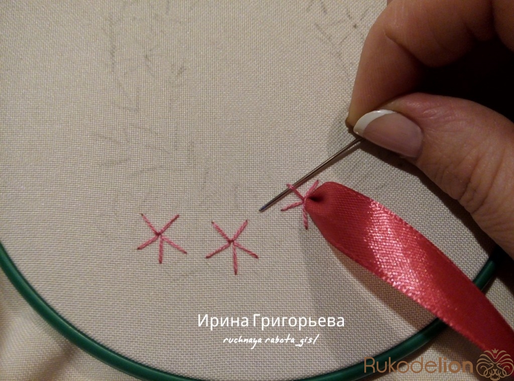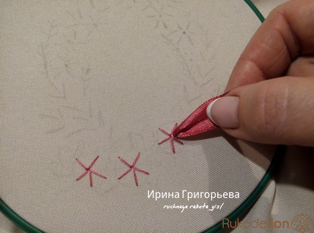 Сделайте нитью 5 прямых лучеобразных стежков - это будет каркас для розы. Выведите рядом с центром ленту розового цвета ш12мм. Выполняйте переплетение против часовой стрелки над и под стежками. Сделайте несколько кругов. Когда образуется цветок и все нити каркаса будут закрыты, выведите иглу с лентой на изнаночную сторону. Так вышейте ещё две розочки.