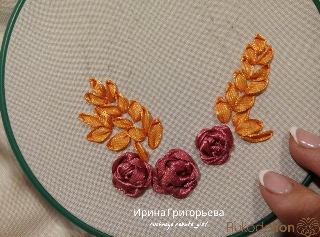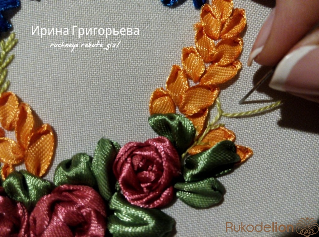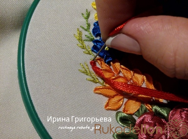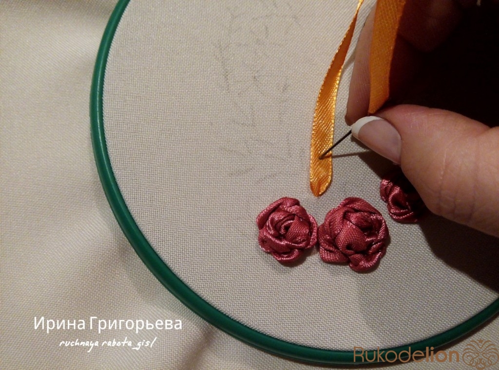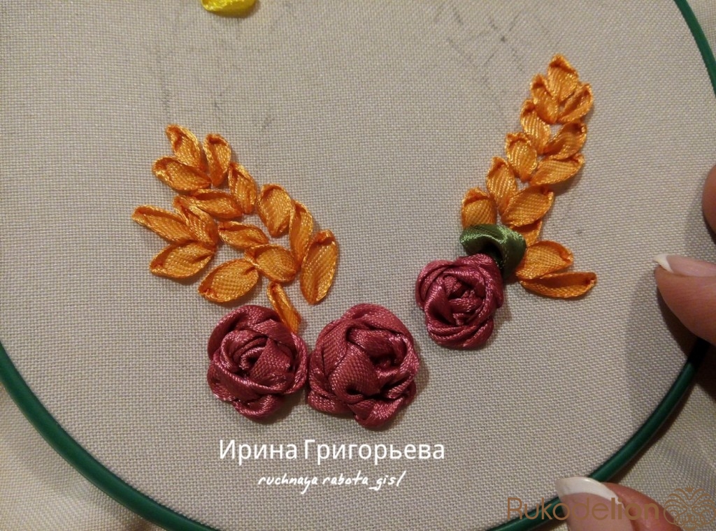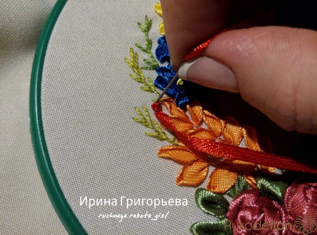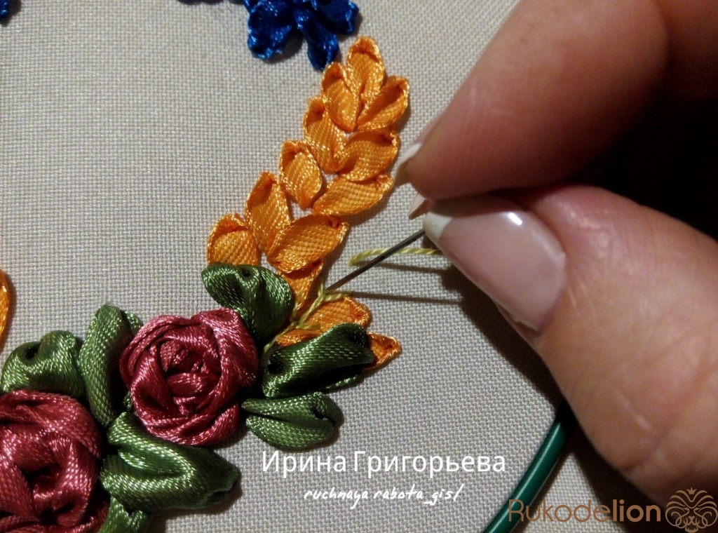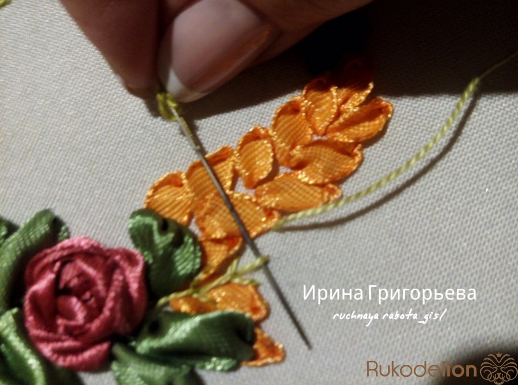 Выведите оранжевую ленту ш6мм наружу, уложите её в нужном направлении, проколите ленту иглой и уведите ленту на изнанку. Затягивайте ленту постепенно, пока на её конце не образуется острый уголок (прямой стежок с завитком). Так вышейте все листья оранжевой и жёлтой лентами.