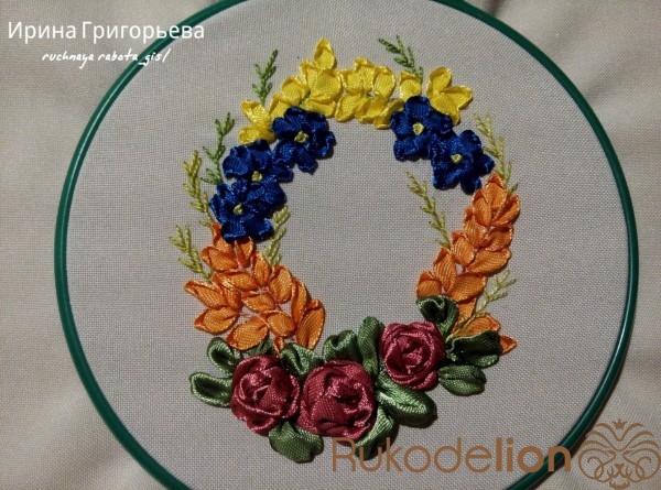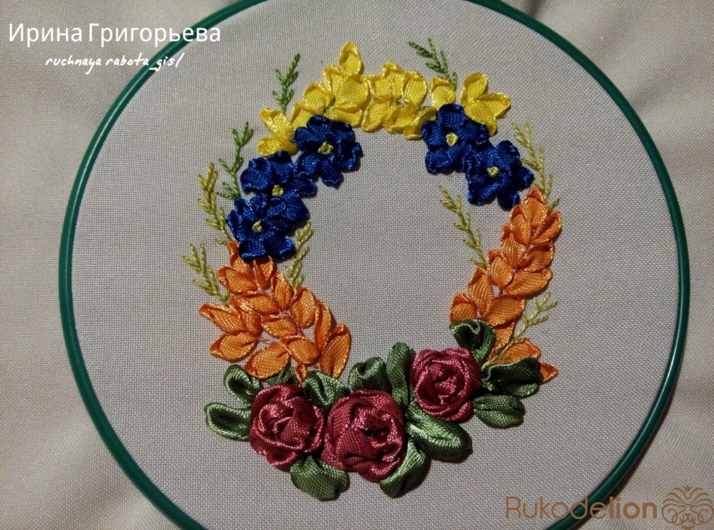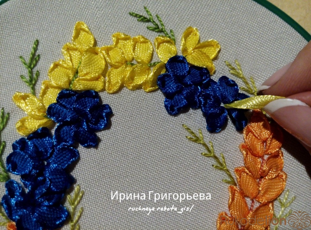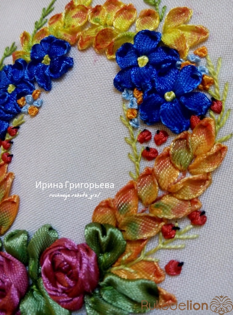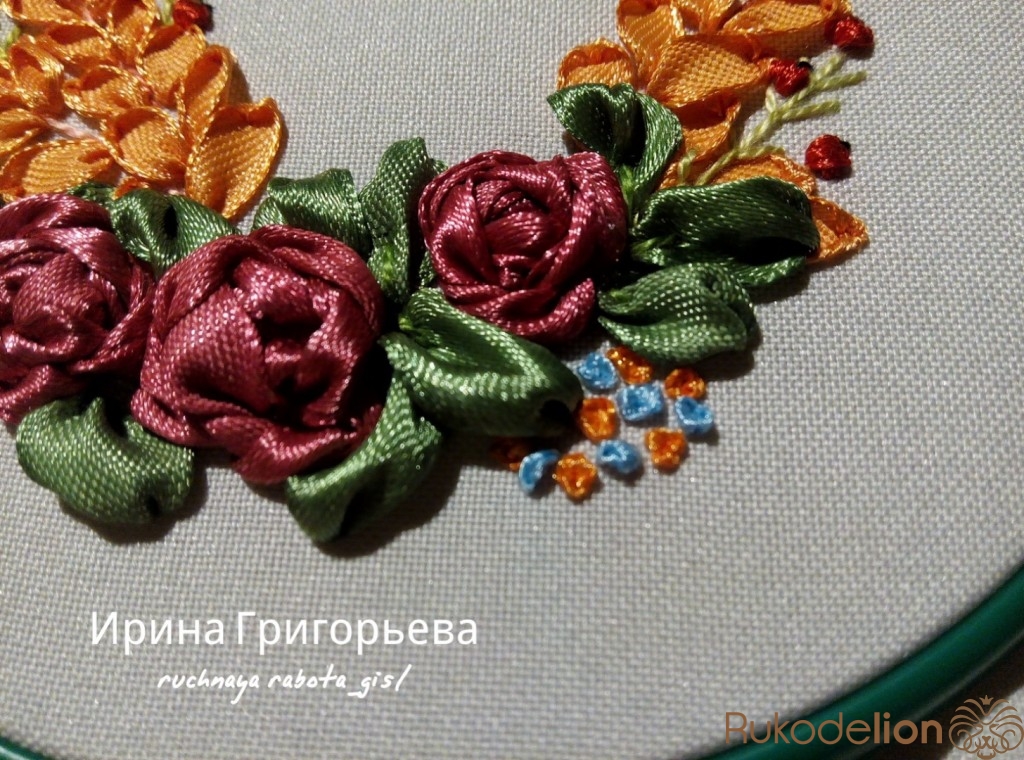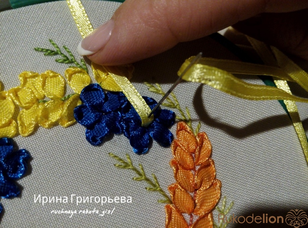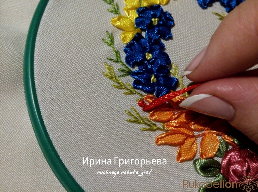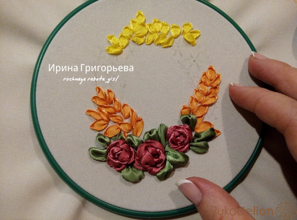 Выведите оранжевую ленту ш6мм наружу, уложите её в нужном направлении, проколите ленту иглой и уведите ленту на изнанку. Затягивайте ленту постепенно, пока на её конце не образуется острый уголок (прямой стежок с завитком). Так вышейте все листья оранжевой и жёлтой лентами.