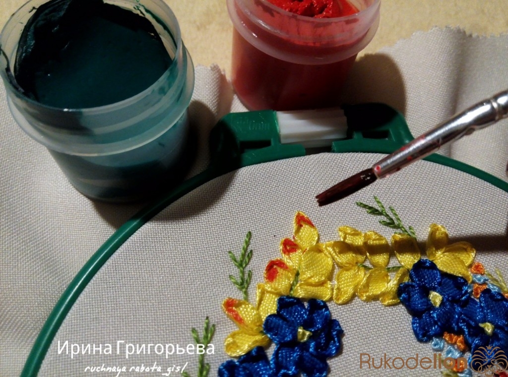 Нитками "Ирис" зелёного и светло-зелёного цветов вышейте травку швом "полупетля" - выполните первый стежок как для шва "вперёд иголку", выведите иглу на лицевую сторону ткани на расстоянии 3-4мм слева от стежка, проведите иглу под стежком и введите в ткань справа от стежка, и т.д.