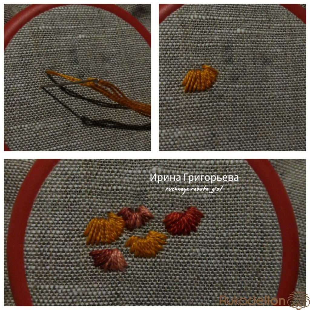 Отметьте карандашом основания цветов. Сделайте у каждого основания несколько прямых стежков нитью в два сложения (жёлтыми и рыжими оттенками). Сначала протяните иглу с нитью на лицевую сторону, выполните стежок нужной длины и выведите иглу на изнаночную сторону.