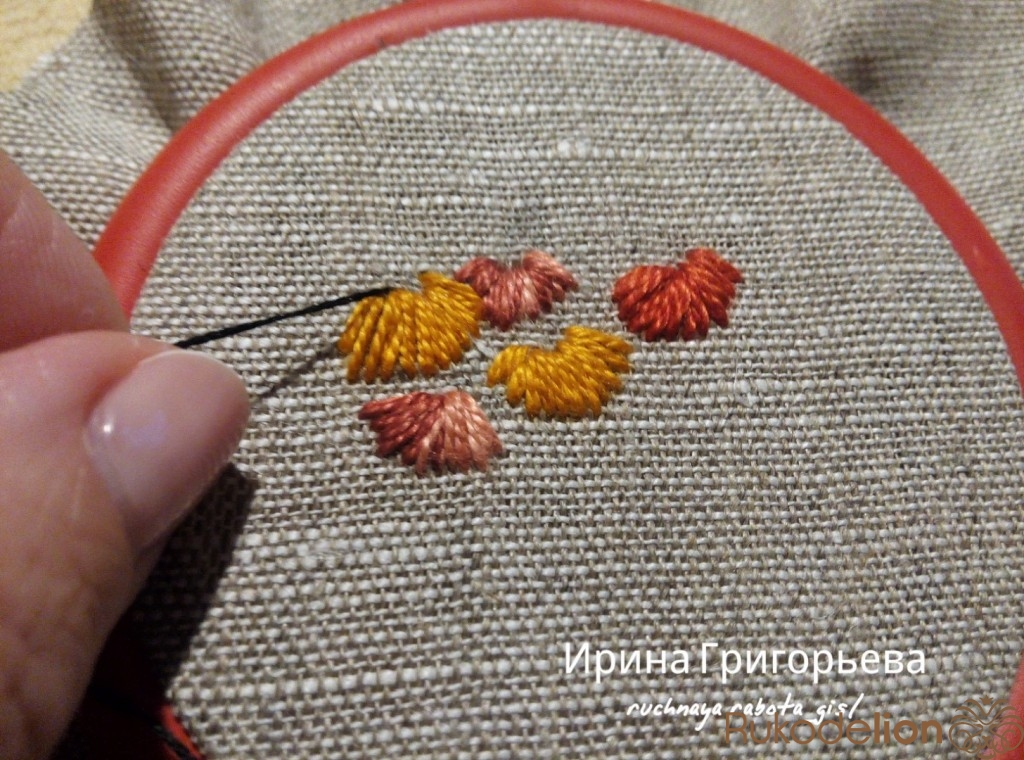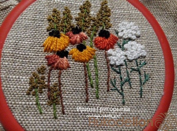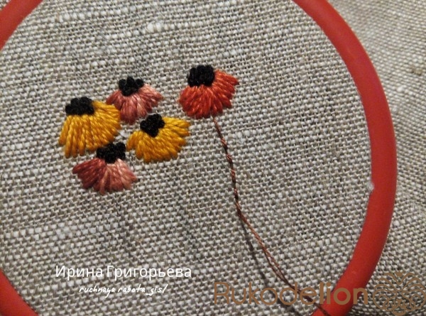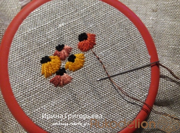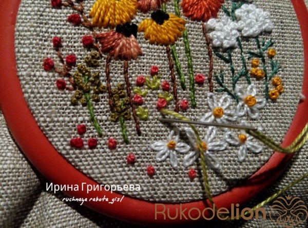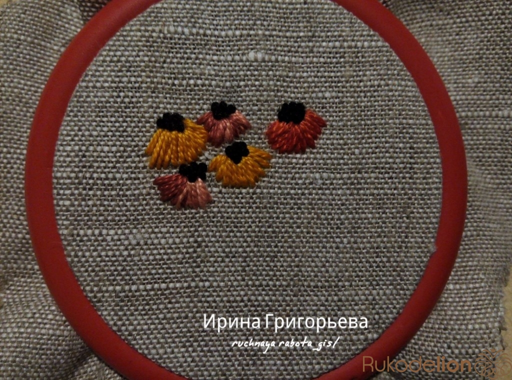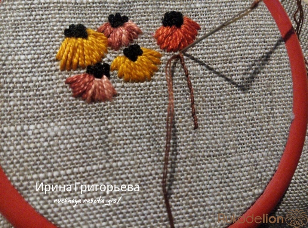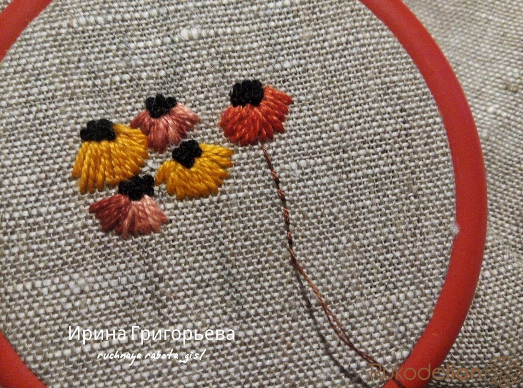 Вышейте ягодки французскими узелками нитью красного цвета справа от цветов. Стебли веточек вышейте нитью коричневого цвета швом "вперёд иголку".