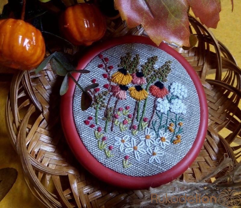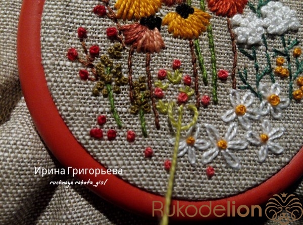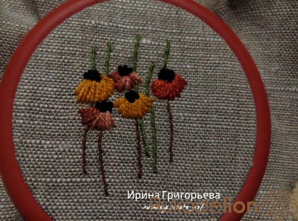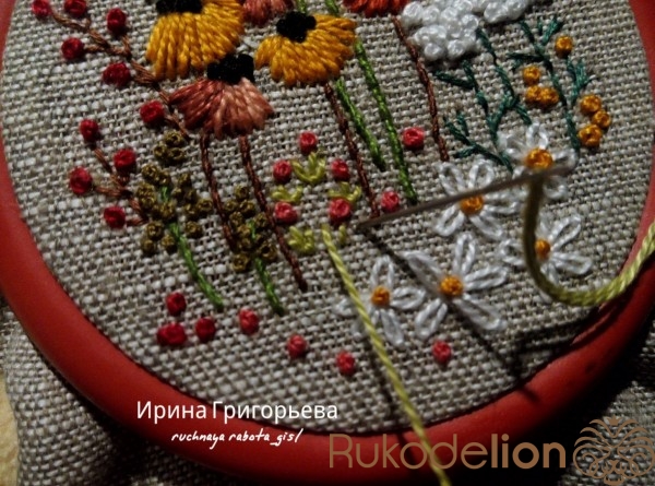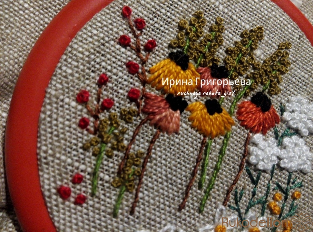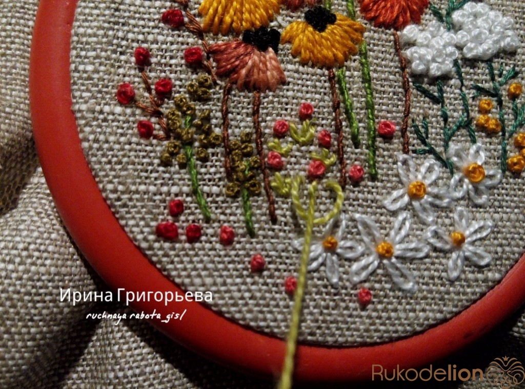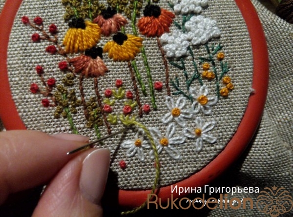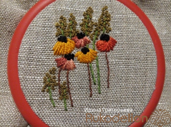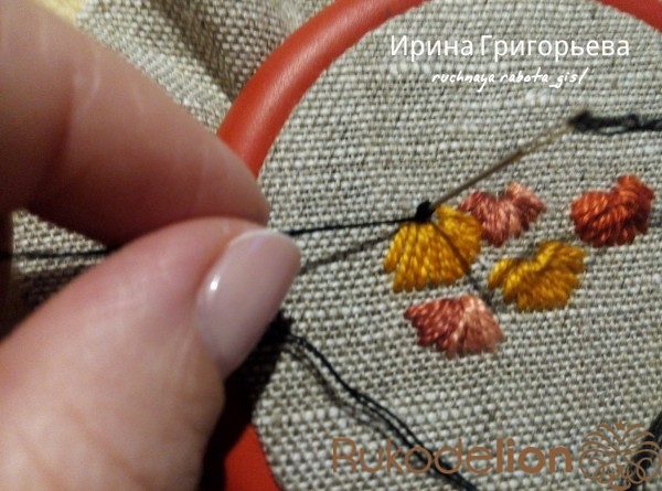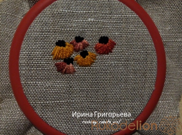 Вышейте ягодки французскими узелками нитью красного цвета справа от цветов. Стебли веточек вышейте нитью коричневого цвета швом "вперёд иголку".